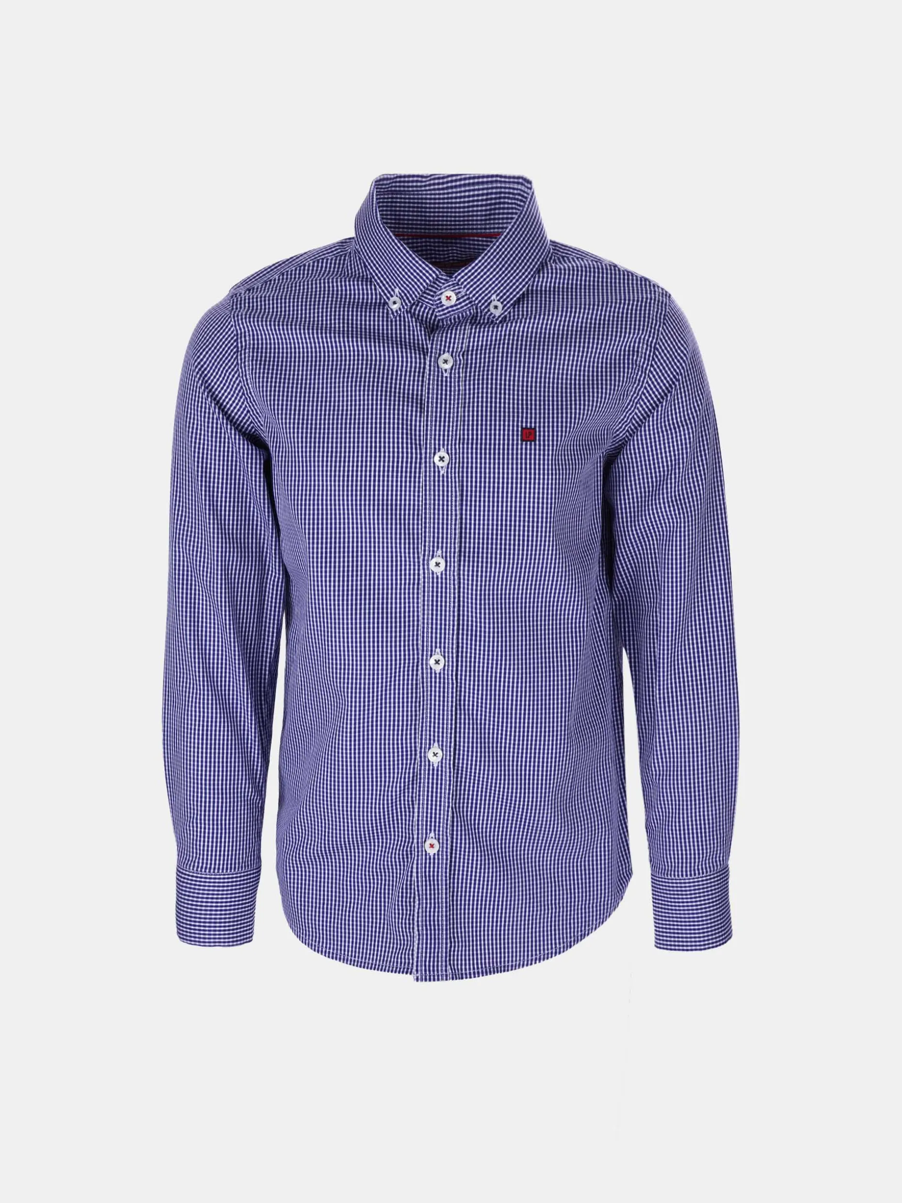 Camisa manga comprida em xadrez com etiqueta LP bordada a toda a volta no peito. Detalhe da fita de riscas atrás da gola.