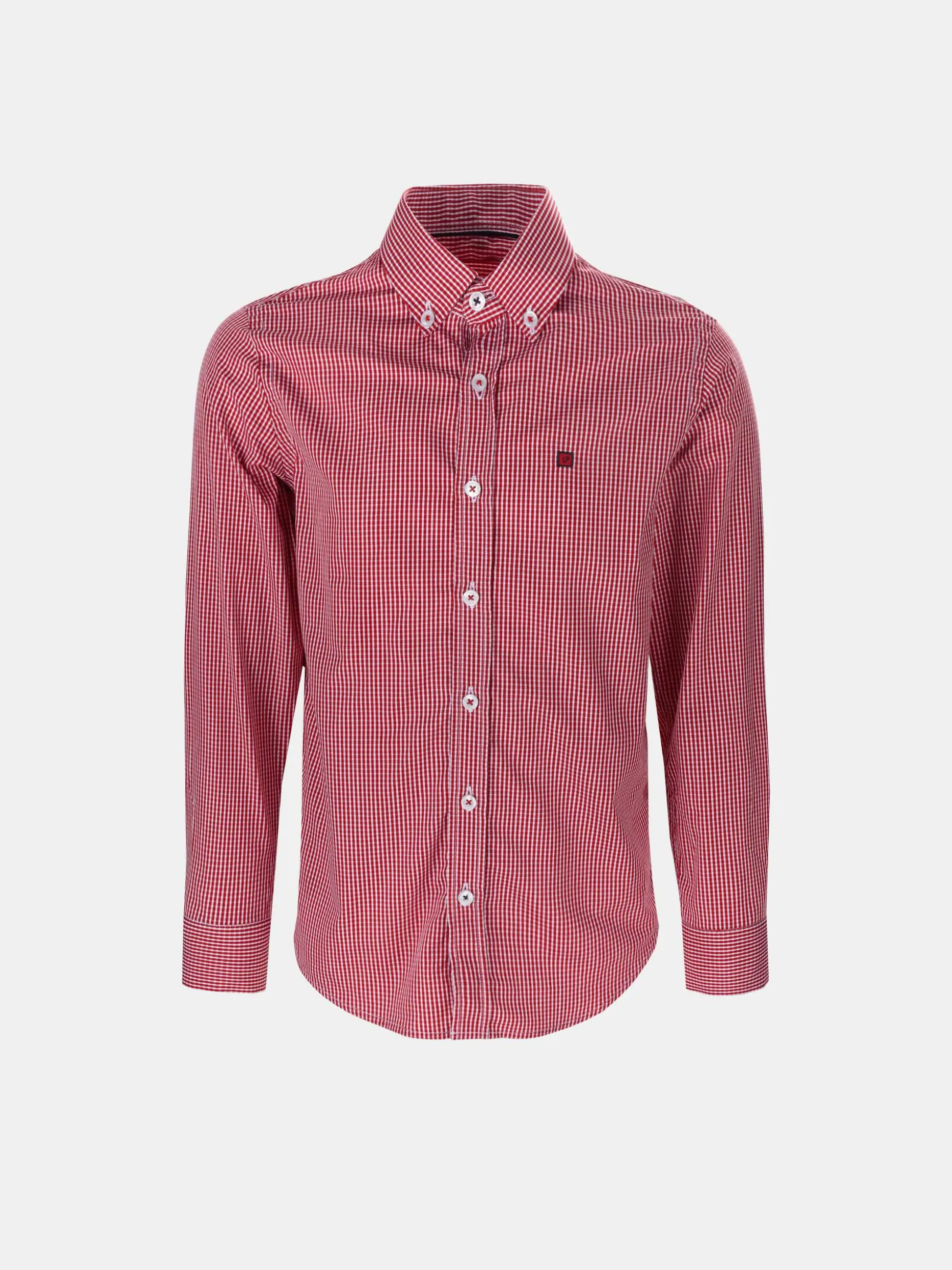 Camisa manga comprida em xadrez com etiqueta LP bordada a toda a volta no peito. Detalhe da fita de riscas atrás da gola.