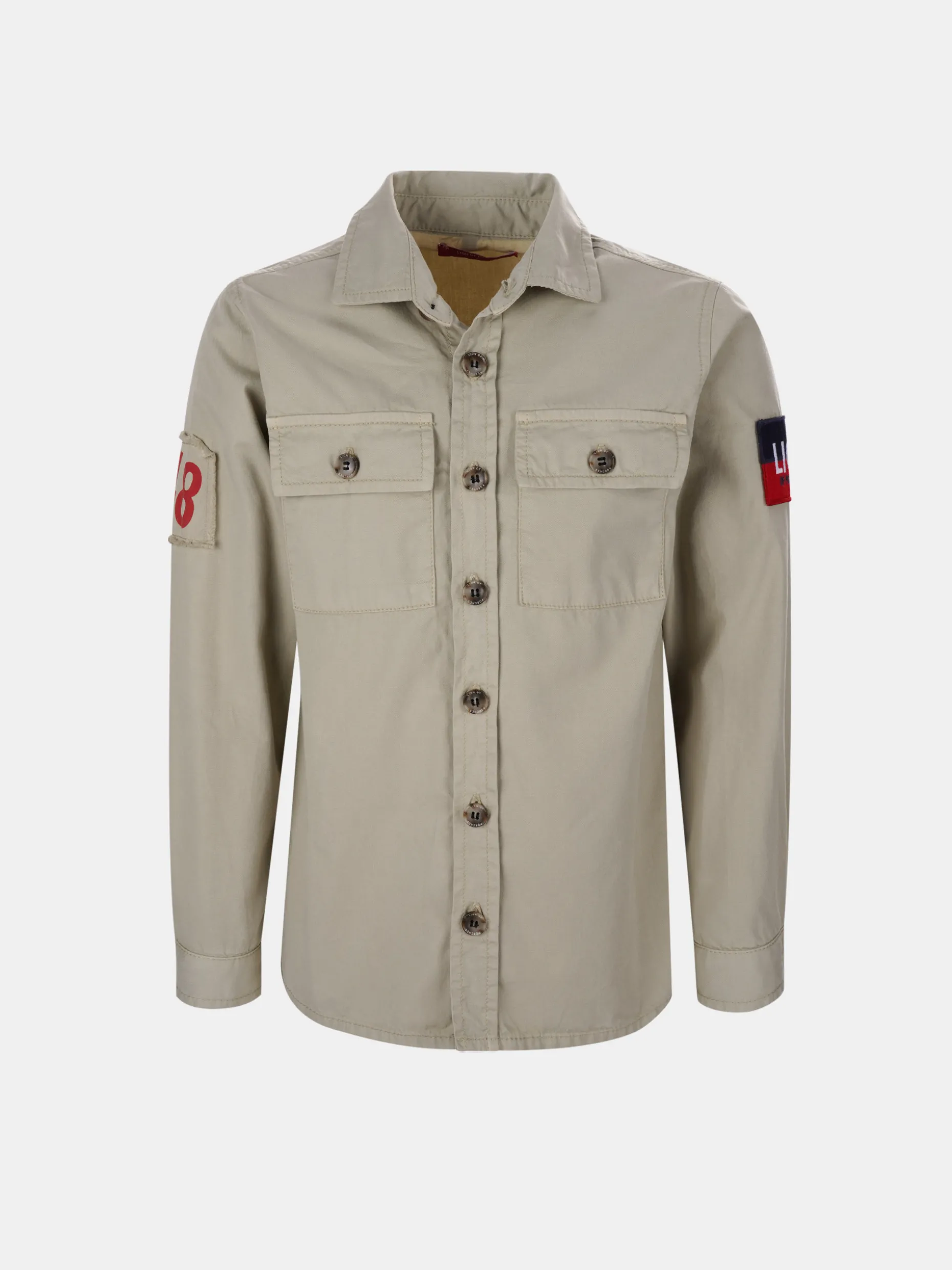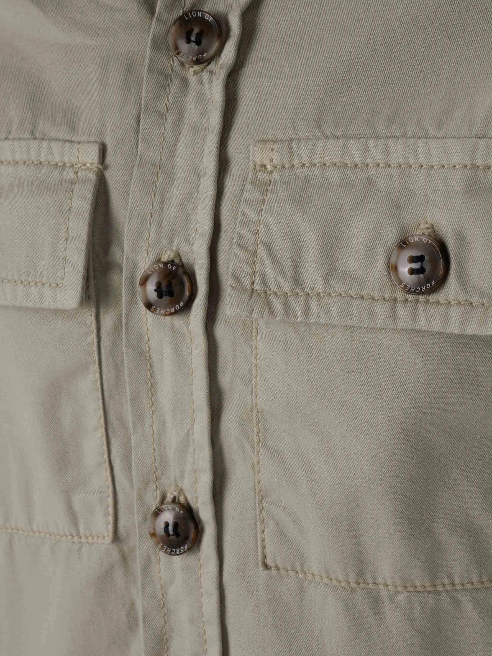 Camisa com bolsos na frente. Estampado “48” numa manga em contraste e bordado Lion of Porches noutra manga. Detalhe da fita de riscas atrás na gola.