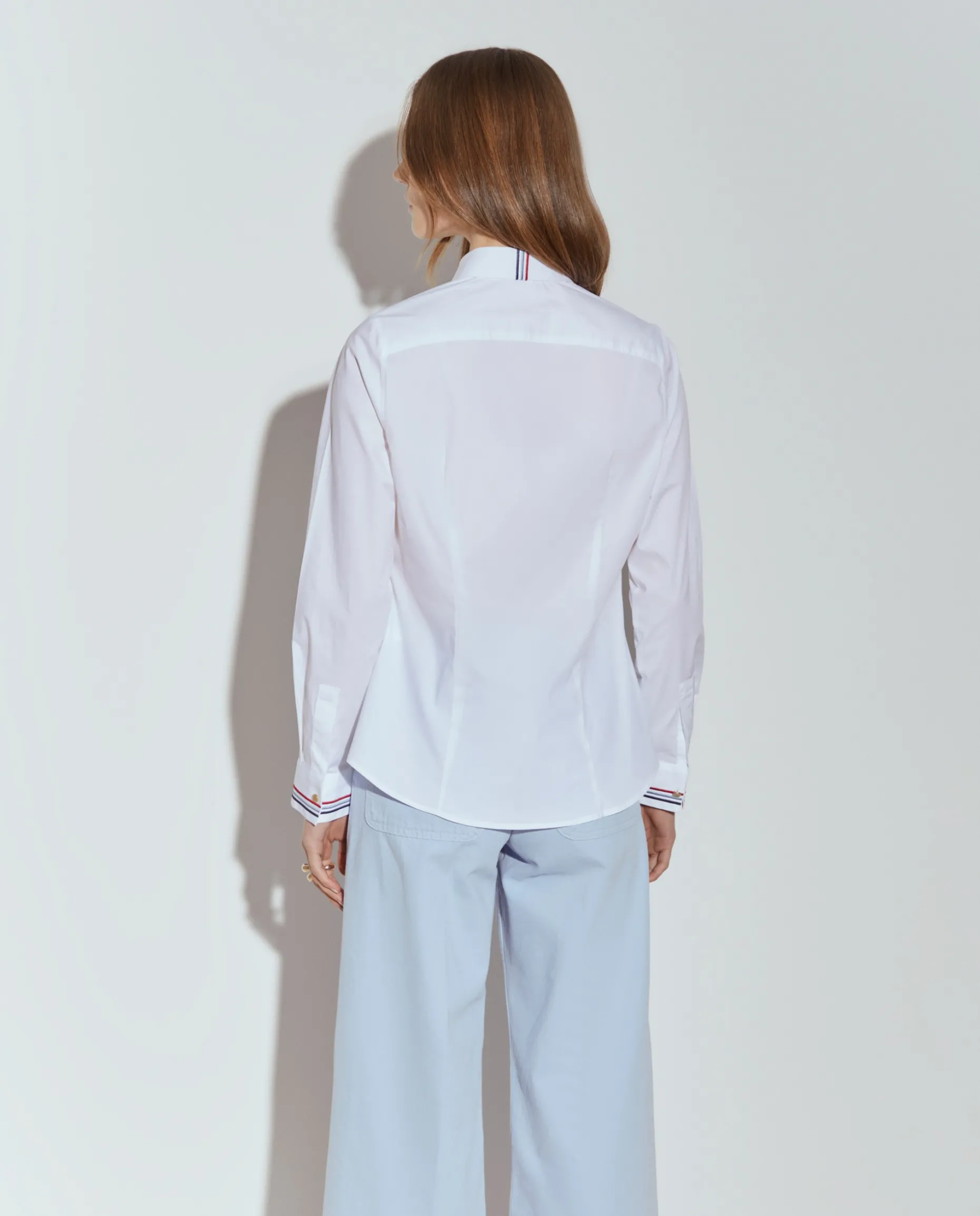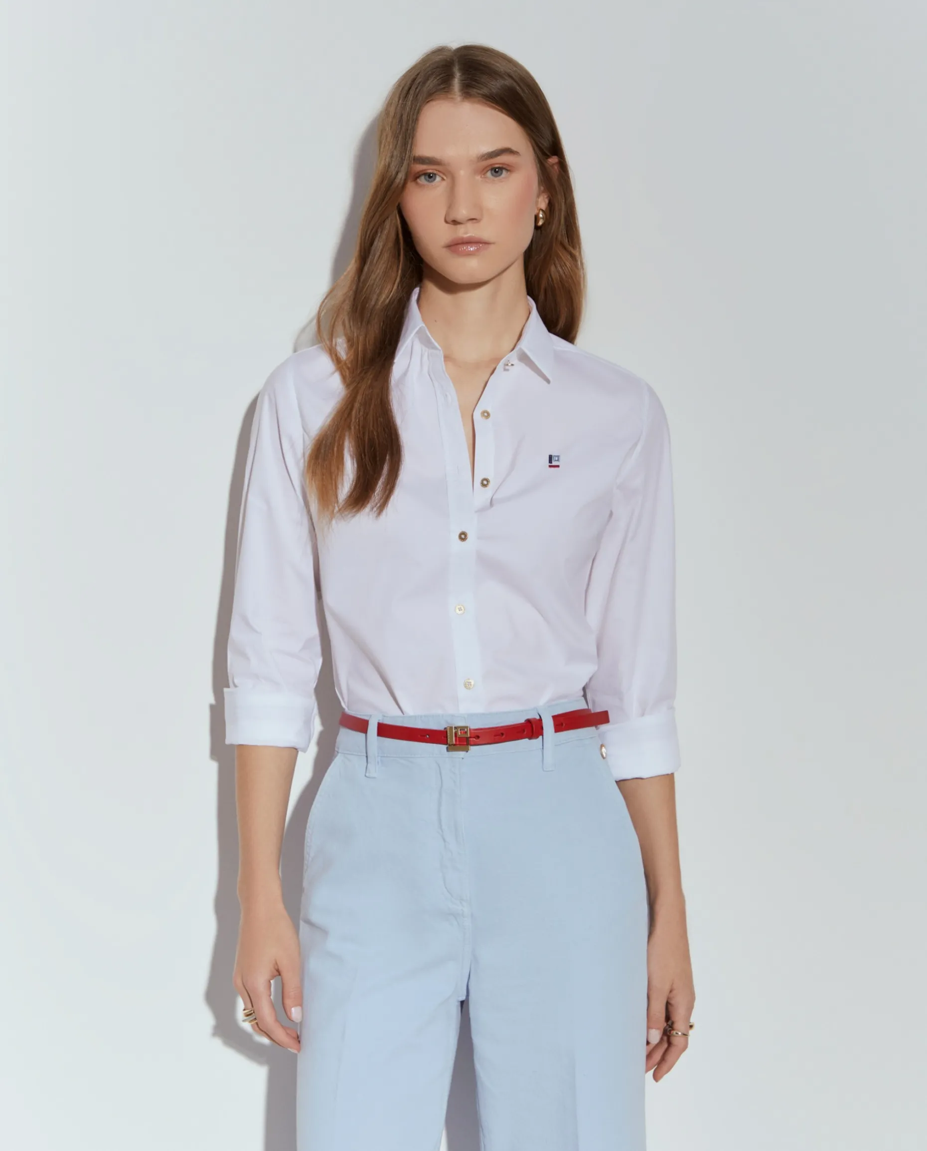 Camisa clássica com pormenor original de riscas em contraste nos punhos e na parte de trás da gola. De manga comprida, o abotoamento é com botões dourados. É confecionada em algodão, com uma pequena percentagem de elastano para maior conforto e liberdade de movimentos. Finaliza com emblema bordado em contraste no peito.