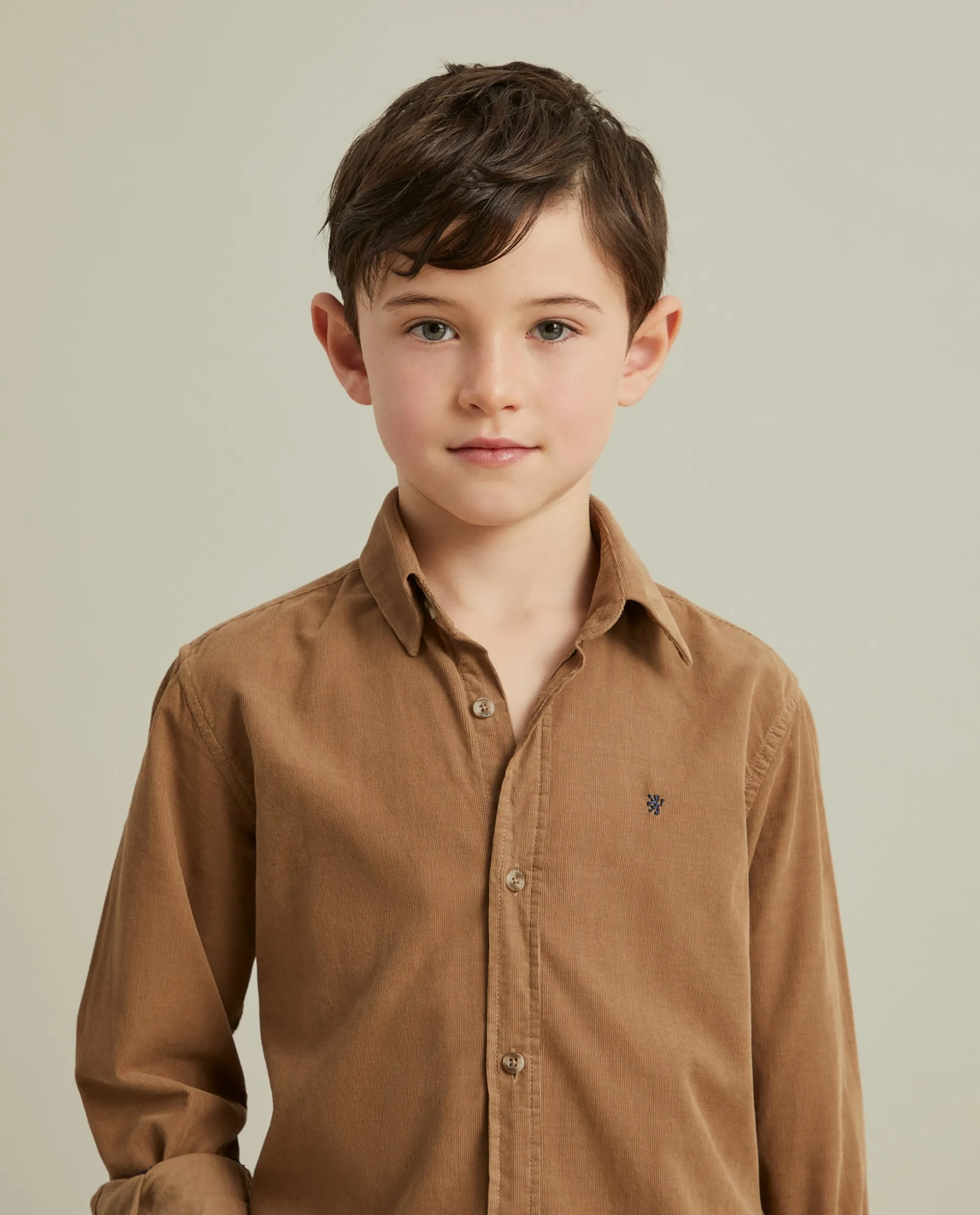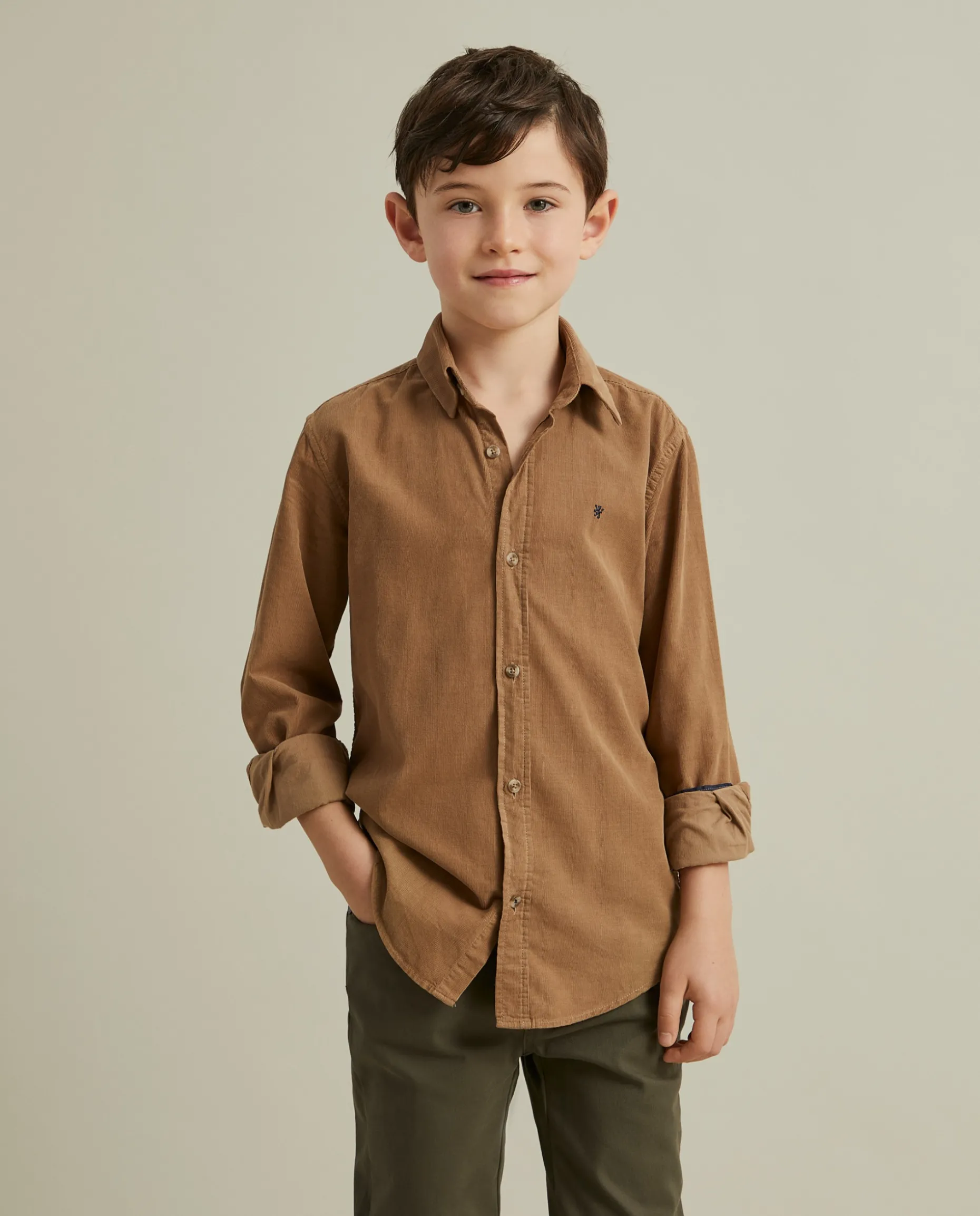 Para miúdos cheios de estilo, propomos esta camisa de manga comprida, em bombazine, com abertura por botões na frente e punhos. Pormenor de leão em contraste no peito. É confecionada em algodão com uma pequena percentagem de elastano para maior conforto e liberdade de movimentos.