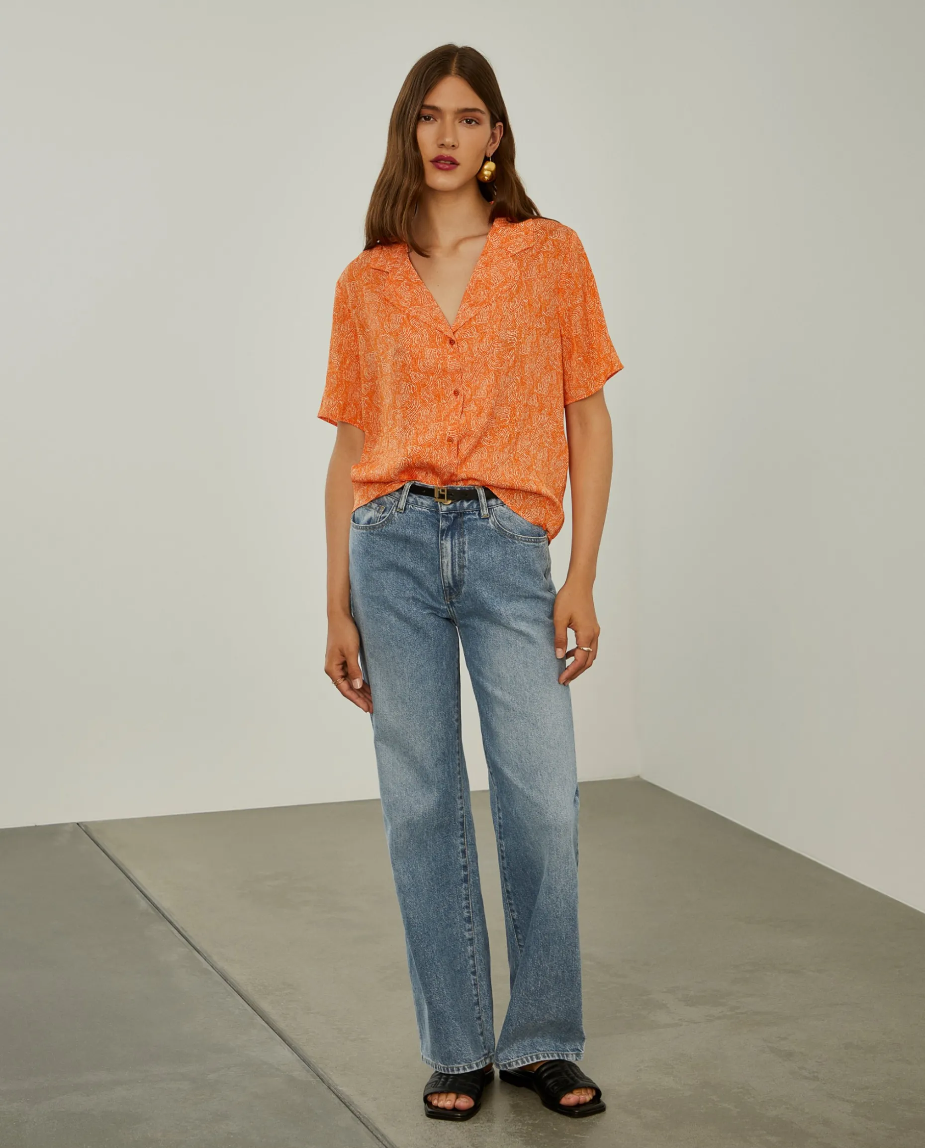 Camisa de manga curta com micro padrão polka dots. Com gola de bico com lapela, aperta na frente através de botões ao tom.