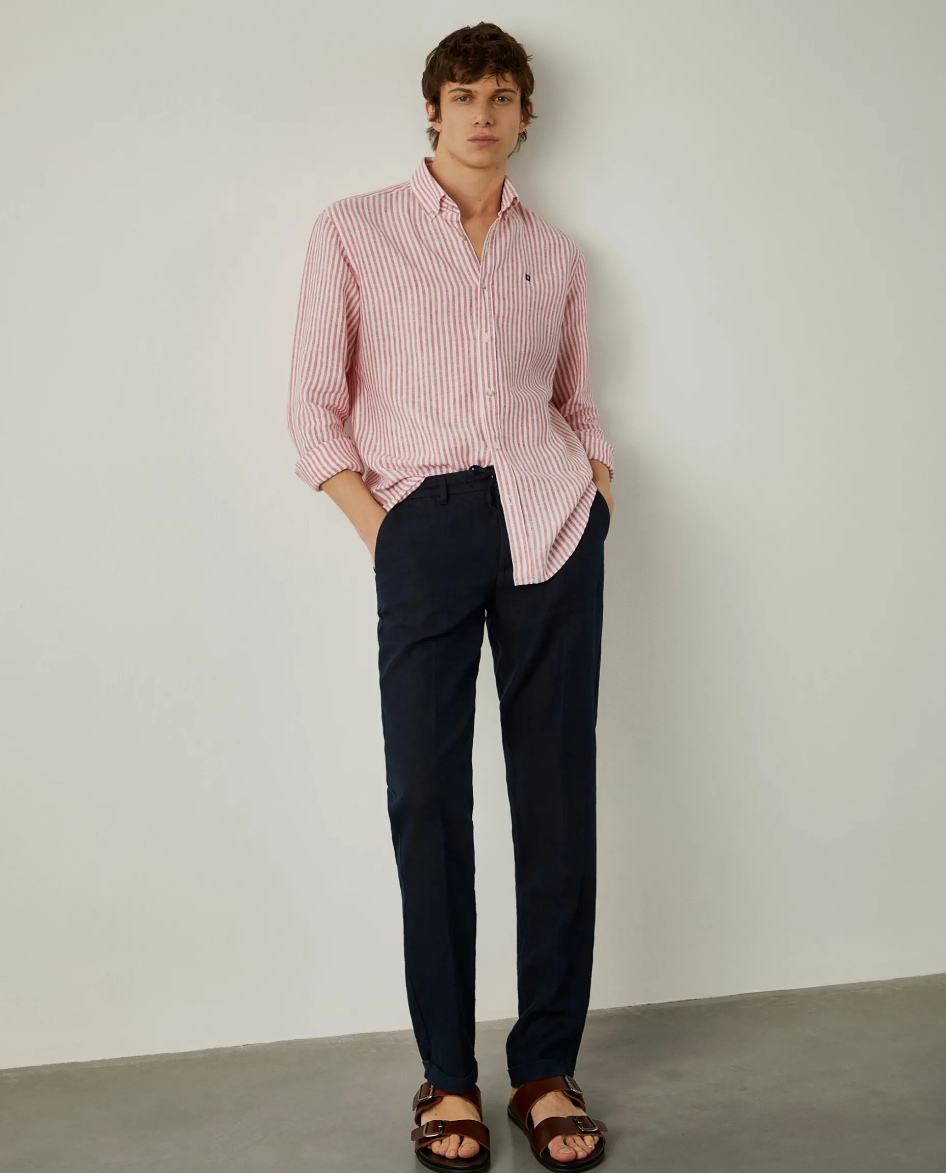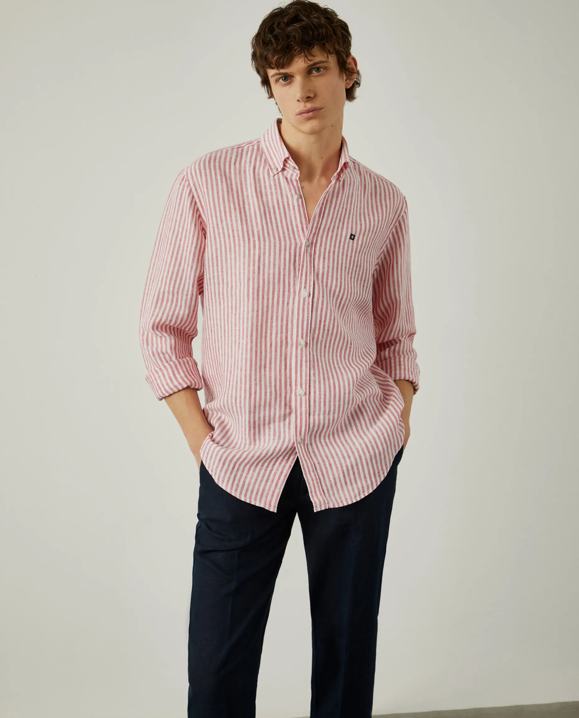 Perfeita para as estações mais quentes, esta camisa de manga comprida tem padrão de riscas e é confecionada, na totalidade, em linho. Um material leve, fresco e respirável. Aperta com botões, não só na frente, como também nos punhos e colarinho. Finaliza com pequeno leão da marca em contraste no peito.