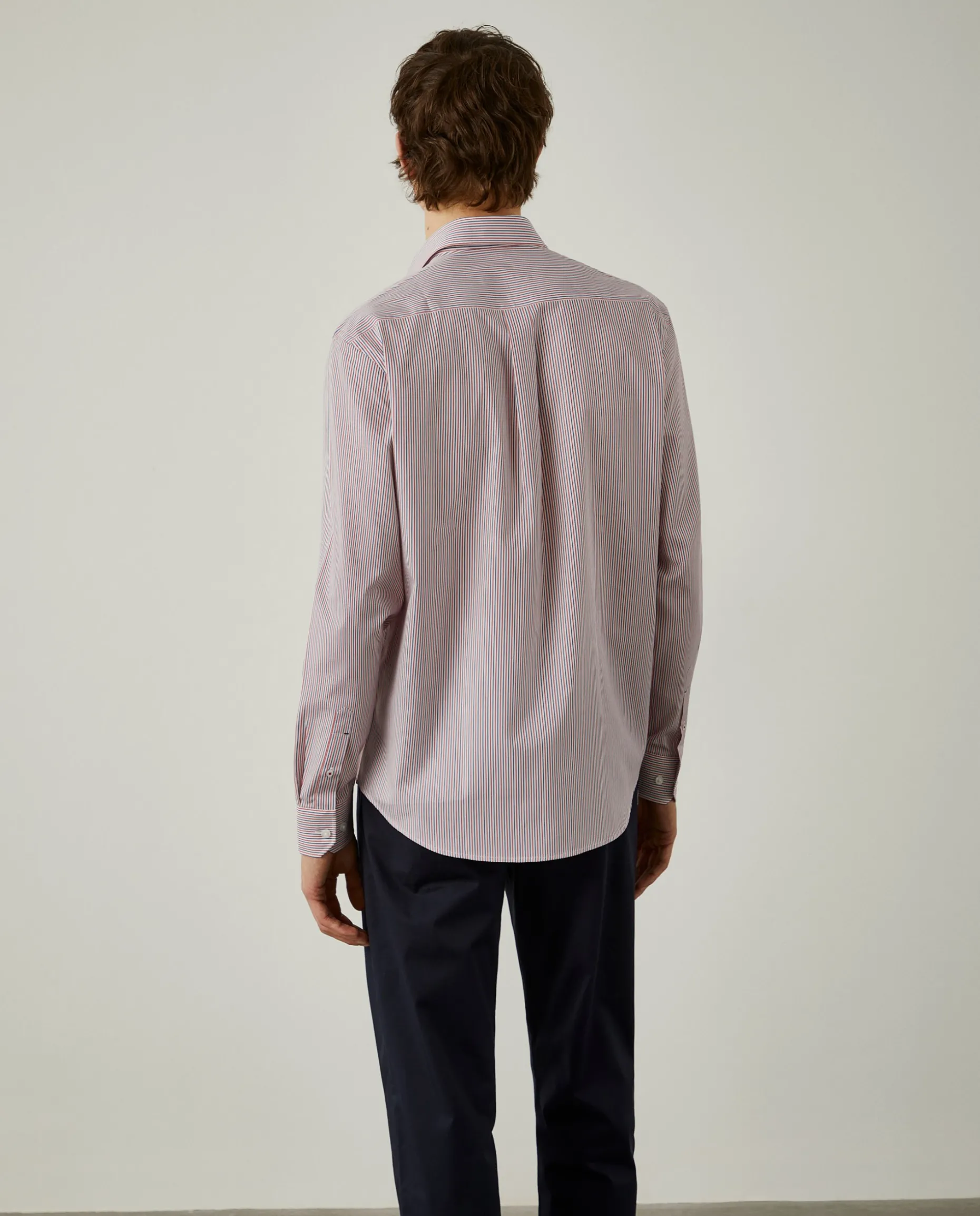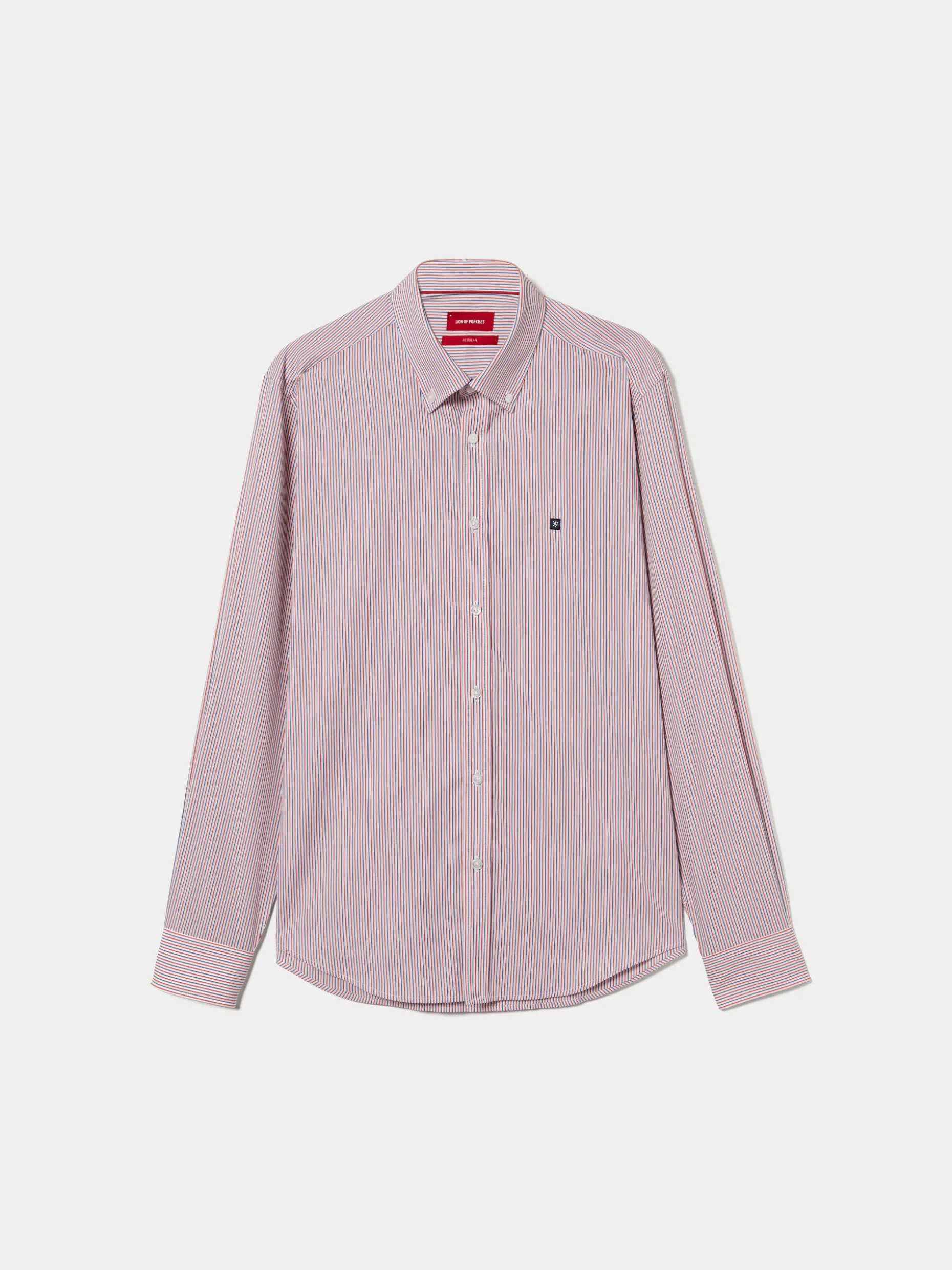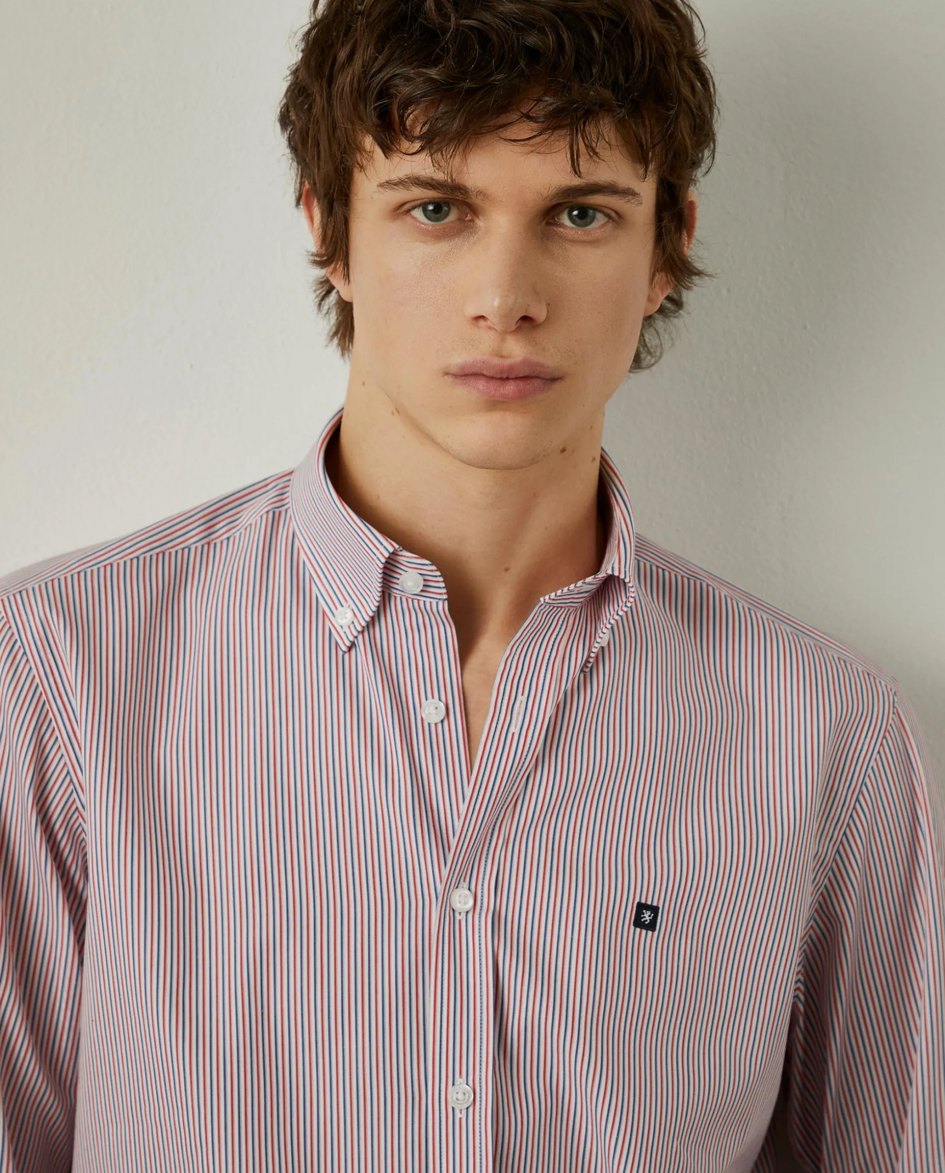 Camisa regular fit em popelina com padrão de riscas. Aperta com botões na frente, colarinho e punhos. Finaliza com bordado Lion of Porches no peito, em contraste de cor.
