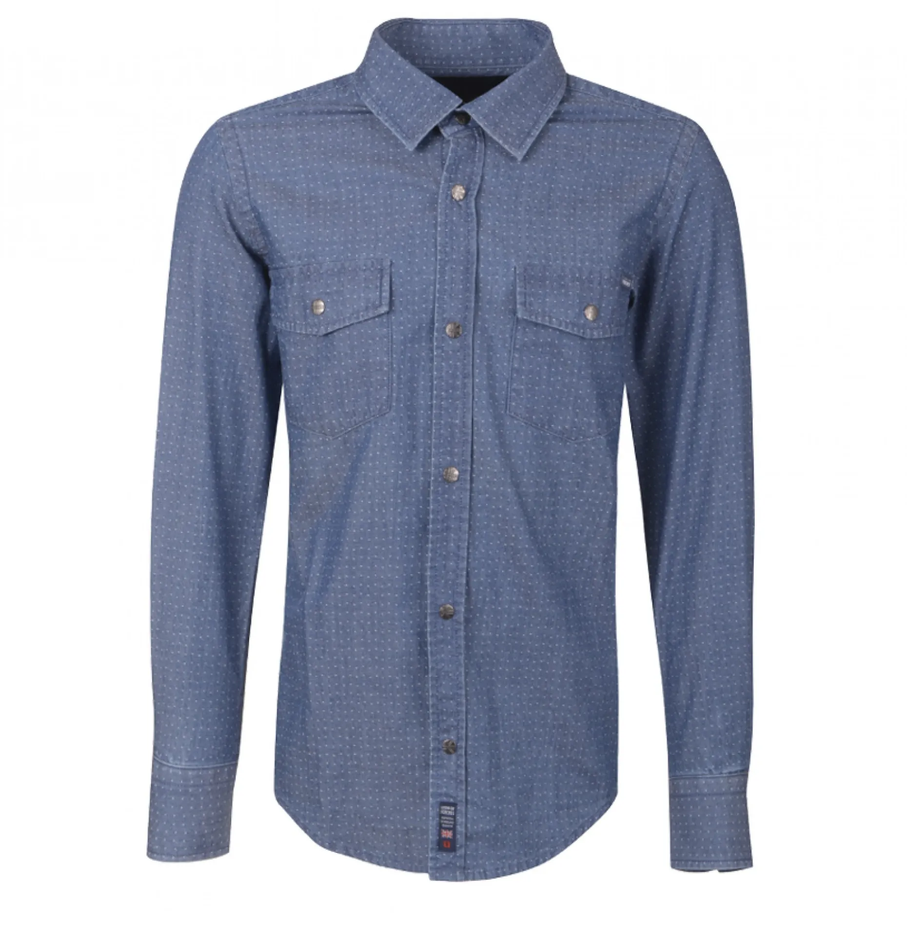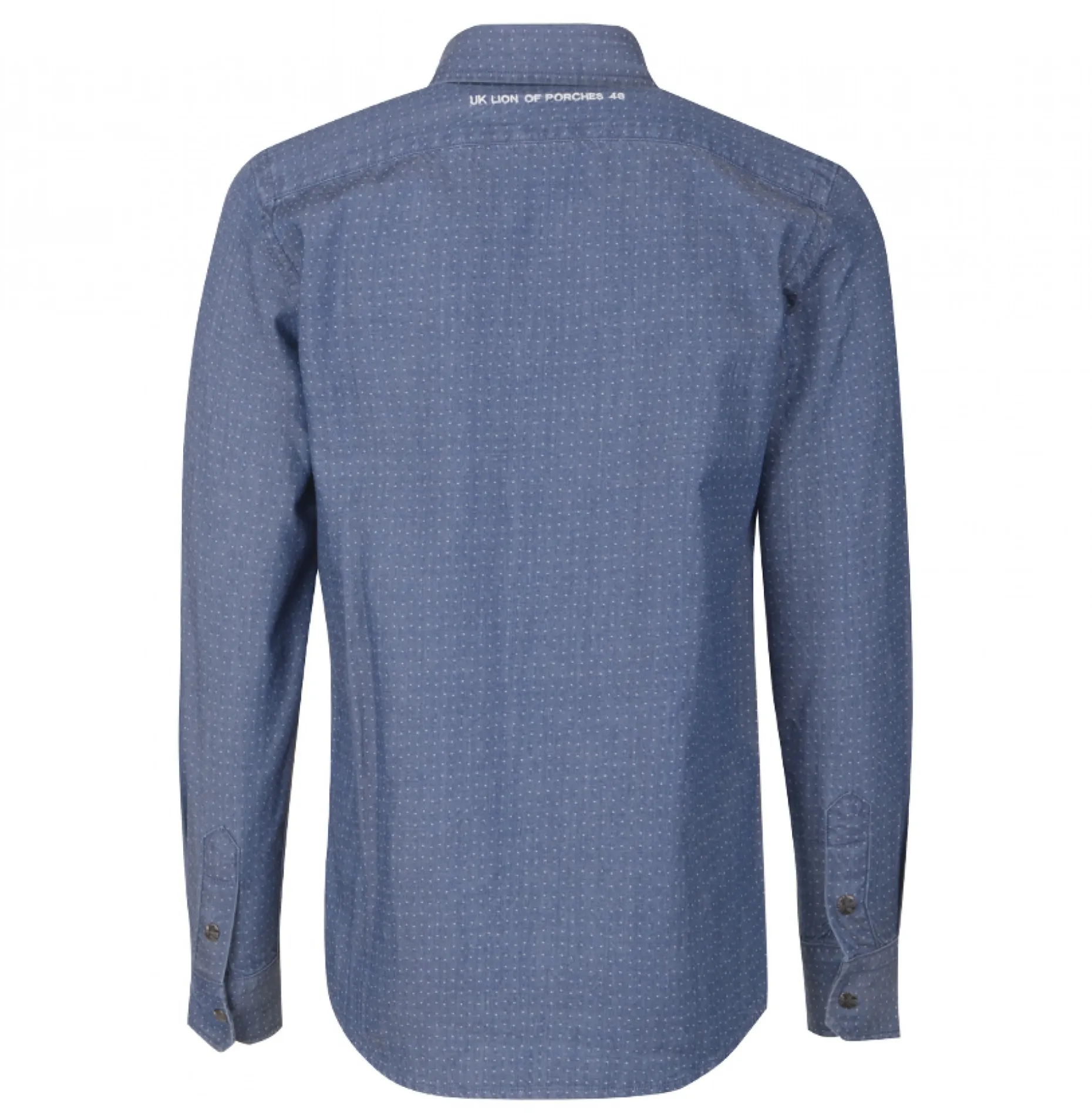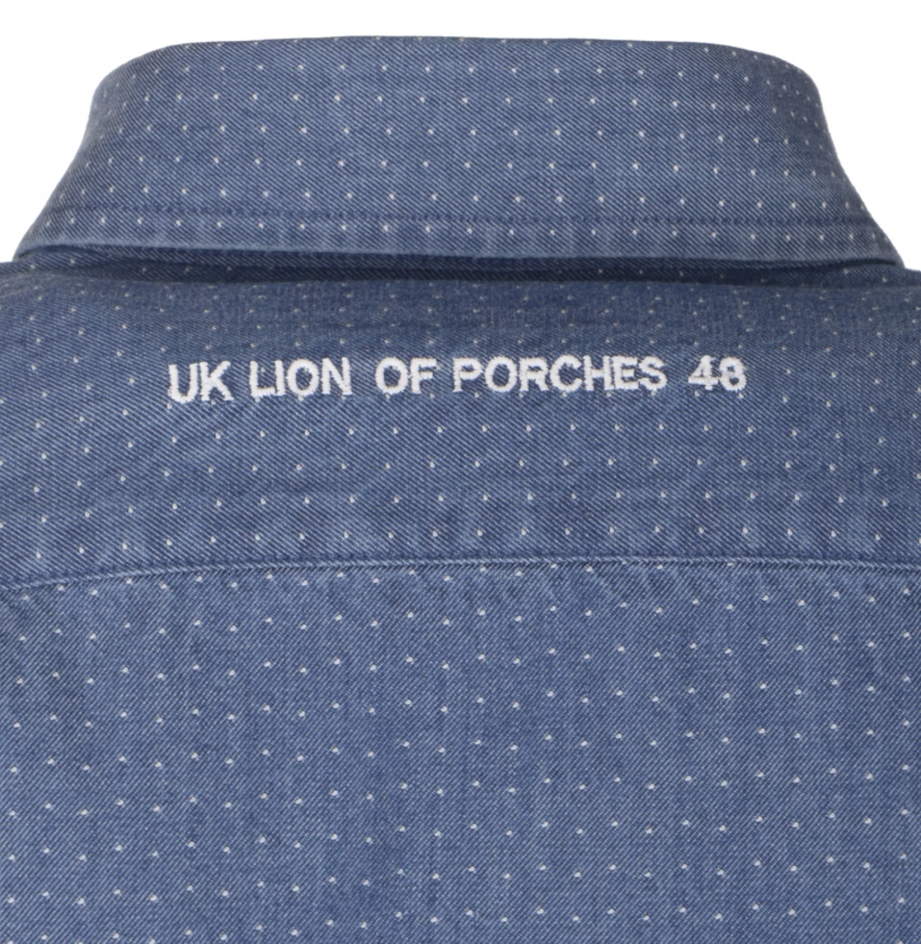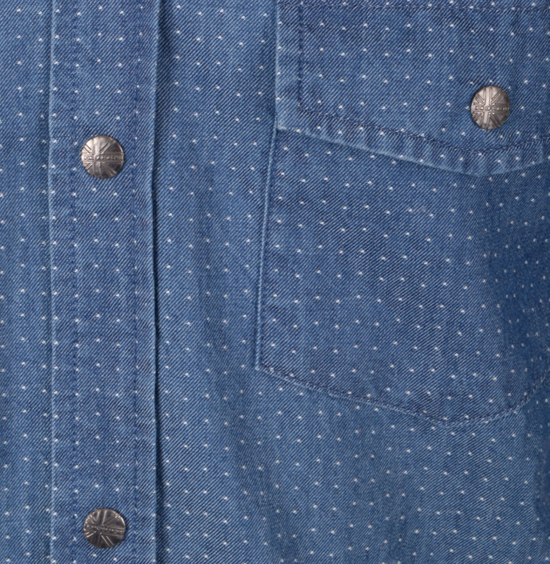 Camisa confecionada em ganga e estampada com bolinhas. Botões de mola gravados com a UK Flag. Designação da marca bordada no cimo das costas.