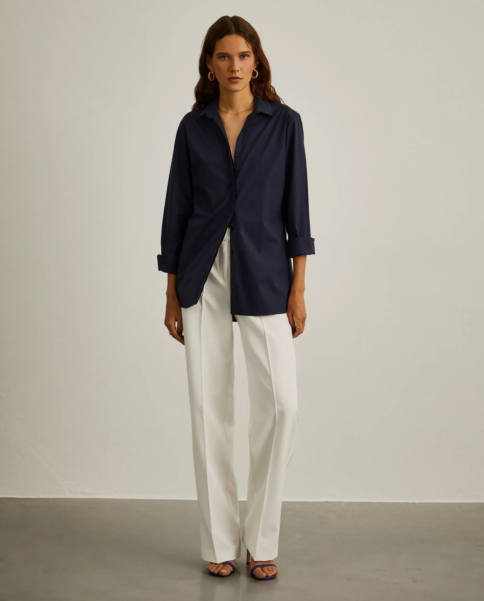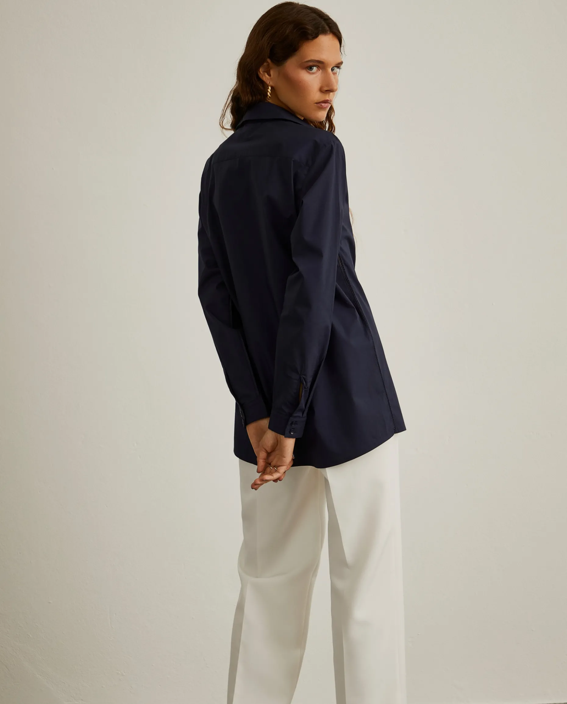 Camisa de algodão com pormenor elegante e diferenciador de bordado inglês nos ombros e laterais. Aperta na frente com botões ocultos por carcela e os punhos também fecham com dois botões.