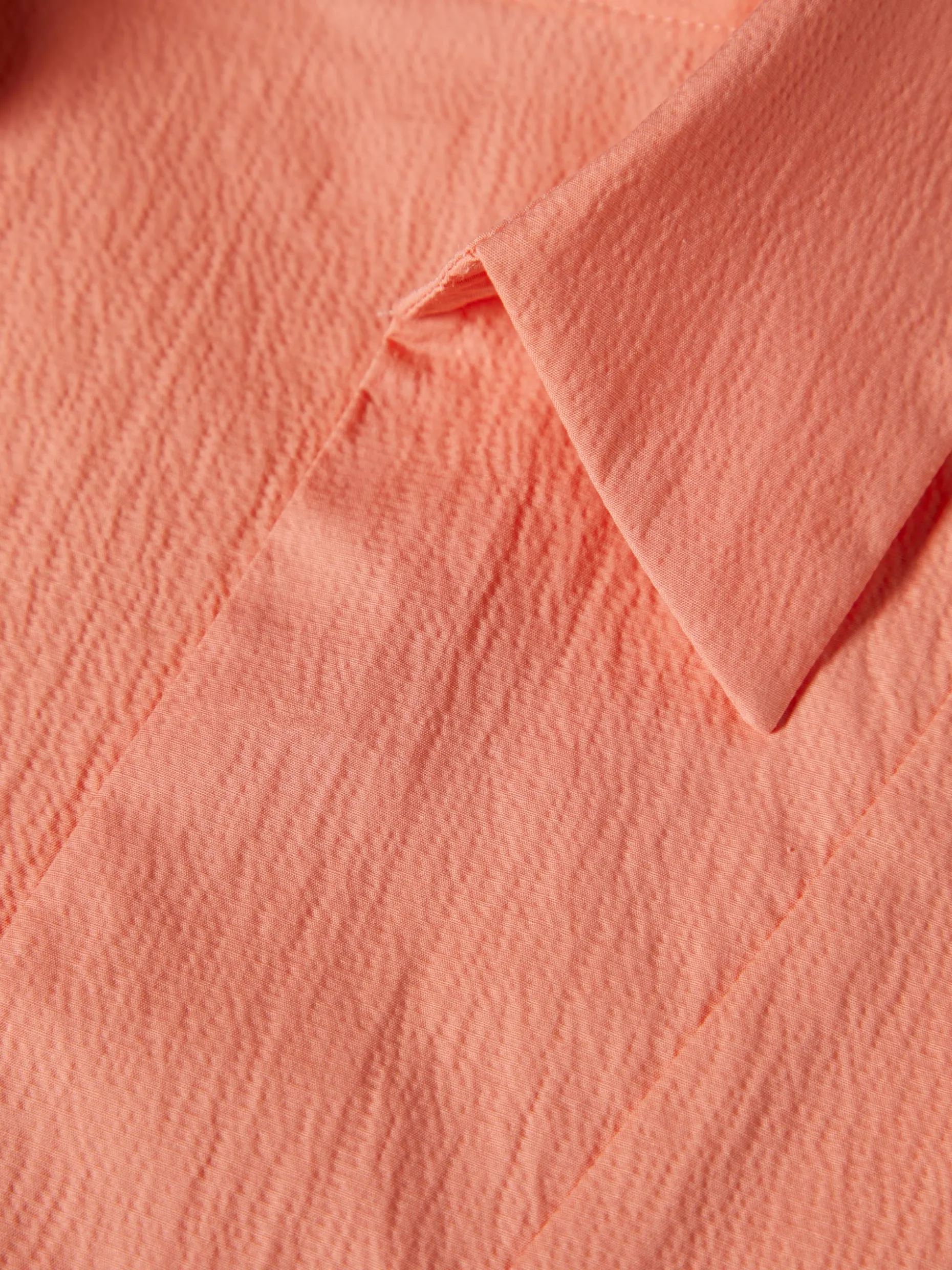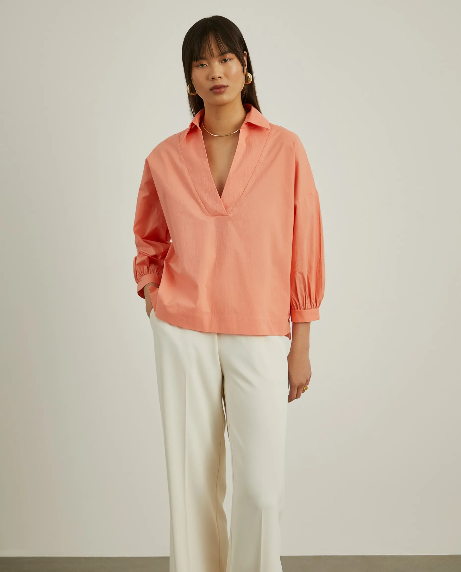 Camisa de fit largo com decote em V e mangas abalonadas que finalizam com pequenas pregas nos punhos. Finaliza com aberturas laterais e base assimétrica (mais comprida na parte de trás).