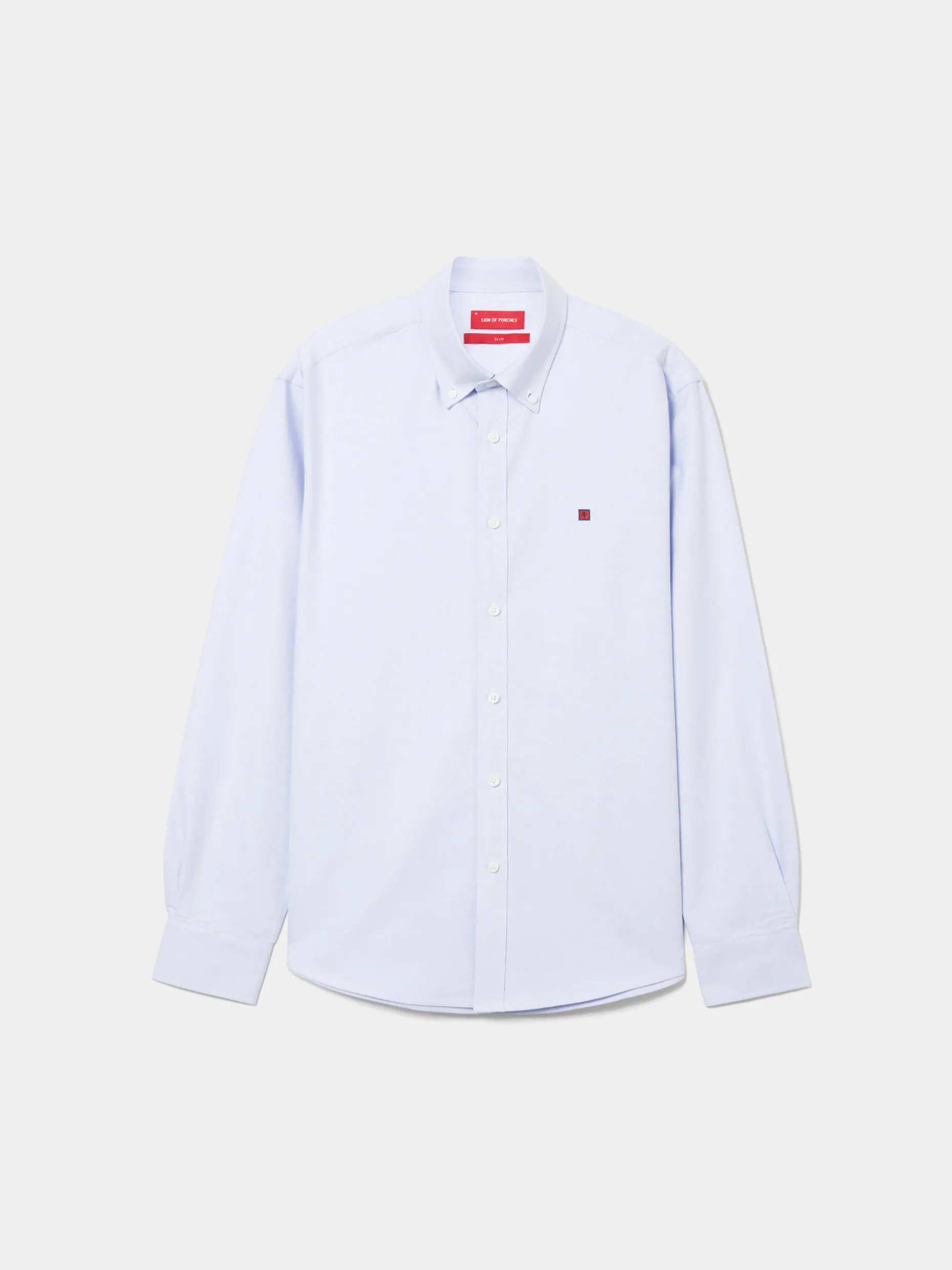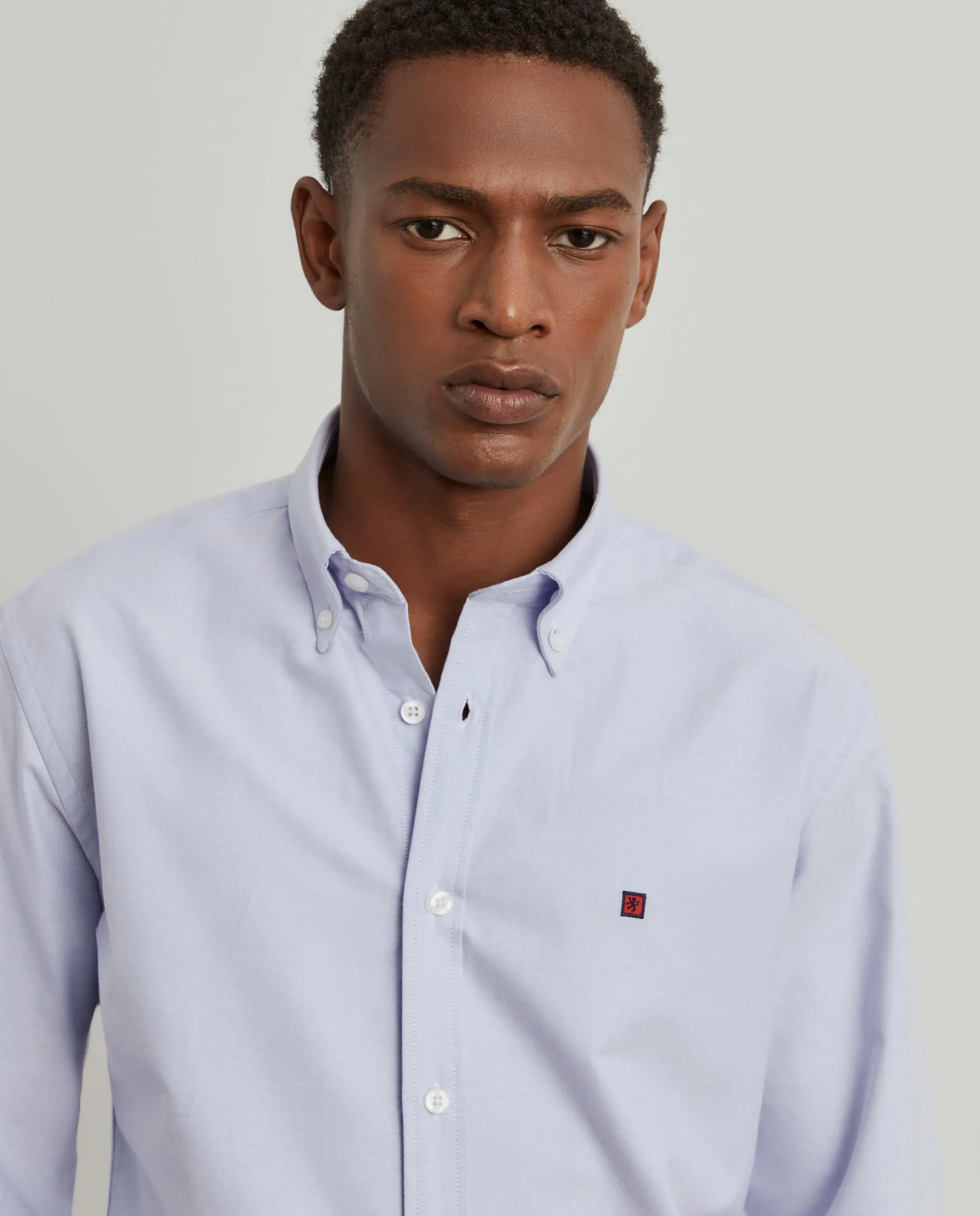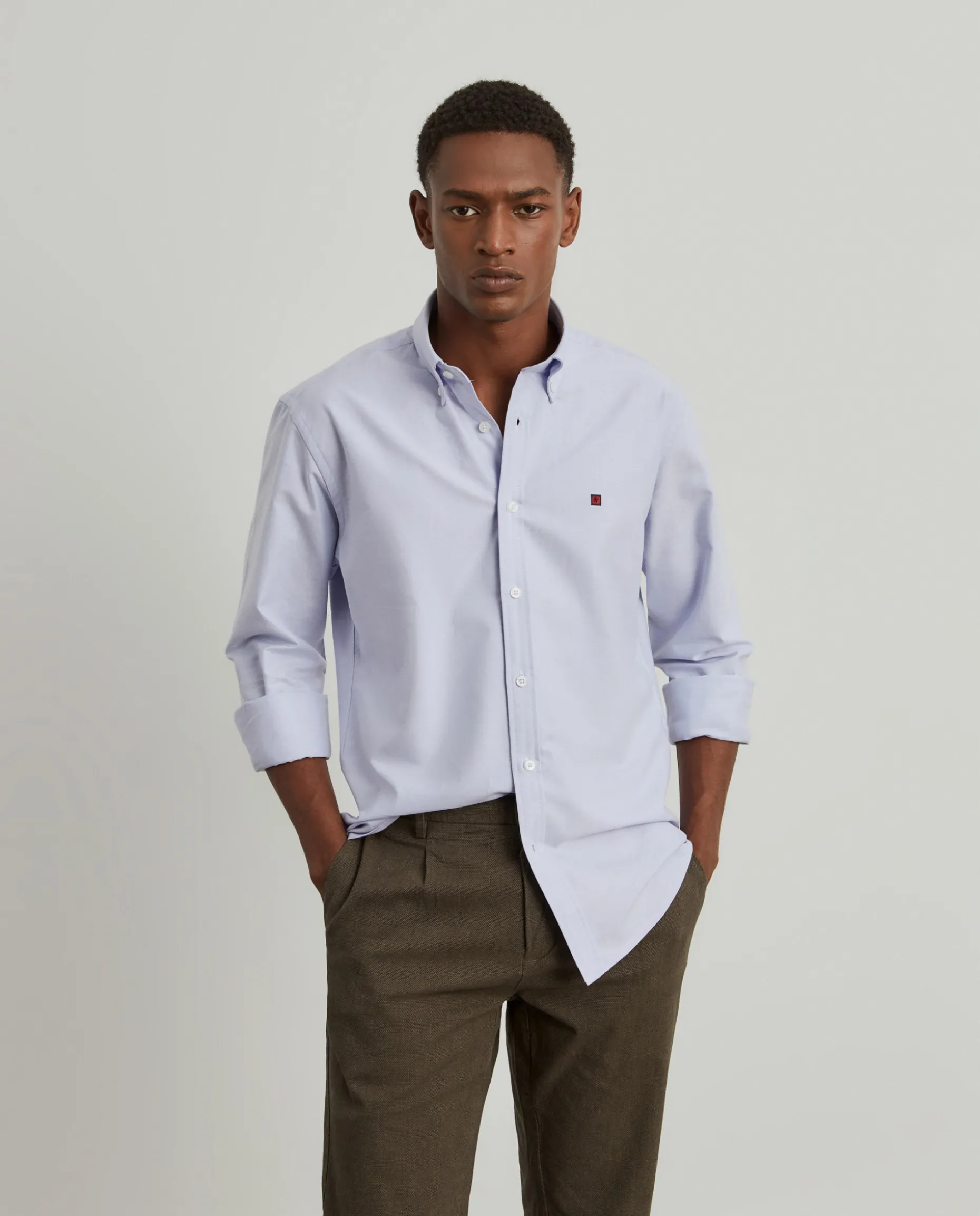 Camisa Slim Fit em tecido oxford. Colarinho com dois botões. Bordado personalizado no peito. Botões personalizados.