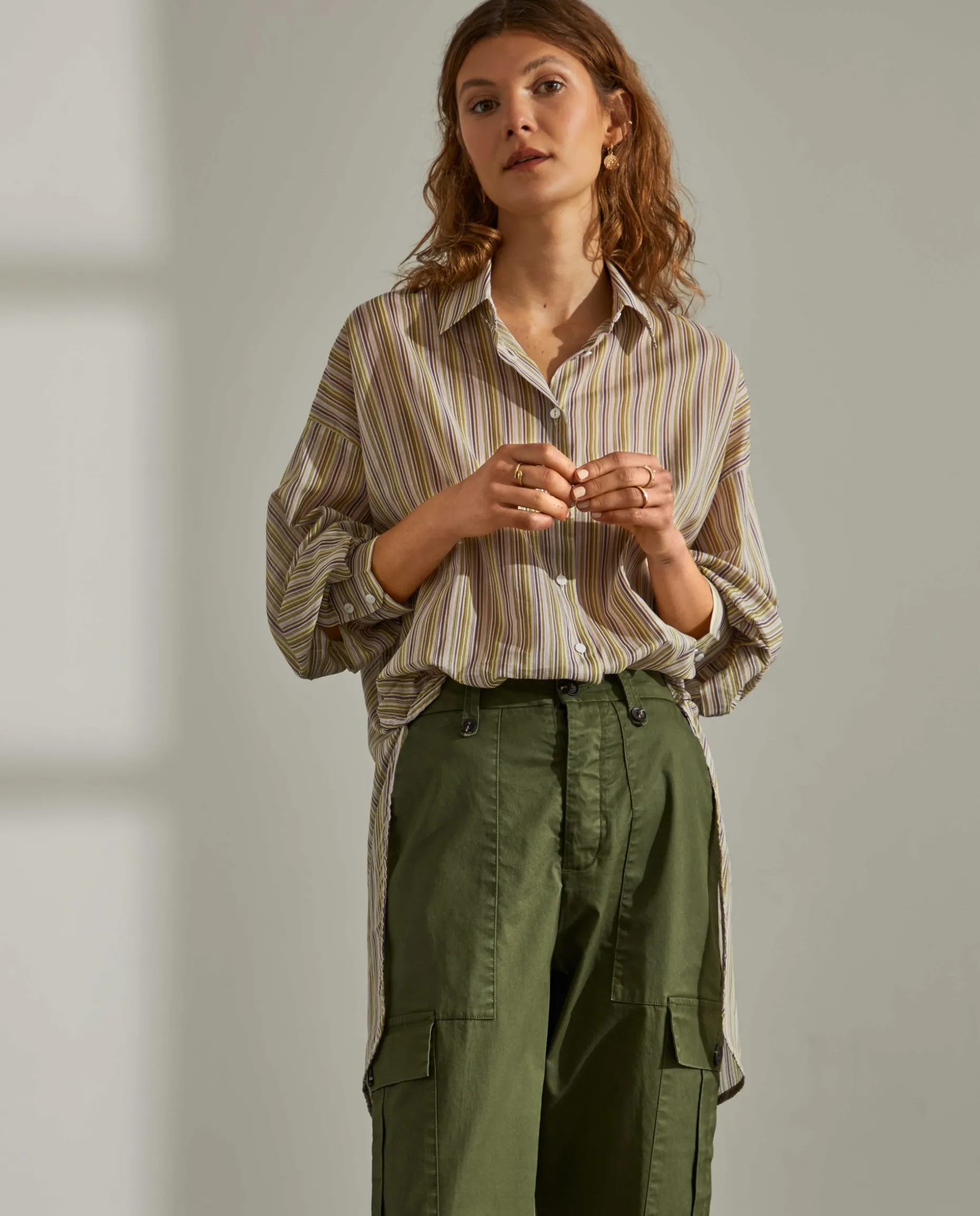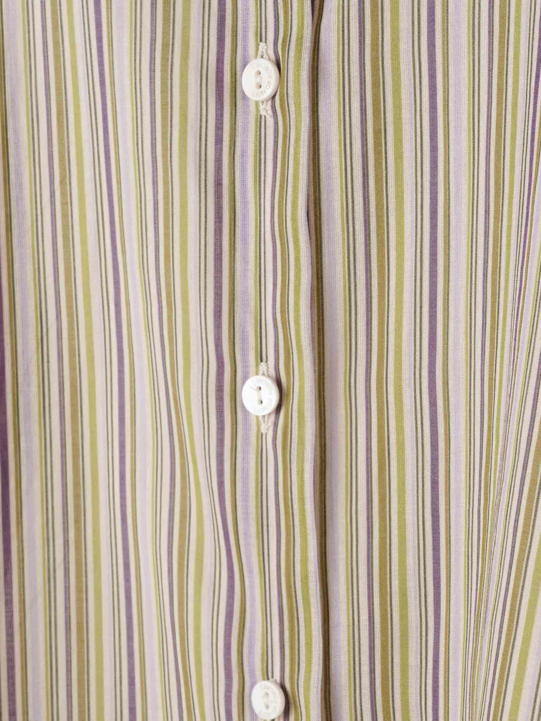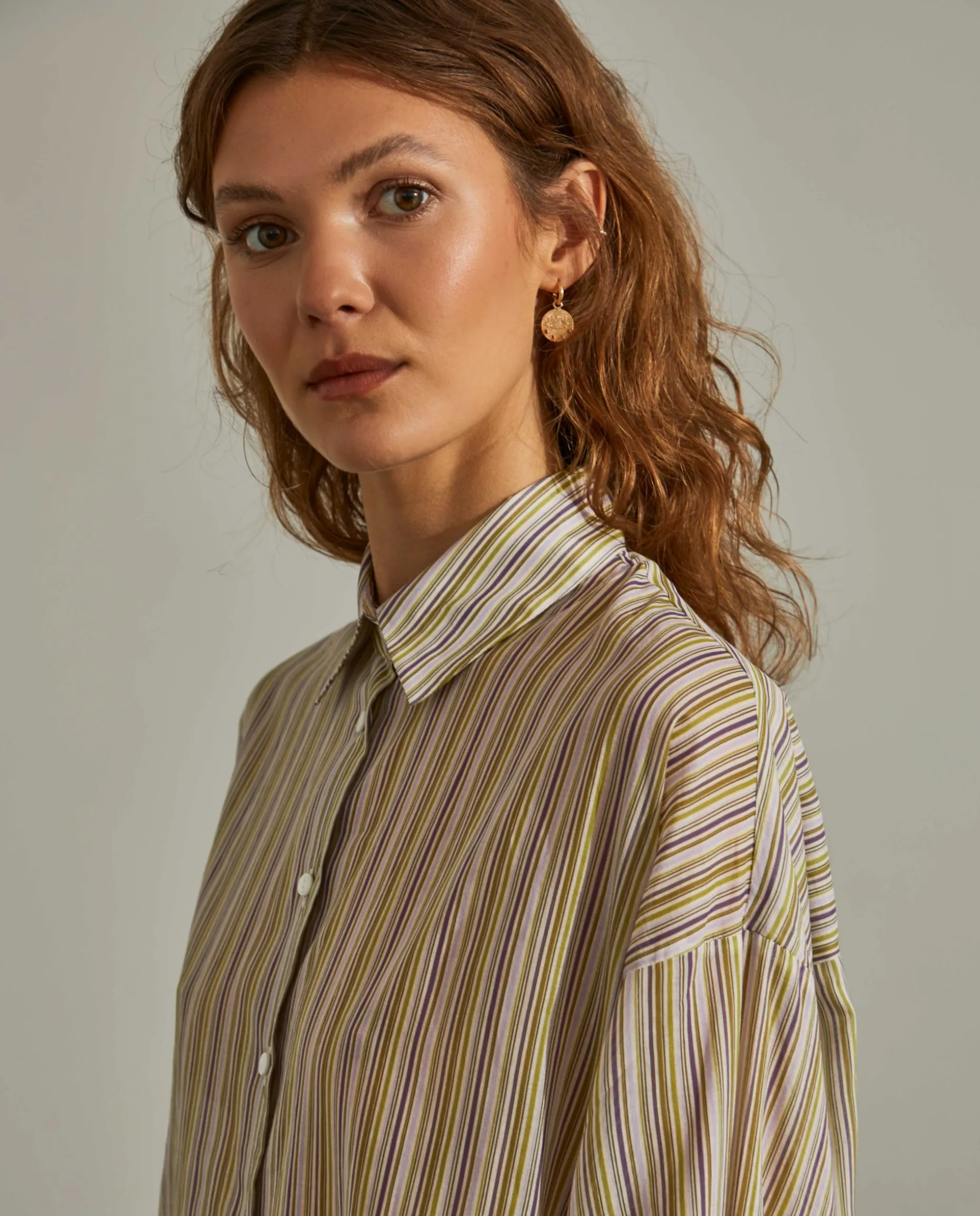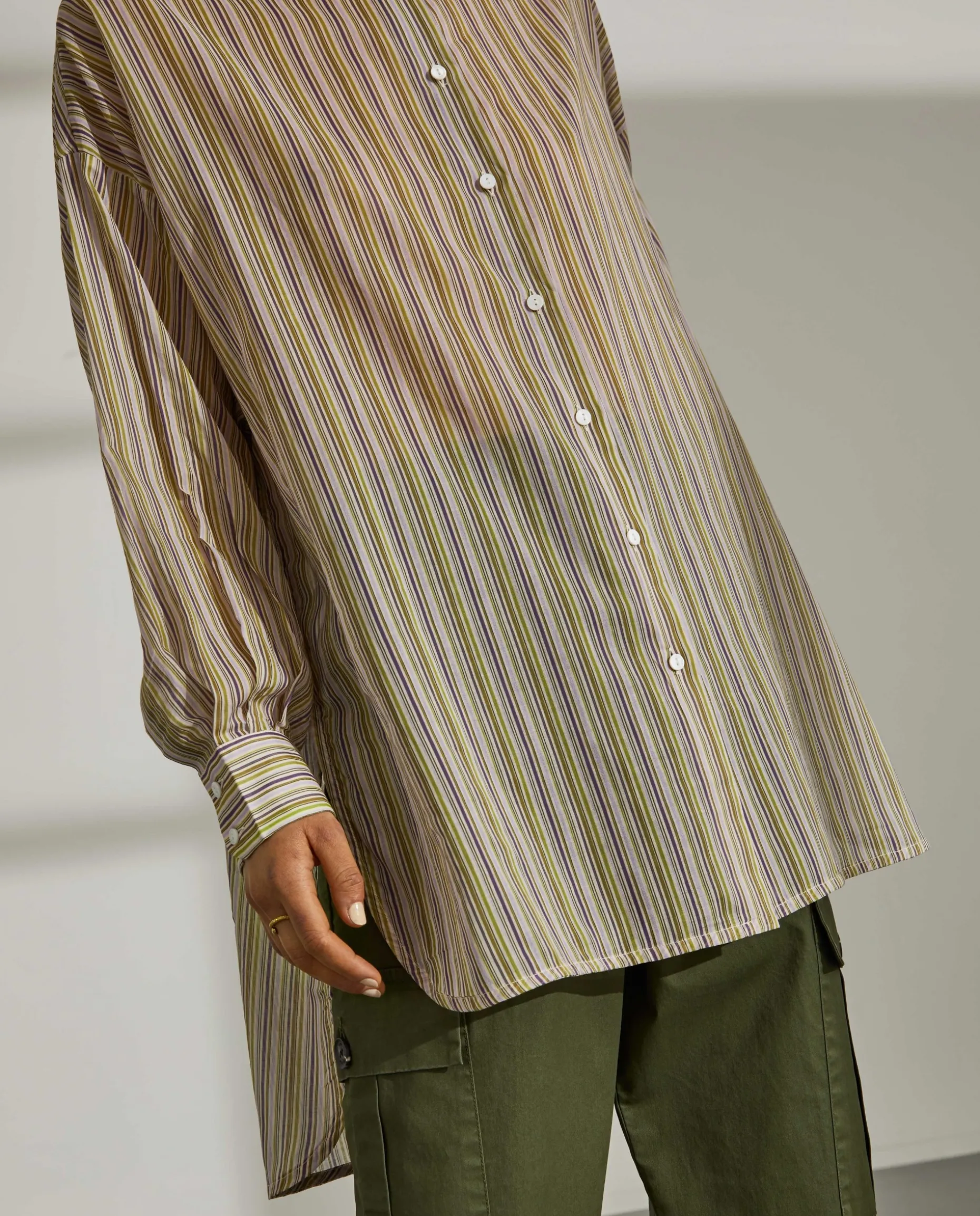 Camisa comprida e assimétrica confecionada em tecido de riscas 100% algodão. Colarinho clássico. Botões e personalização em madrepérola.