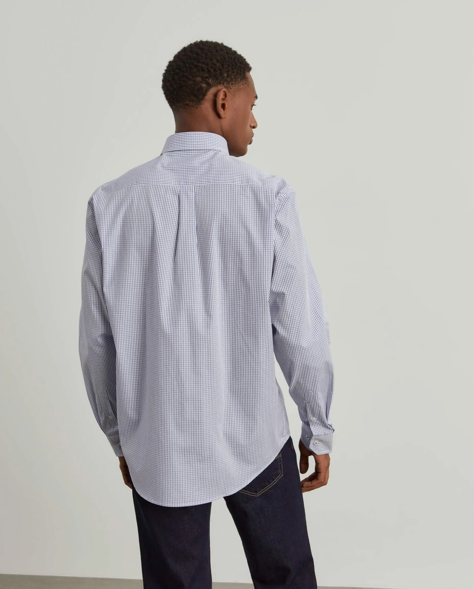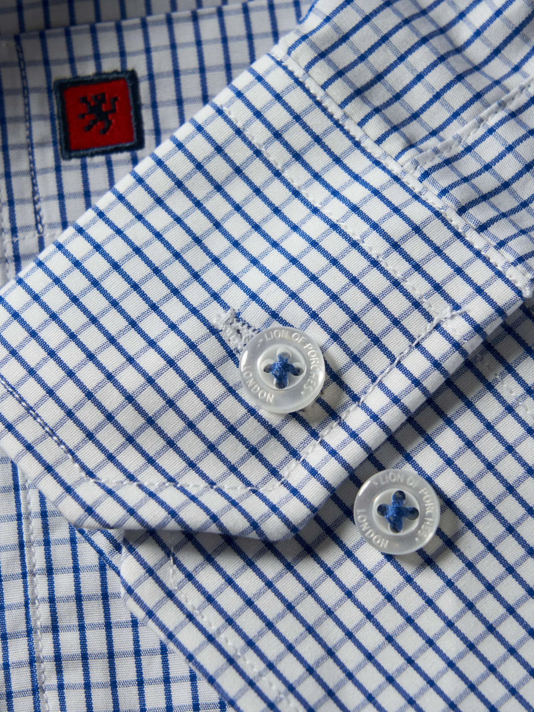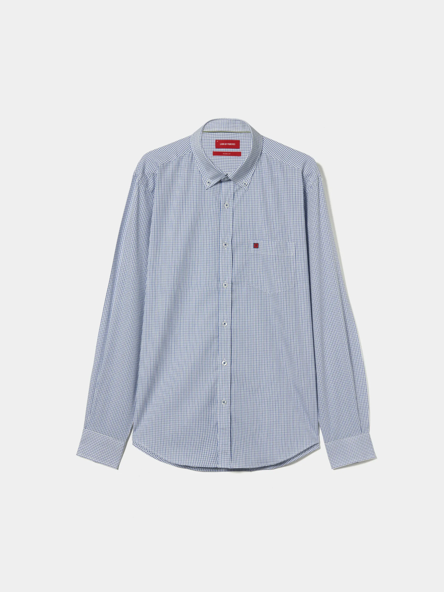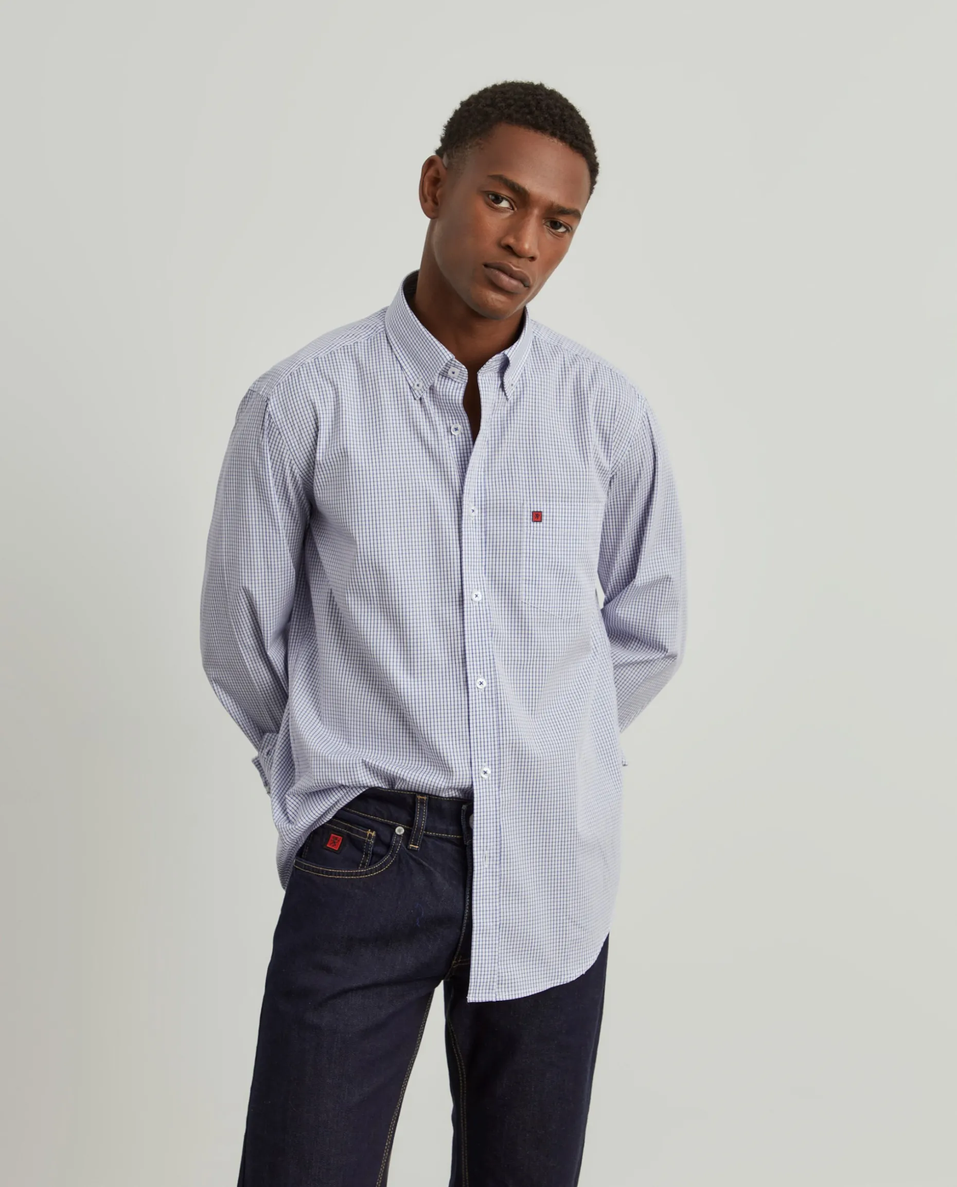 Camisa Regular Fit. Tecido com padrão de quadrados. Colarinho com dois botões. Bolso com bordado personalizado no peito. Botões personalizados.
