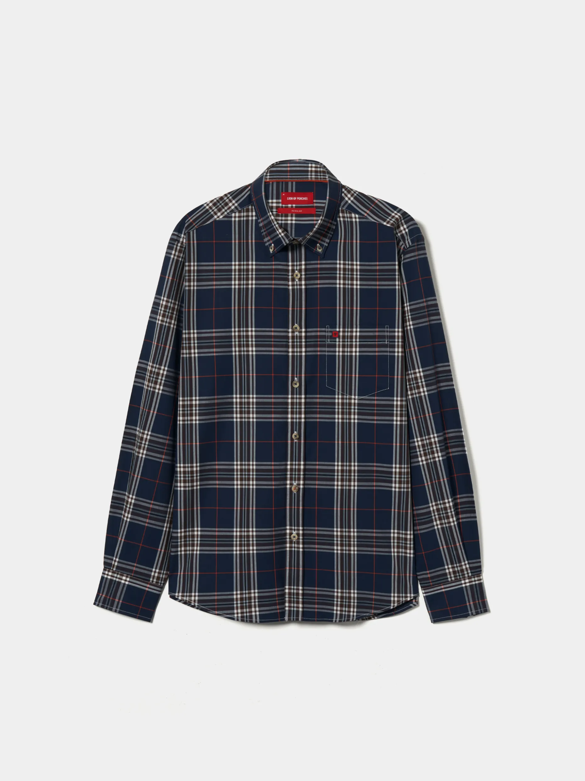 Camisa Regular Fit. Tecido com padrão de xadrez. Colarinho com dois botões. Bolso com bordado personalizado no peito. Botões personalizados.