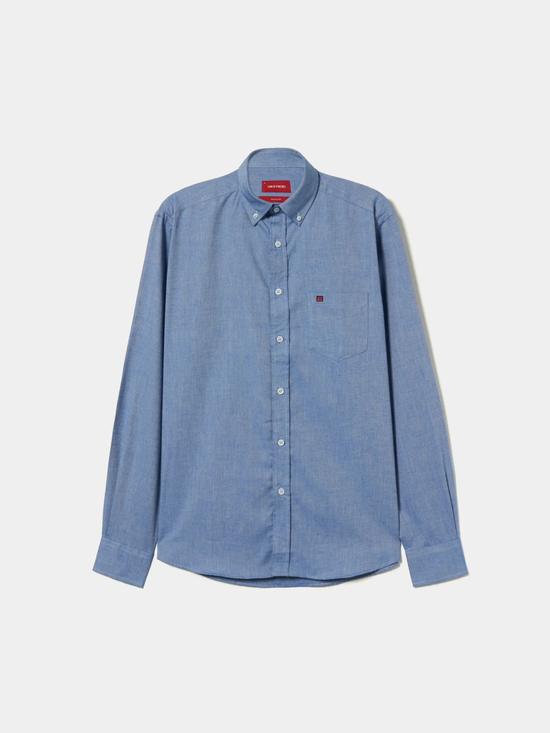Camisa Regular Fit. Colarinho com dois botões. Fita tricolor na carcela. Bolso com bordado personalizado no peito. Botões personalizados.