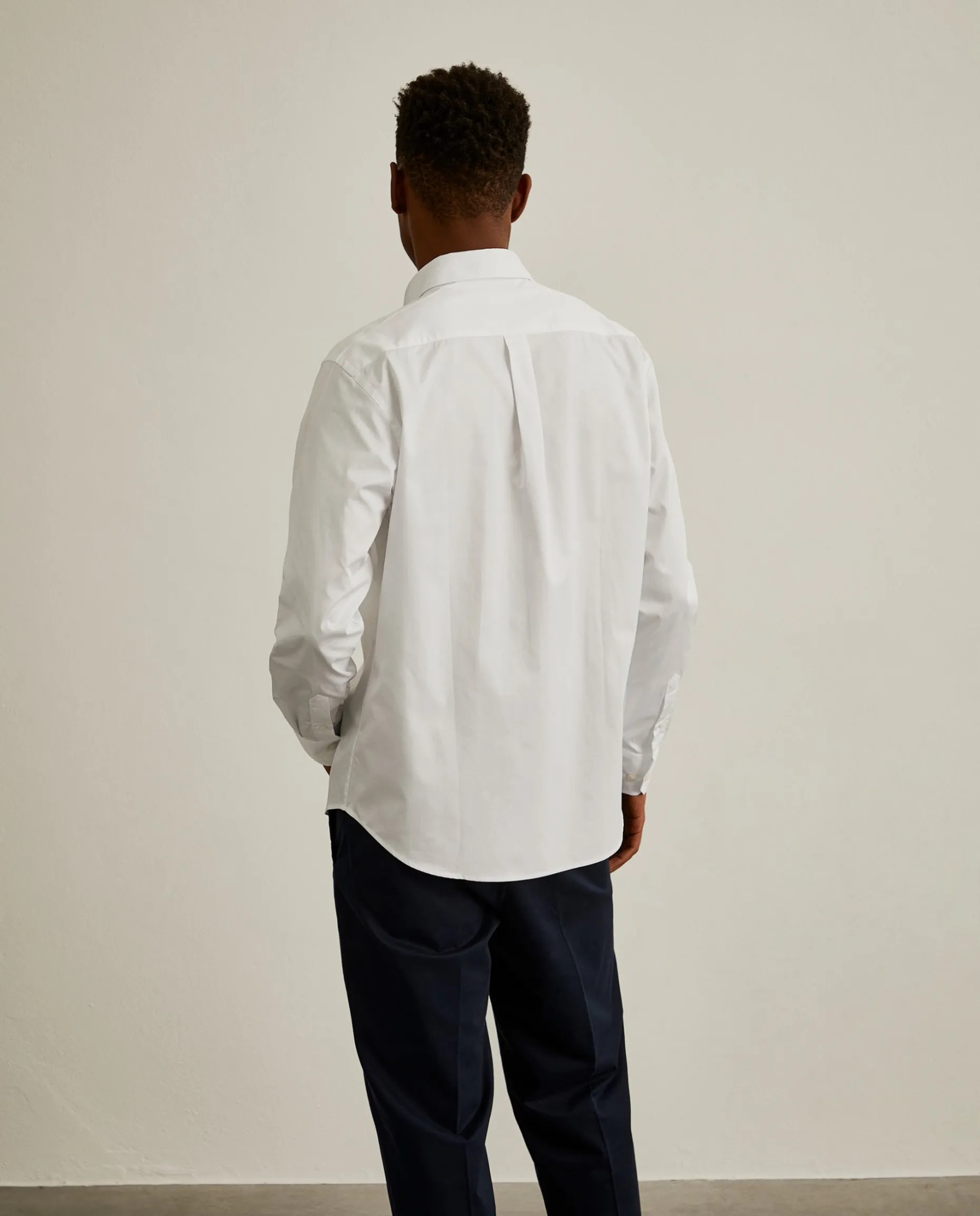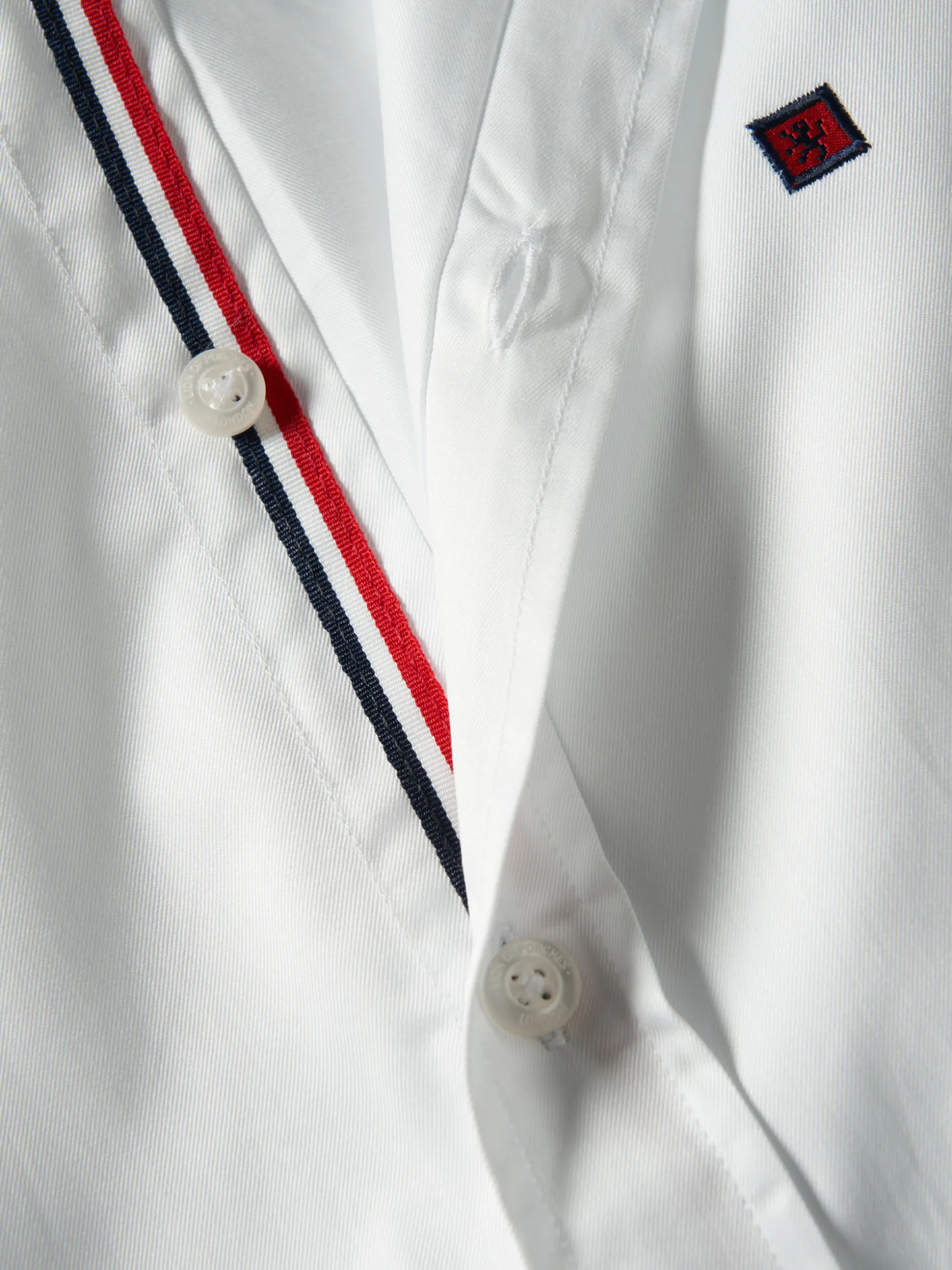 Camisa Regular Fit. Colarinho com dois botões. Fita tricolor na carcela. Bordado personalizado no peito. Botões personalizados.