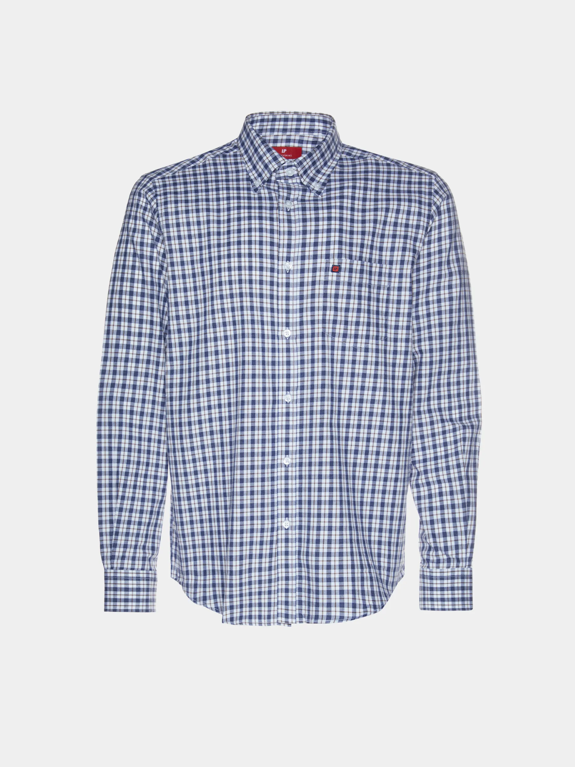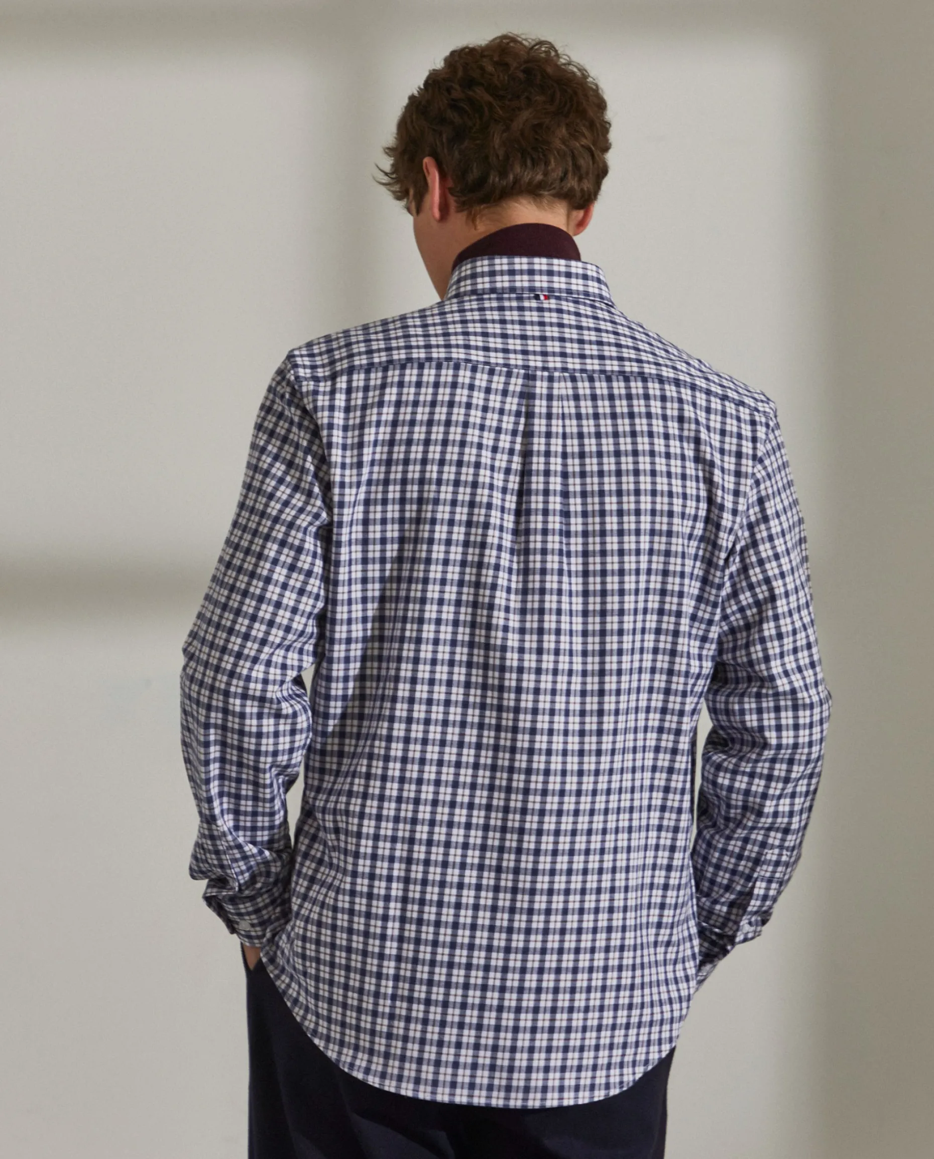 Camisa Regular Fit. Colarinho com dois botões. Bolso no peito com bordado personalizado. Botões personalizados. Macho de pregas nas costas. Fita decorativa no decote costas.