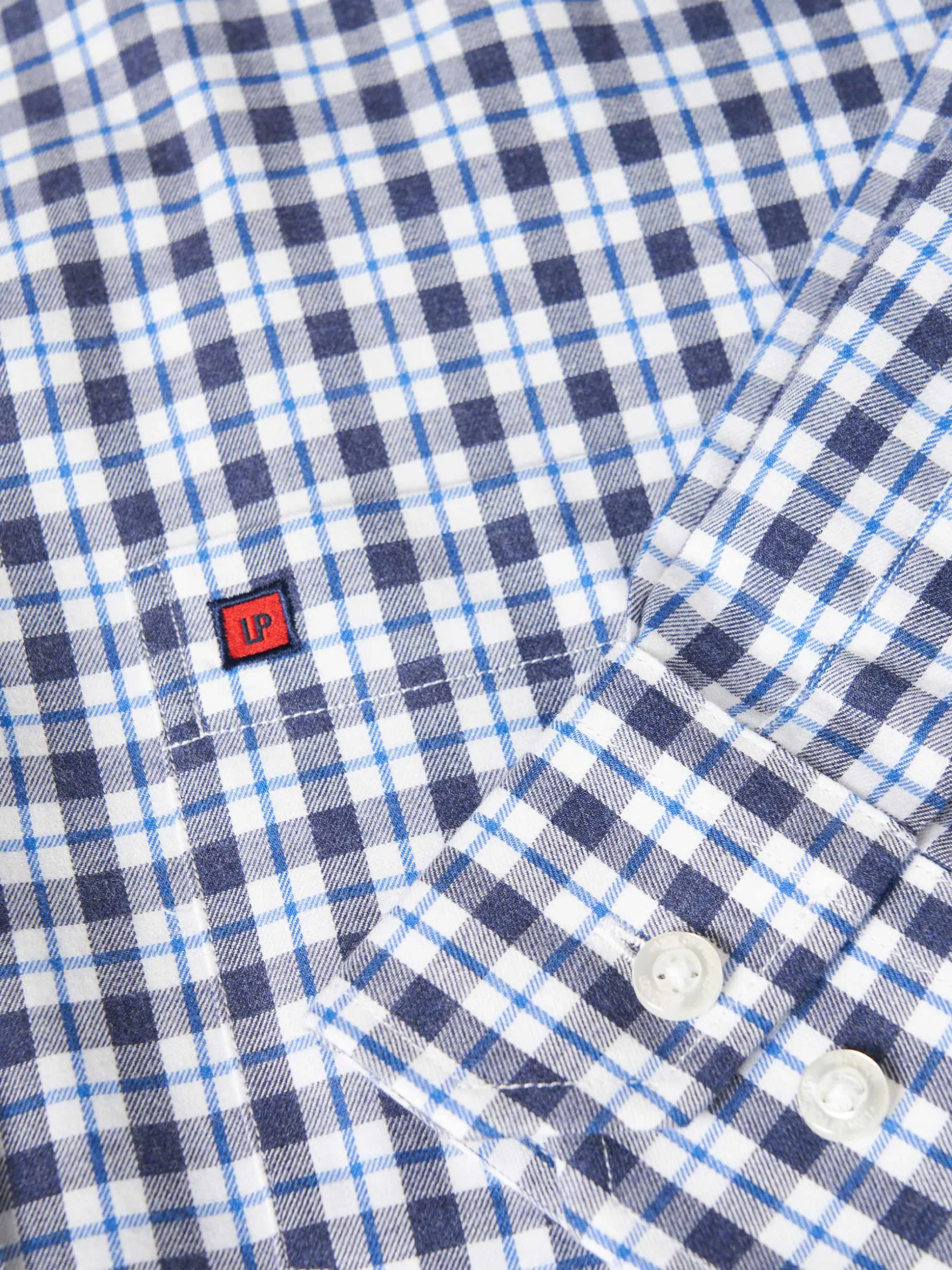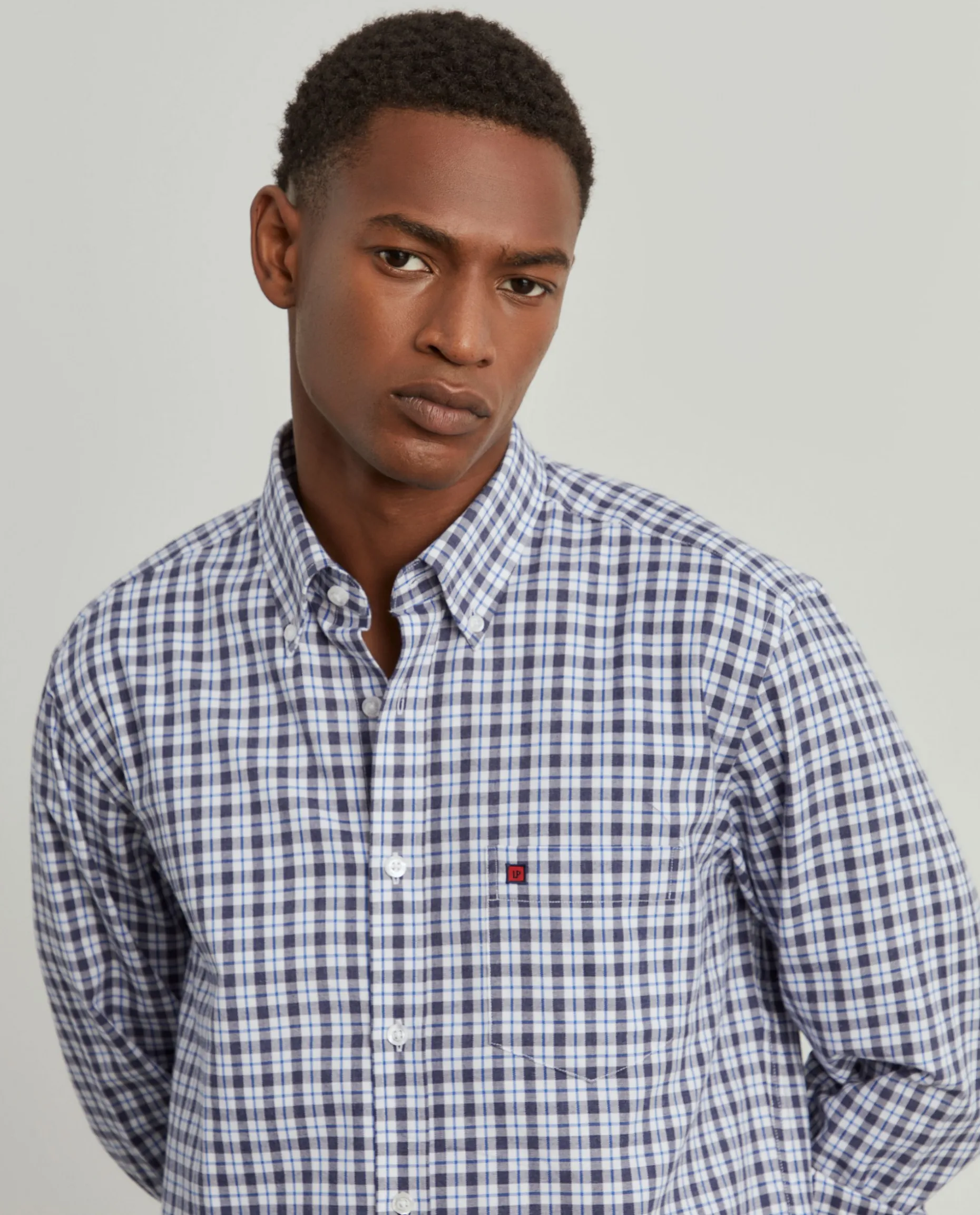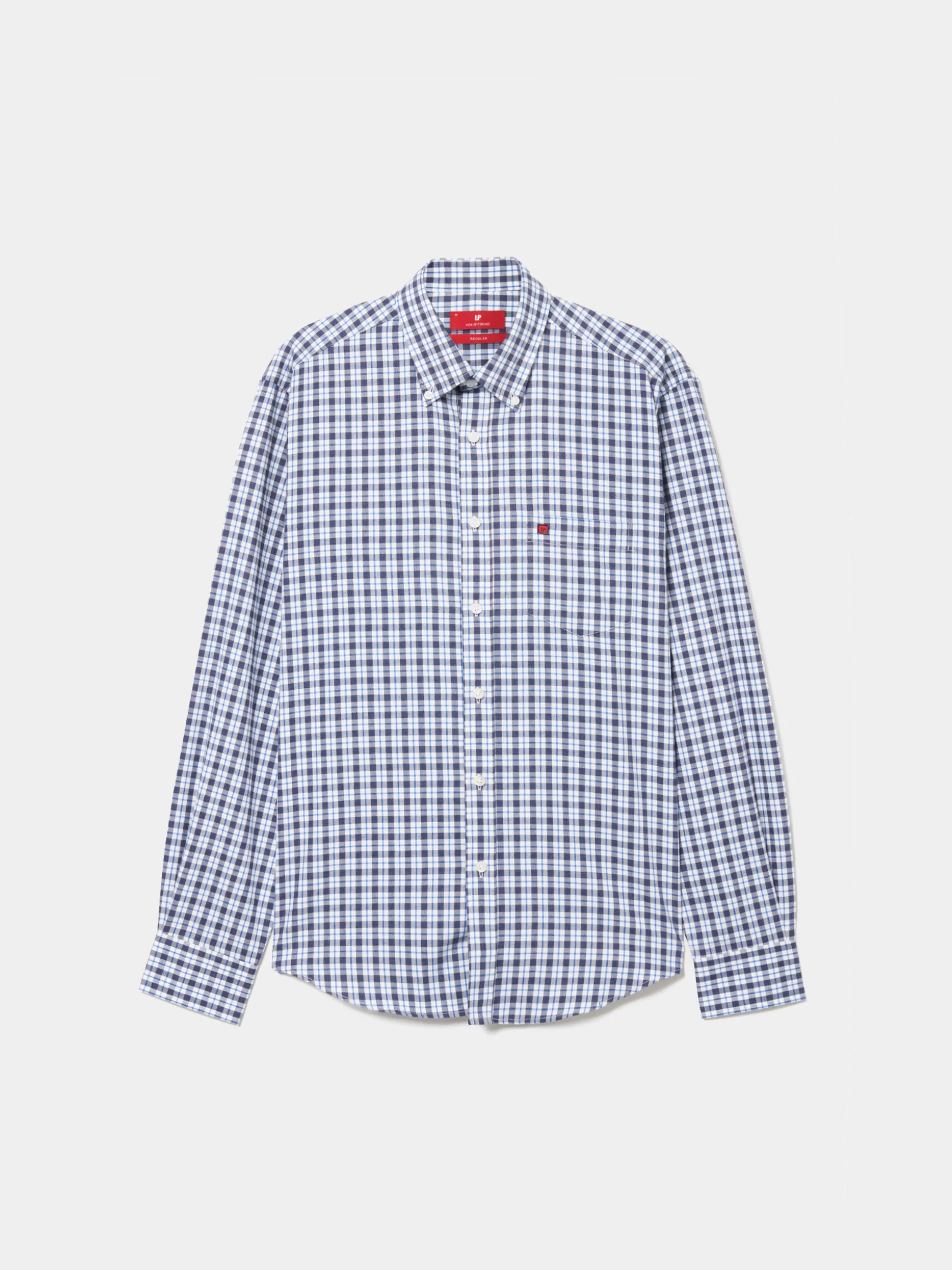 Camisa Regular Fit. Colarinho com dois botões. Bolso no peito com bordado personalizado. Botões personalizados. Macho de pregas nas costas. Fita decorativa no decote costas.