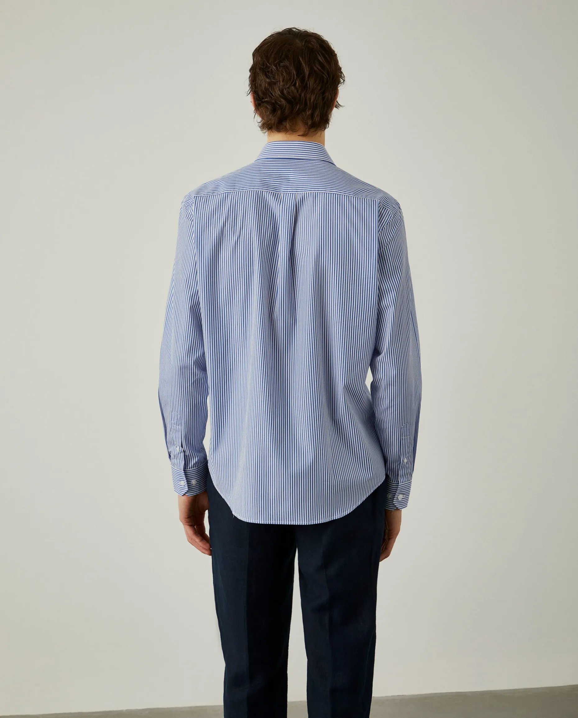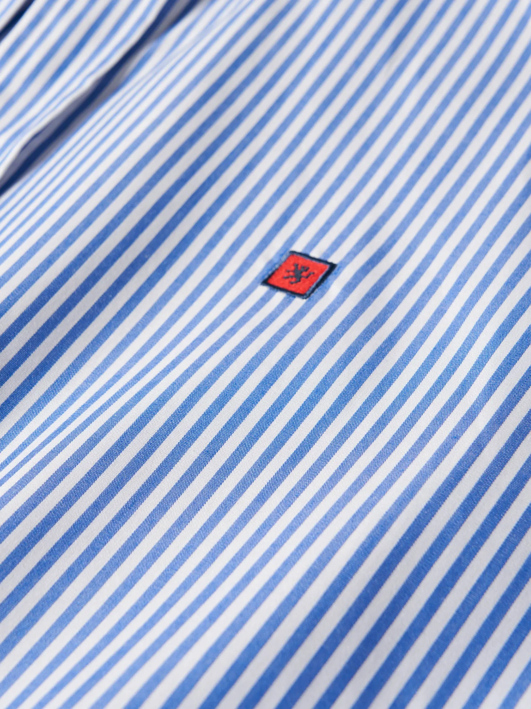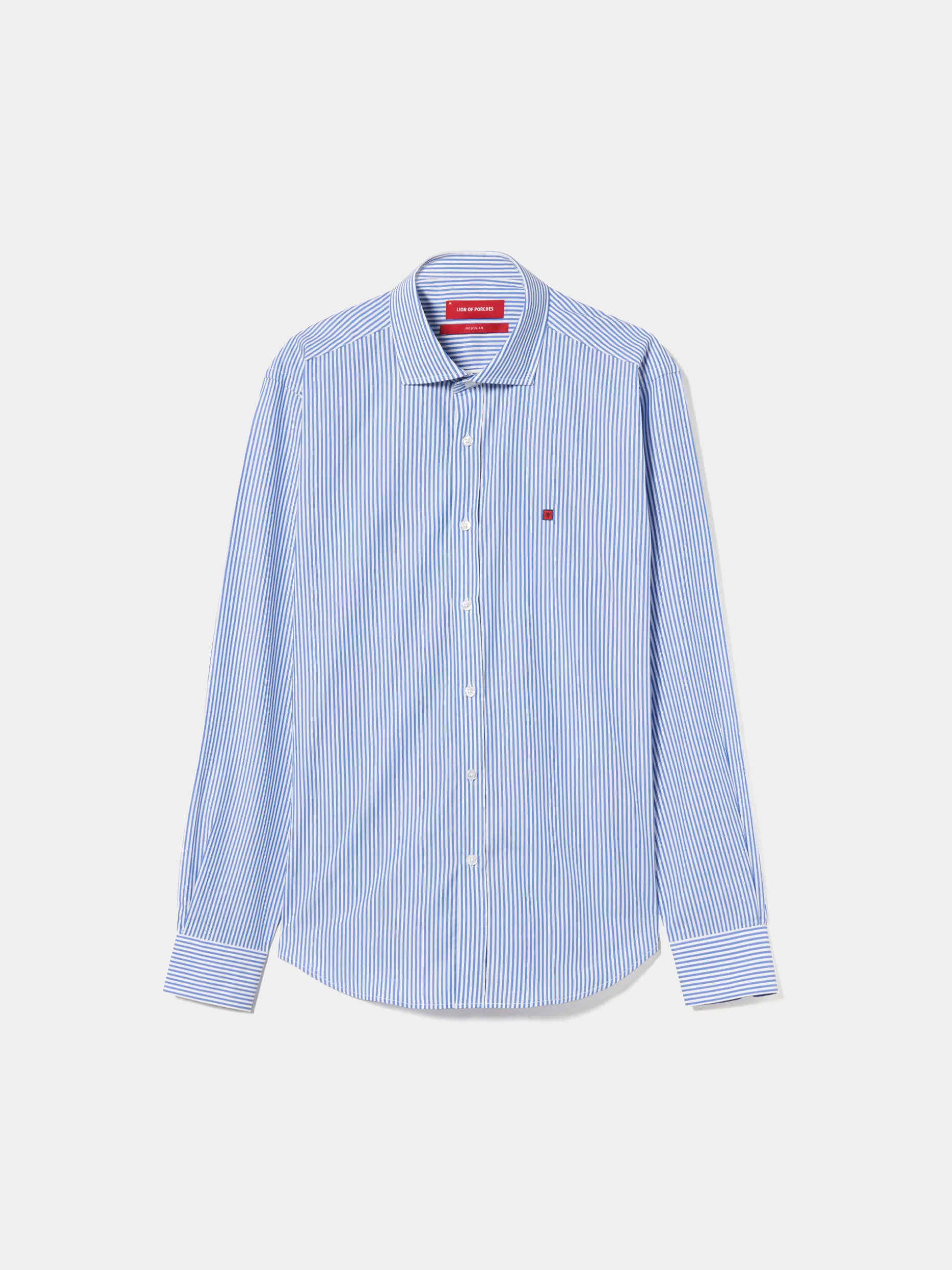 Camisa regular fit. Tecido com padrão de riscas. Colarinho “cutaway”. Branding Lion of Porches no peito. Botões personalizados.
