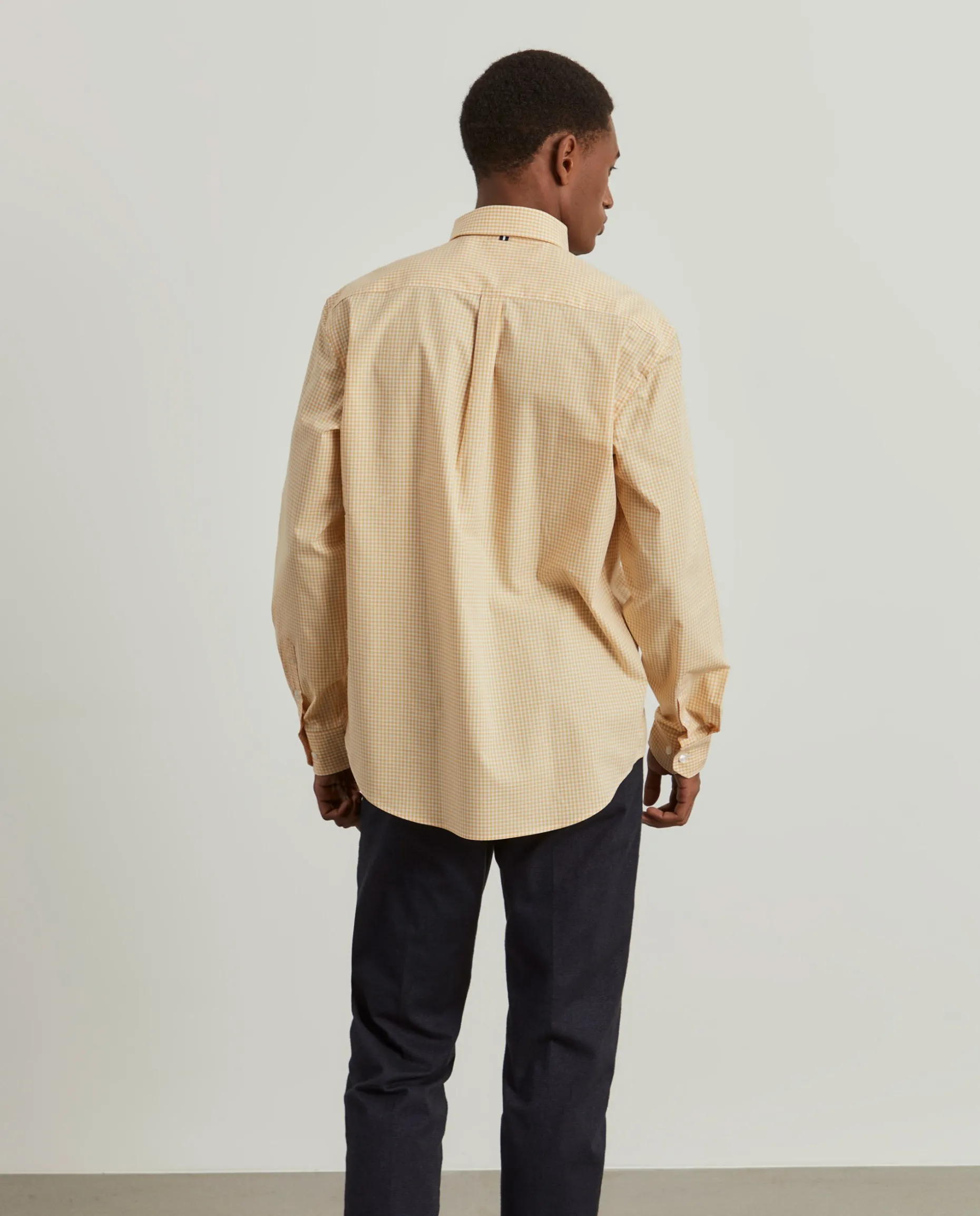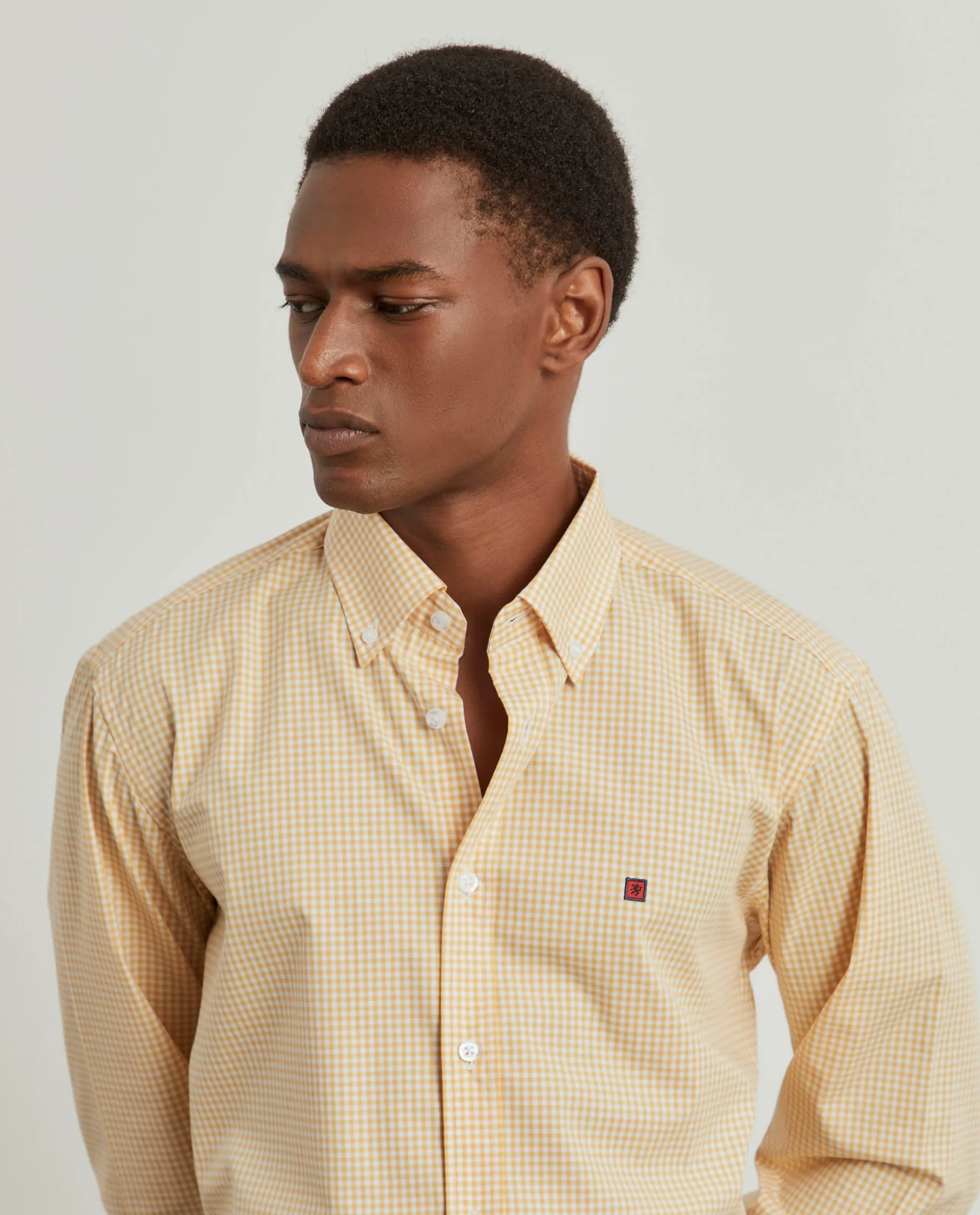 Camisa regular fit. Tecido com padrão de quadrados. Colarinho com dois botões. Branding Lion of Porches bordado no peito. Botões personalizados. Detalhe da fita de riscas atrás da gola.