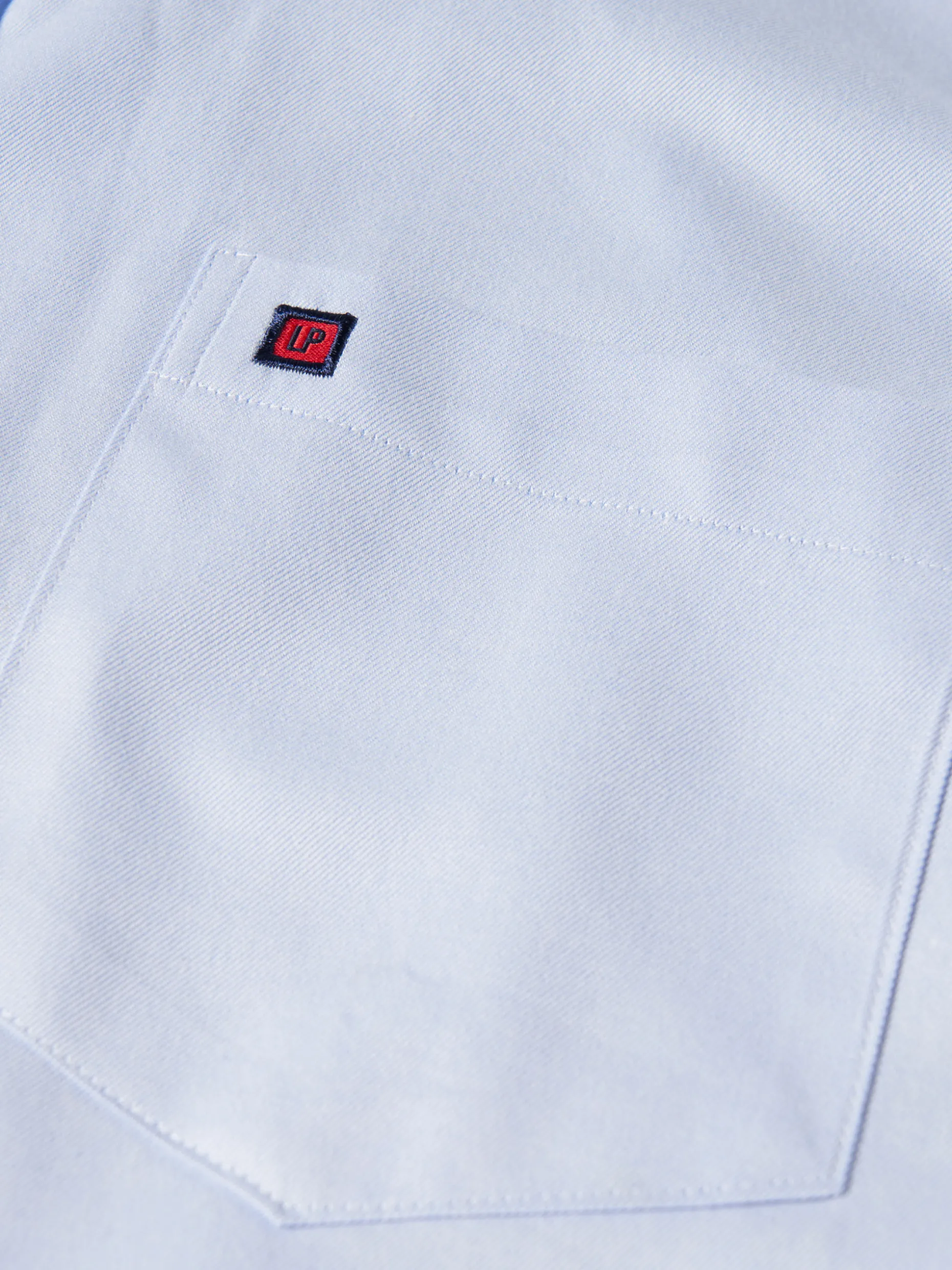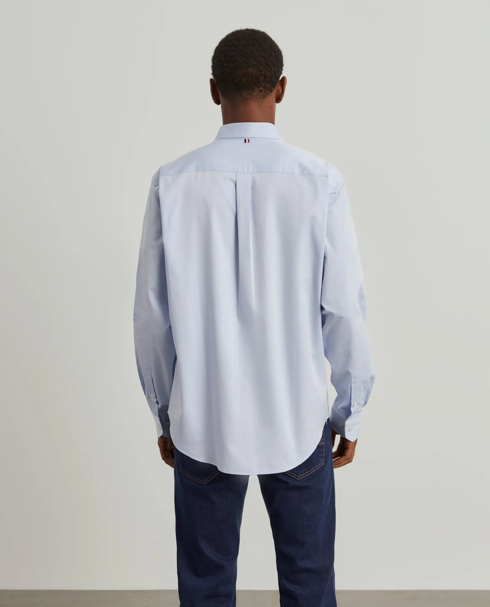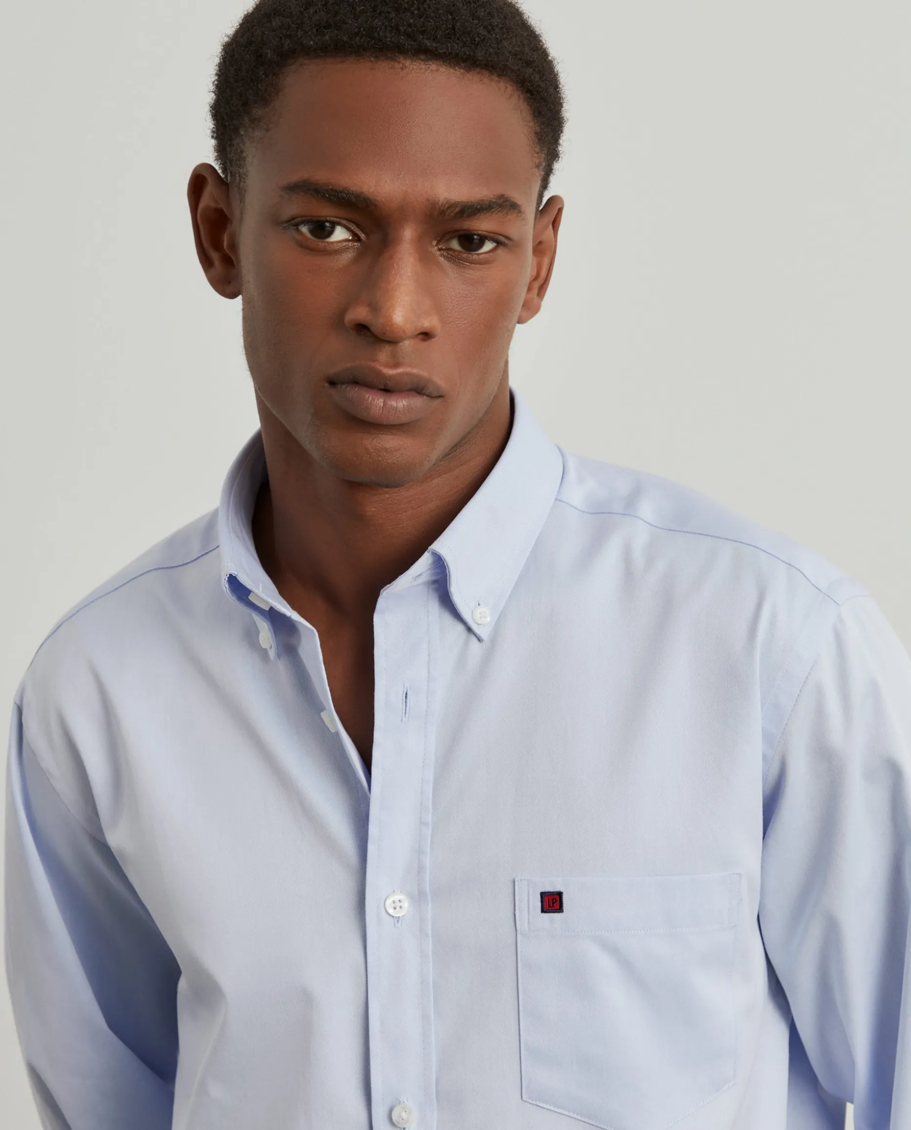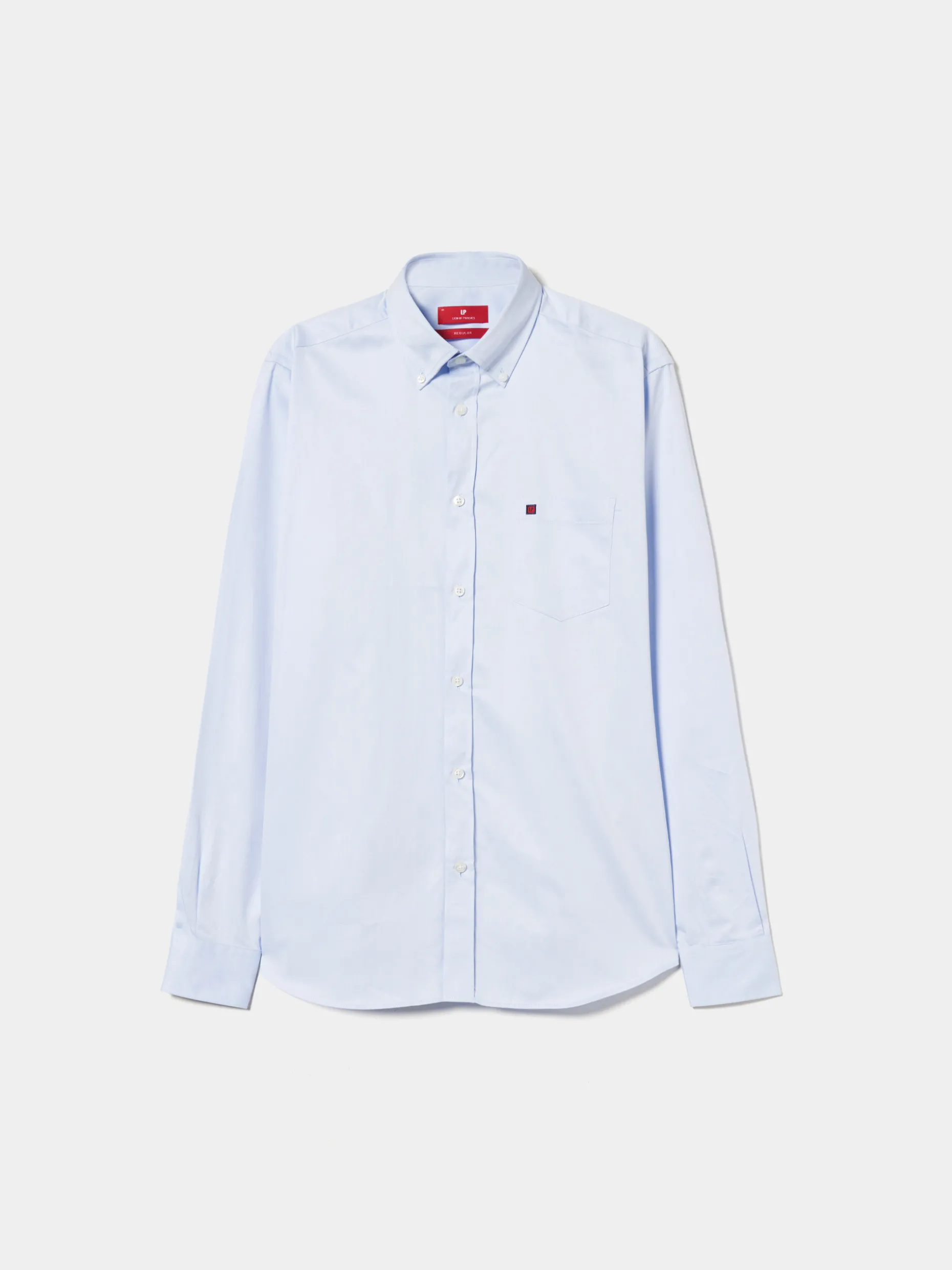 Camisa regular fit confecionada em popelina 100% algodão. Colarinho com dois botões. Bolso no peito com bordado personalizado. Botões personalizados. Macho de pregas nas costas.