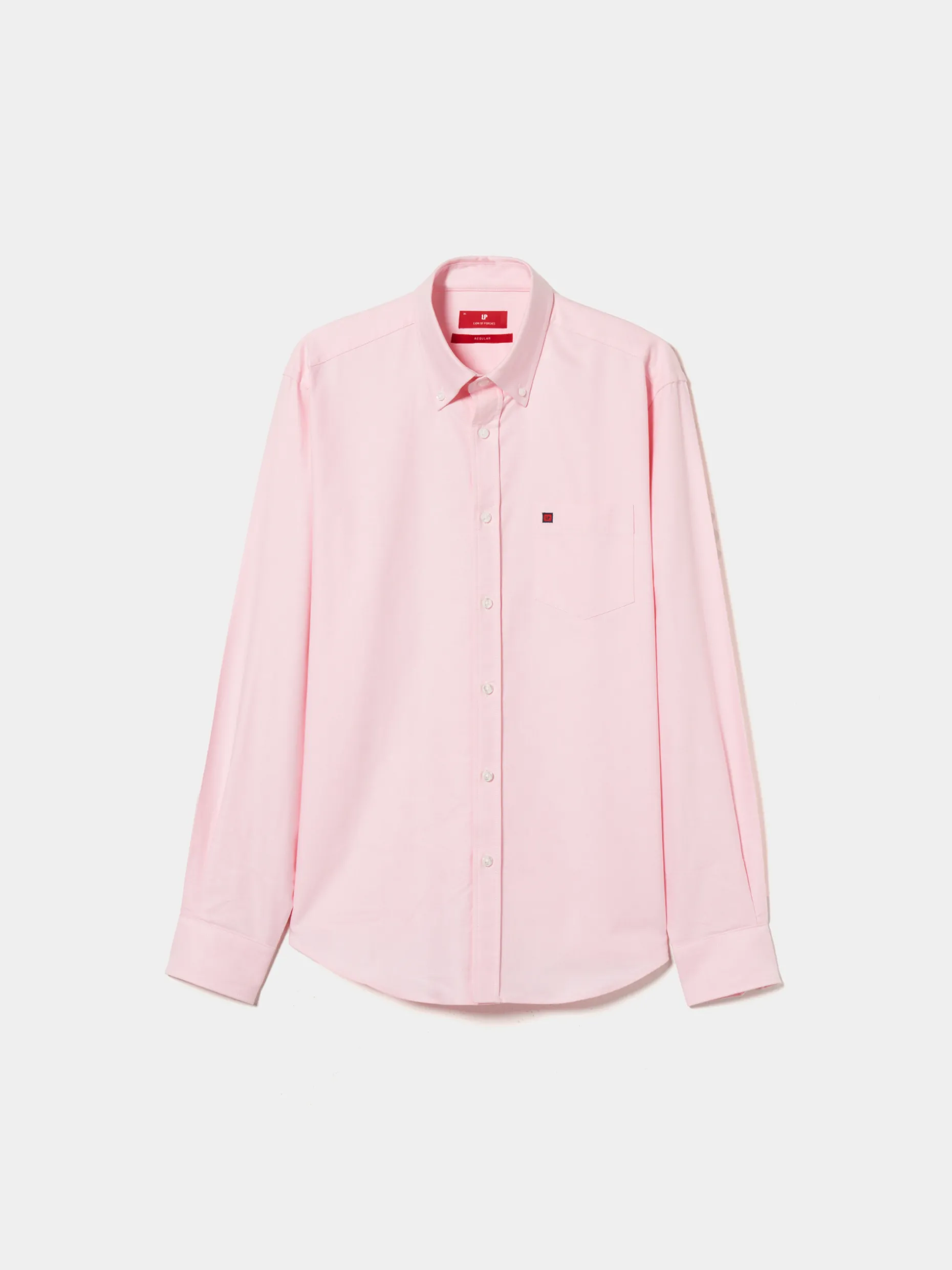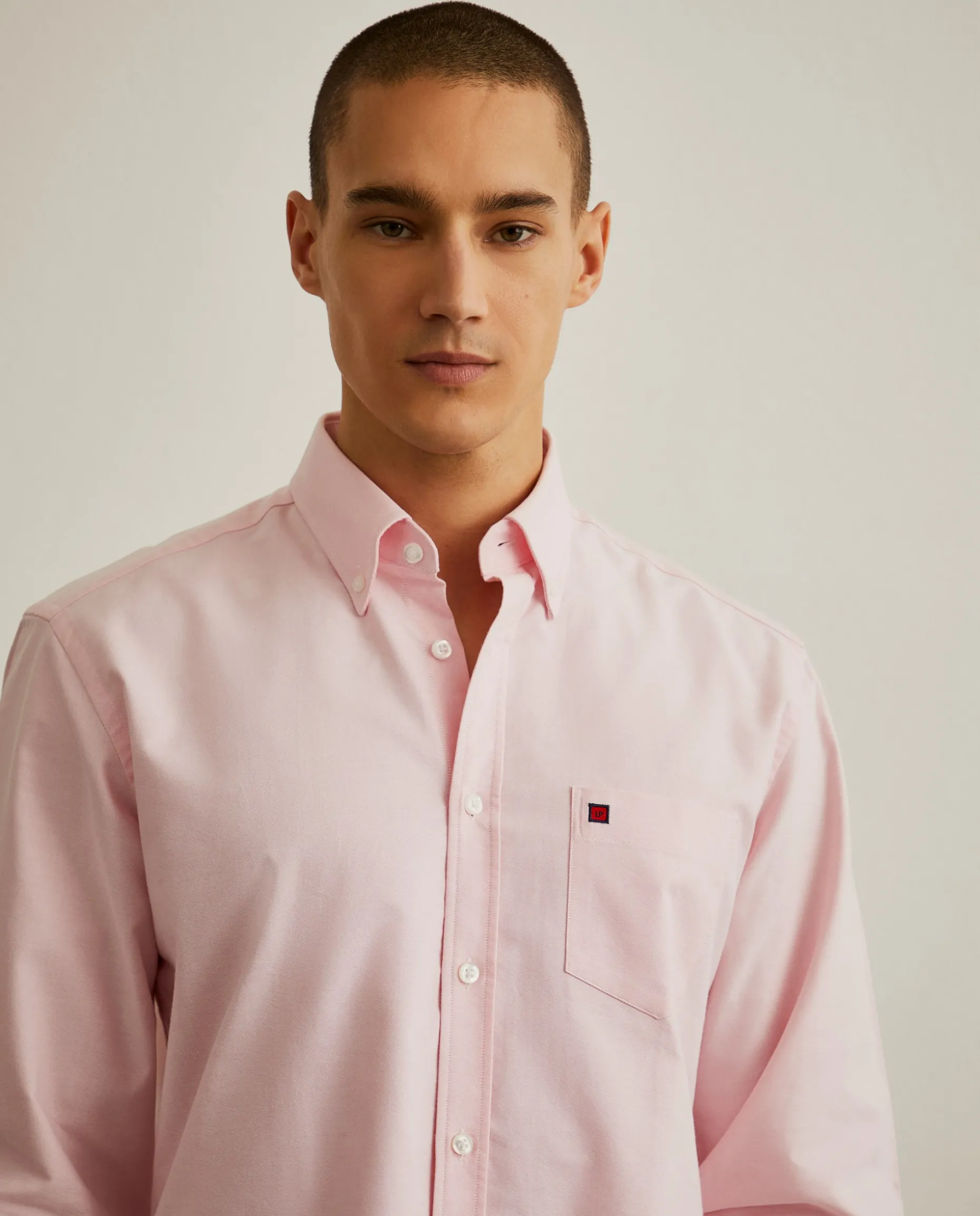 Camisa oxford regular fit. Colarinho com dois botões. Bolso no peito com bordado Lion of Porches. Botões personalizados. Macho de pregas nas costas.