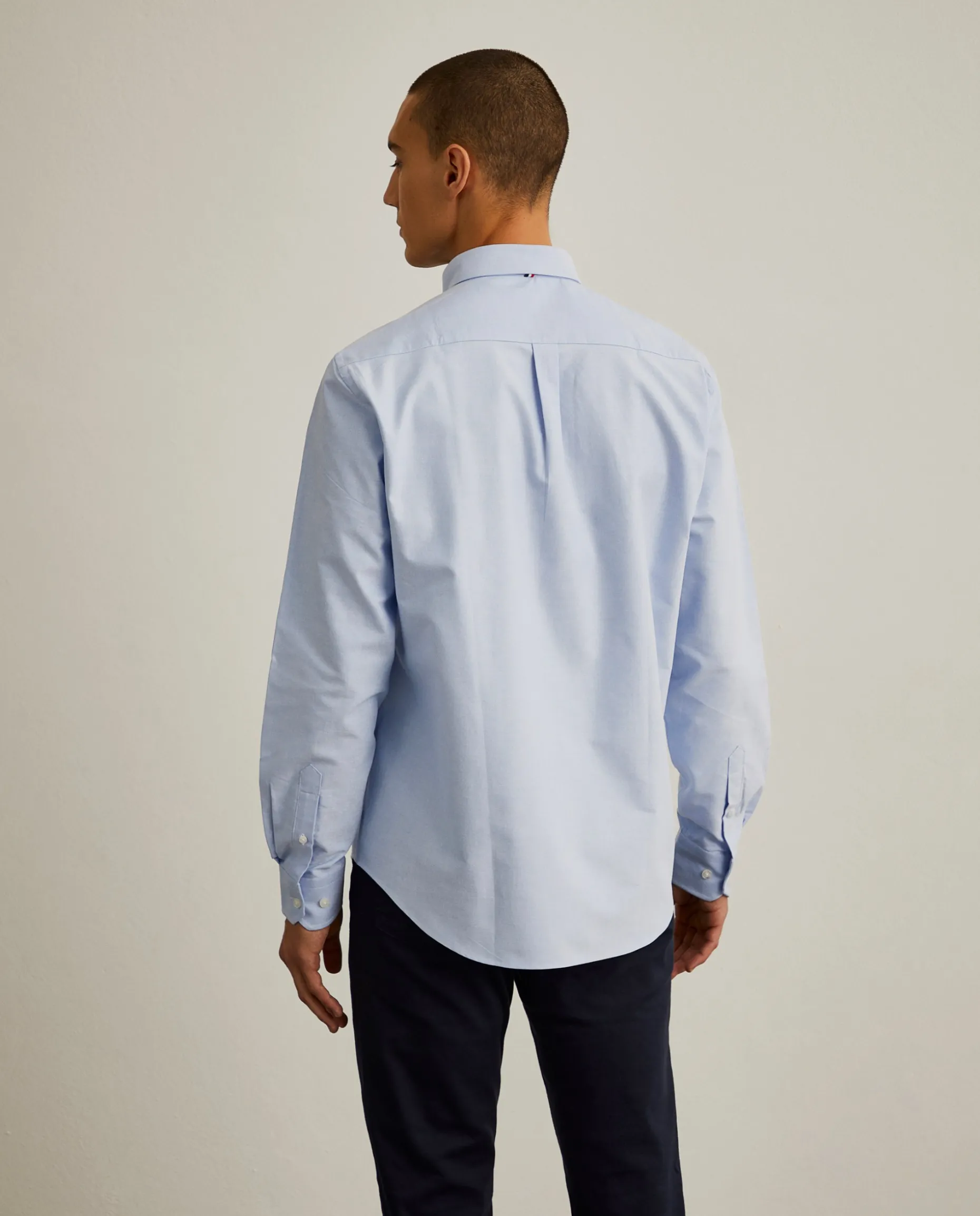 Camisa oxford regular fit. Colarinho com dois botões. Bolso no peito com bordado Lion of Porches. Botões personalizados. Macho de pregas nas costas.