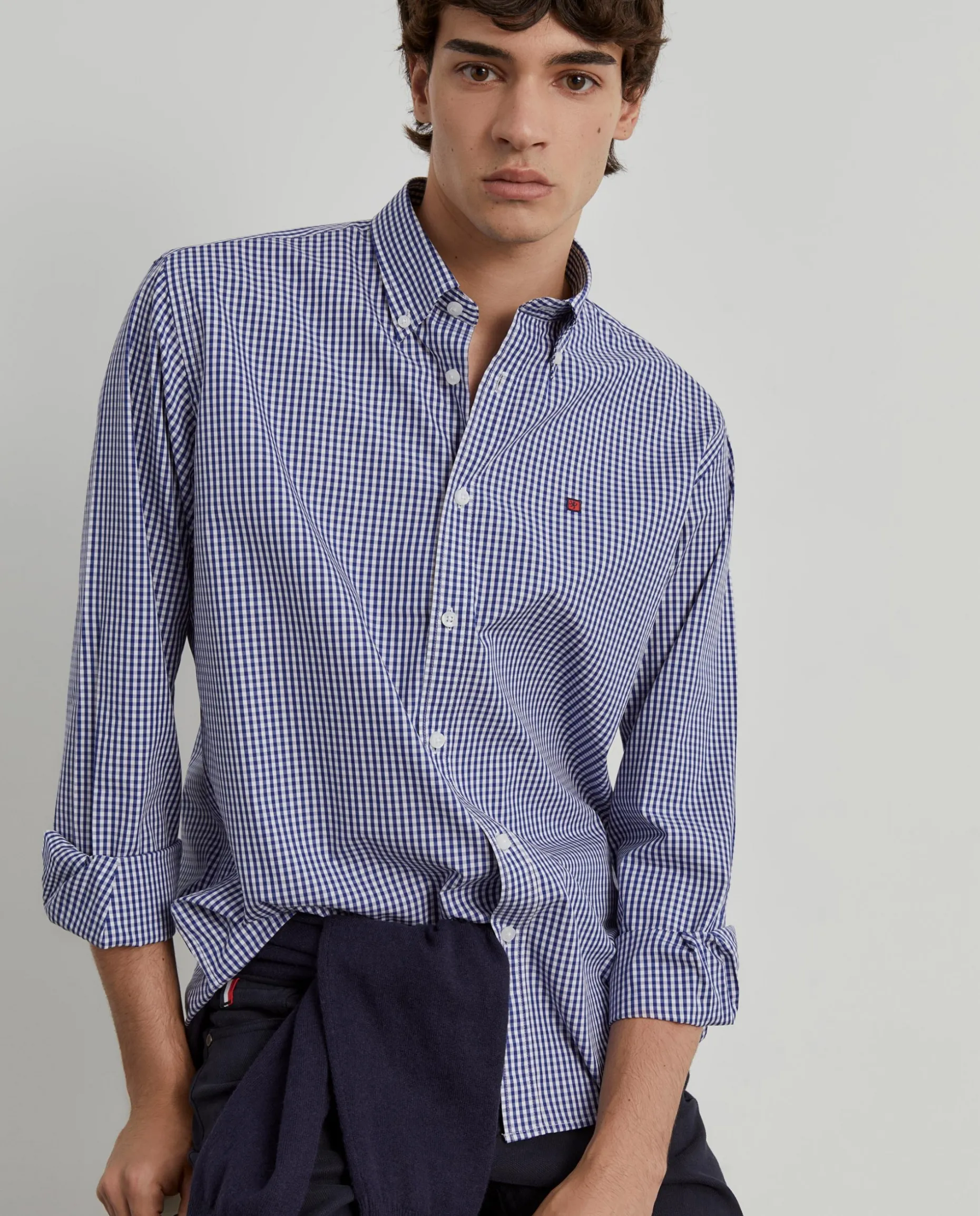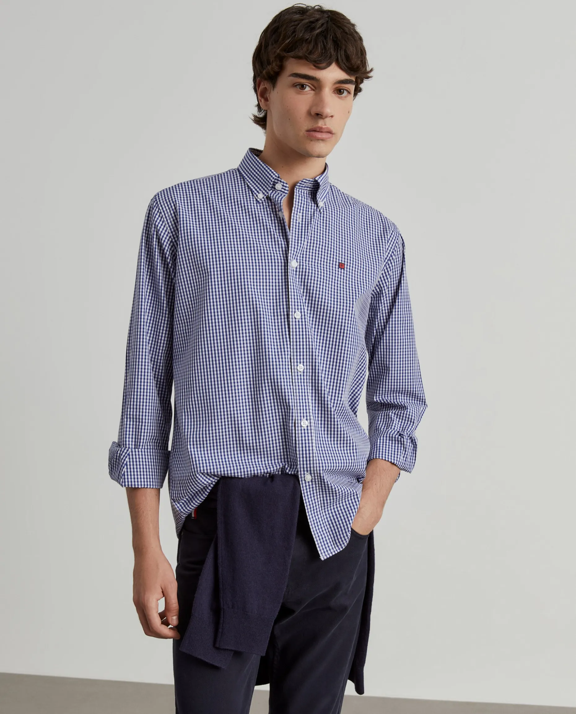 Camisa Regular Fit em tecido com padrão de quadrados. Colarinho com dois botões. Bordado personalizado no peito. Botões personalizados.