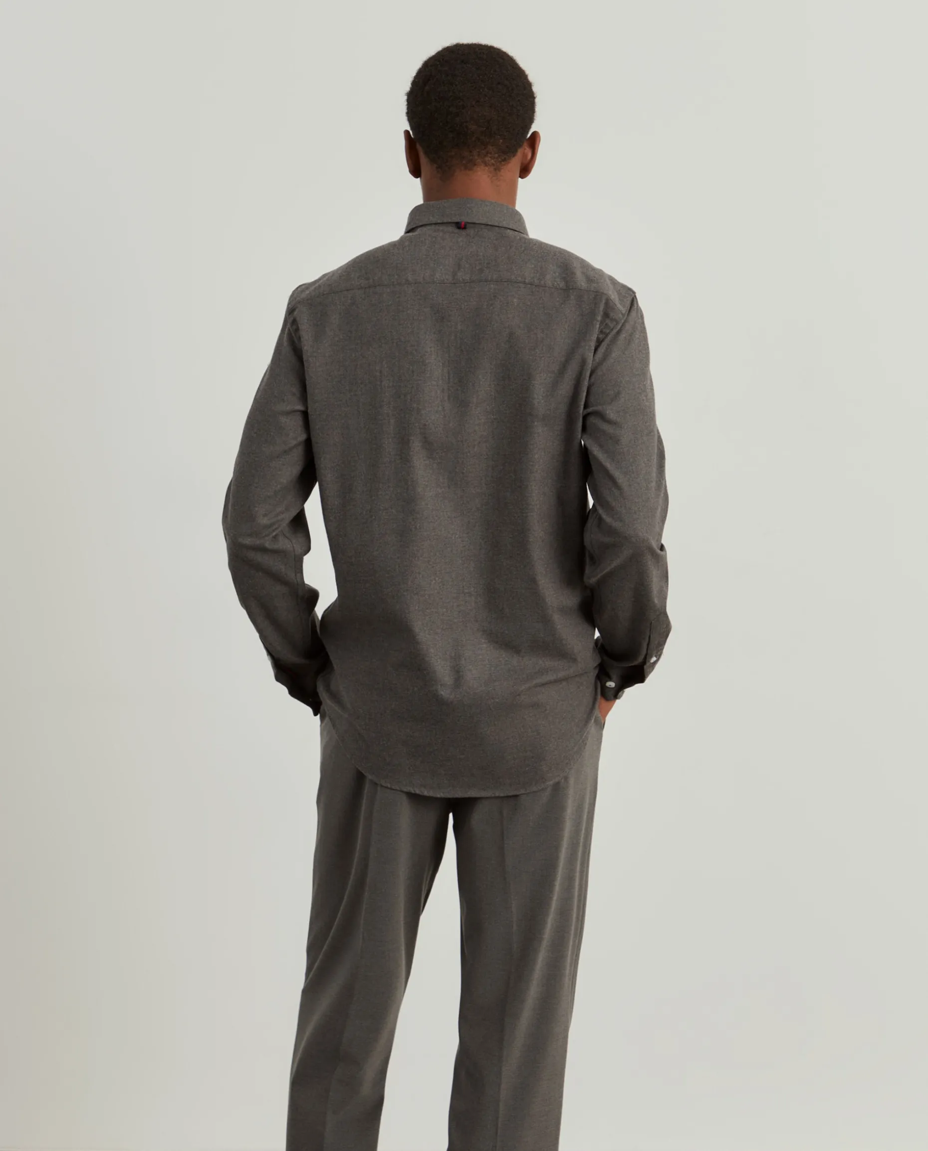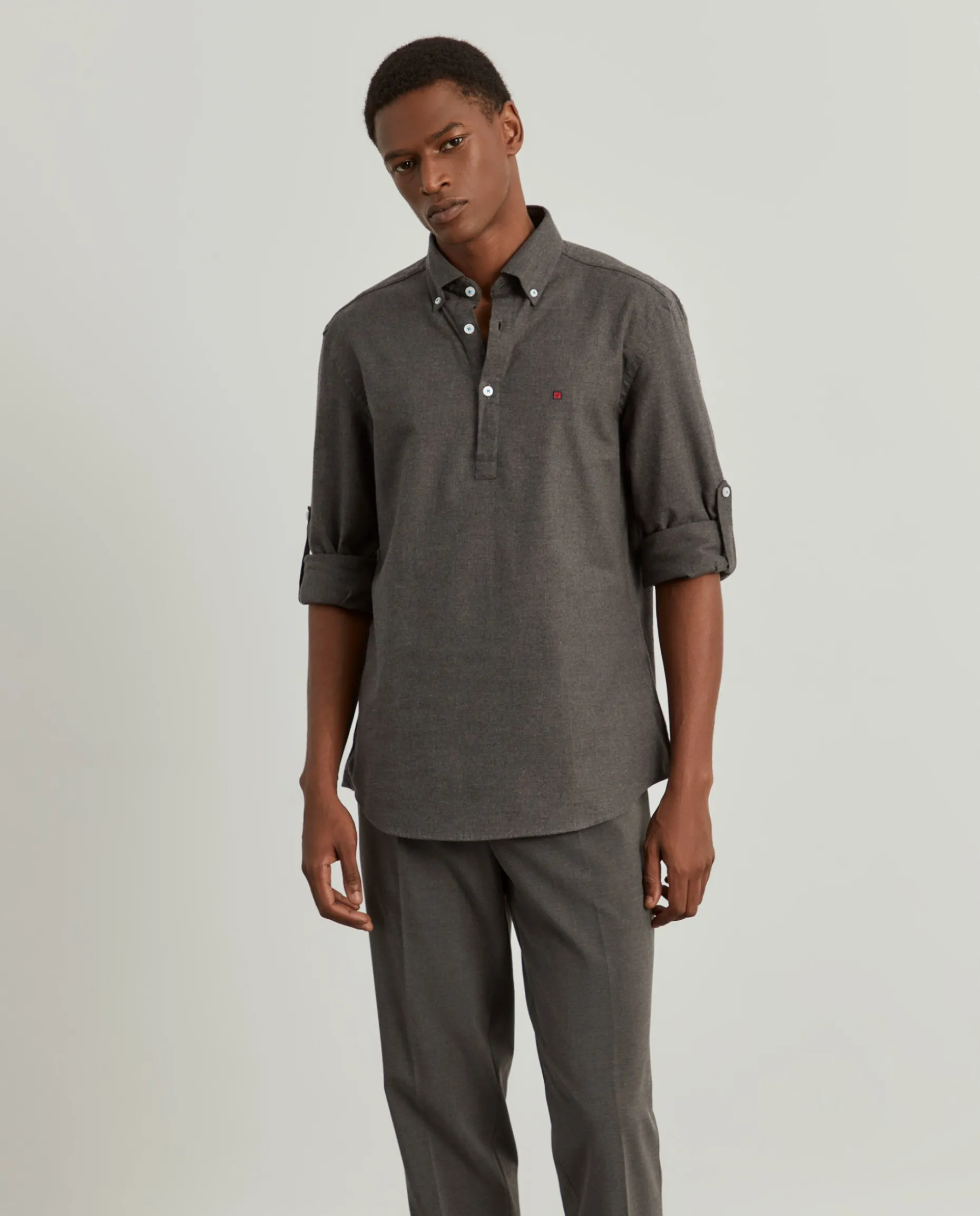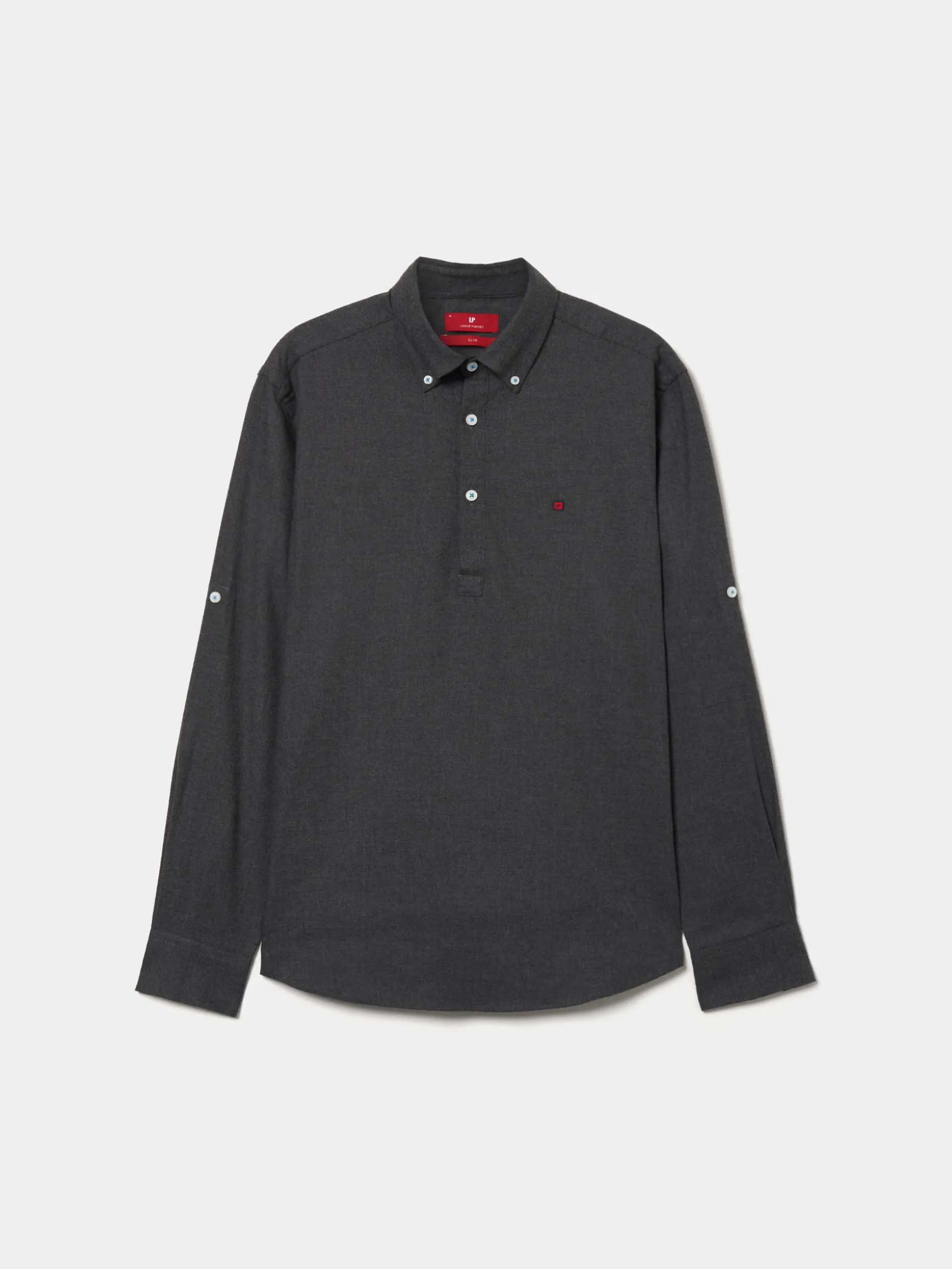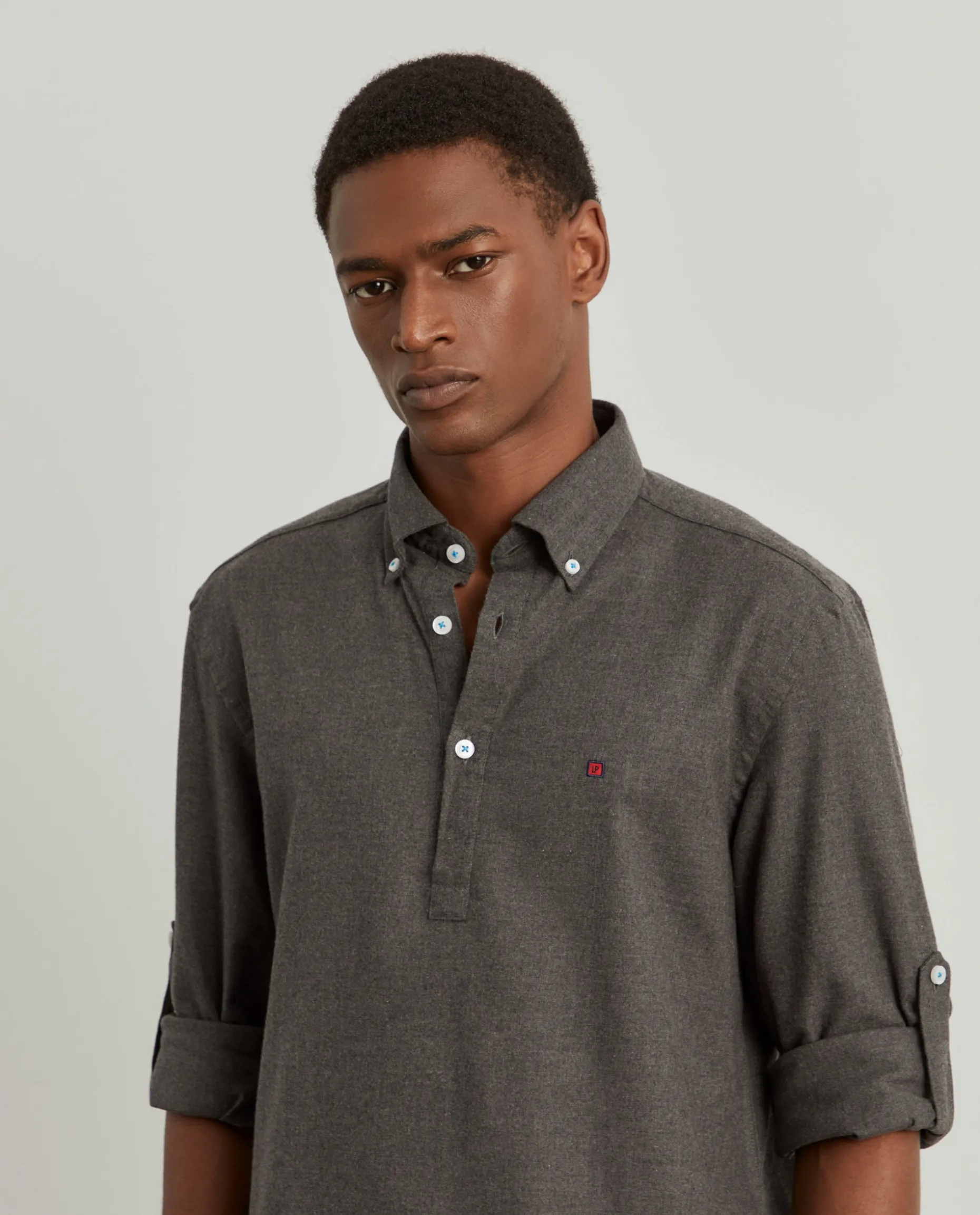 Camisa Slim Fit com carcela de polo. Colarinho com dois botões. Bordado personalizado no peito. Presilhas ajustáveis nas mangas. Fita decorativa nas carcelas dos punhos. Botões personalizados. Fita decorativa no decote costas.