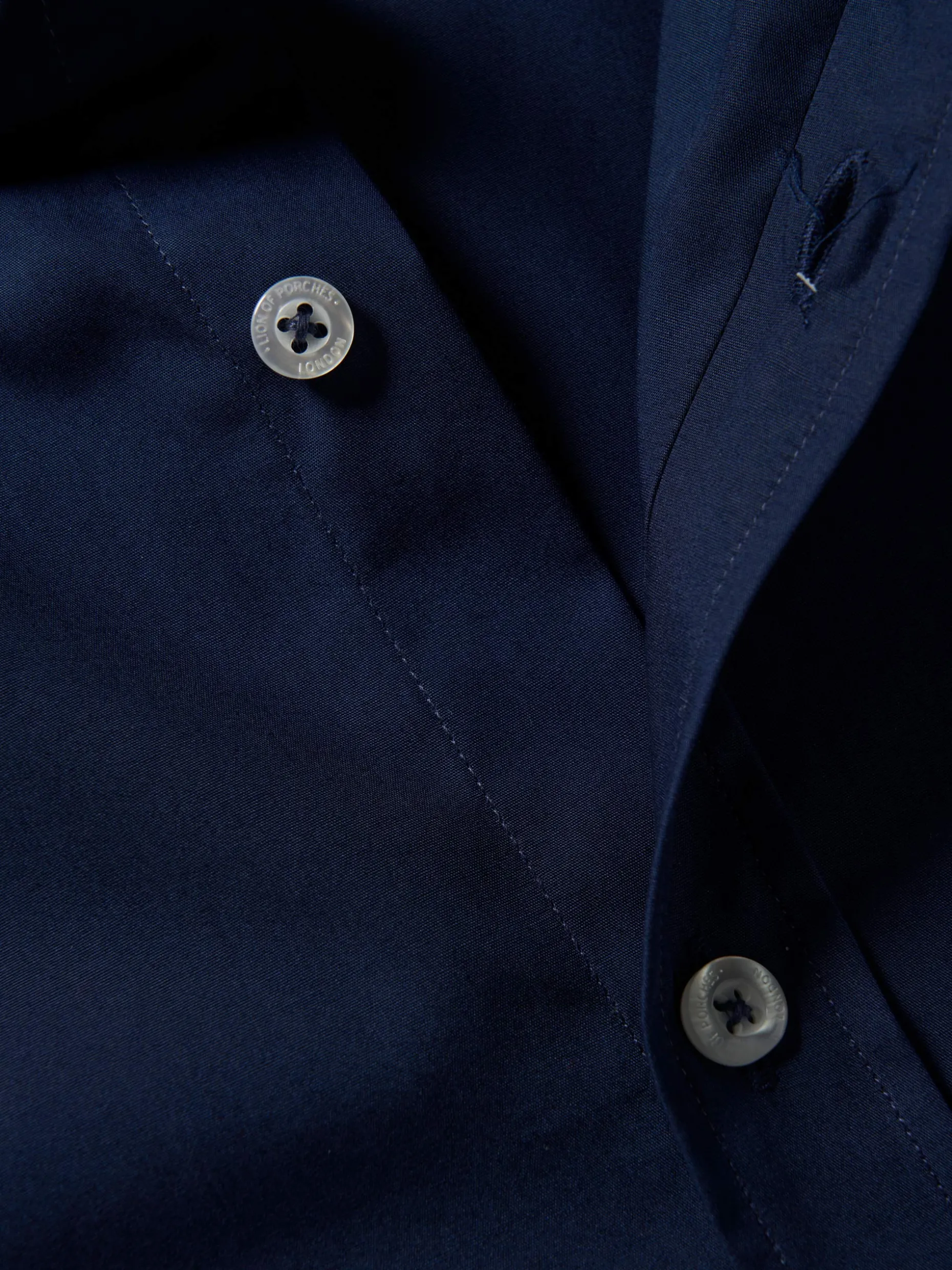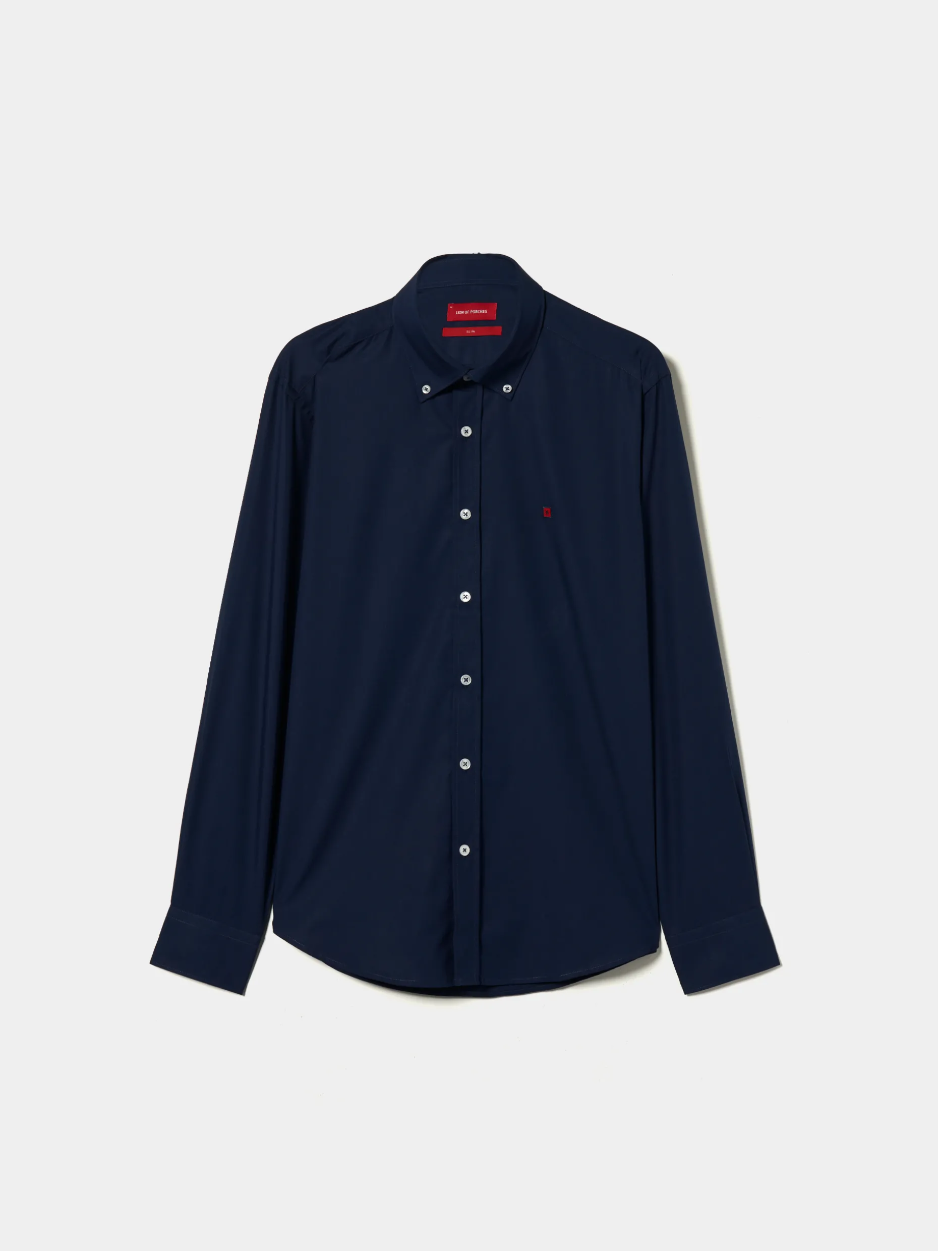 Camisa Slim Fit. Tecido de popelina. Colarinho com dois botões. Bordado personalizado no peito. Botões personalizados.