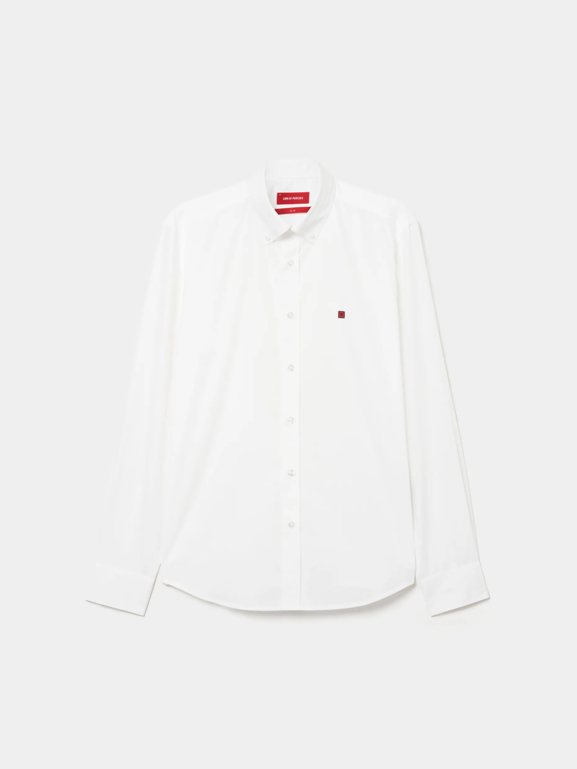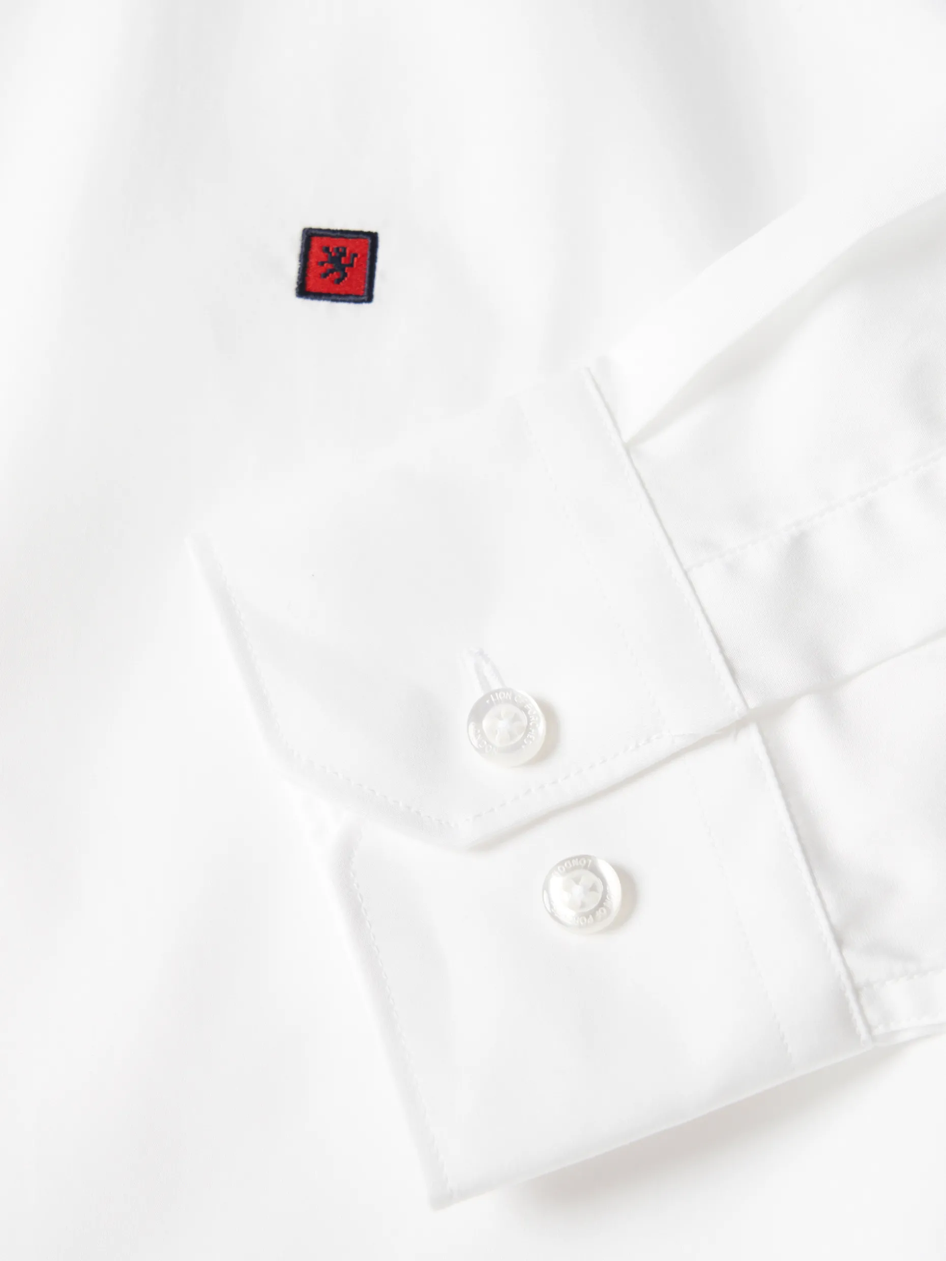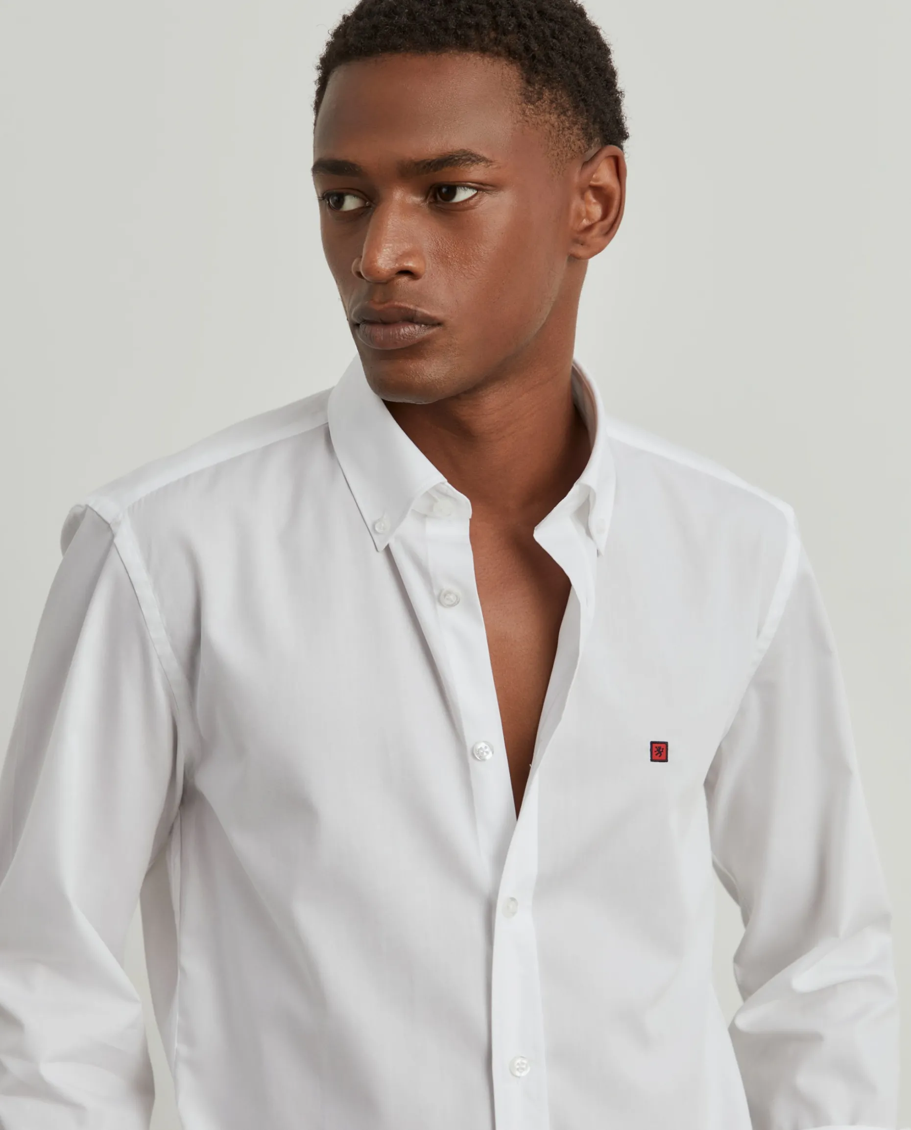 Camisa Slim Fit. Tecido de popelina. Colarinho com dois botões. Bordado personalizado no peito. Botões personalizados.