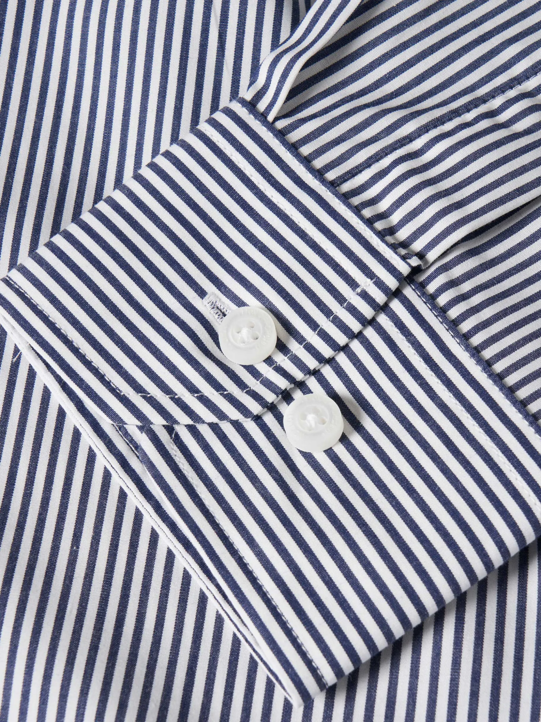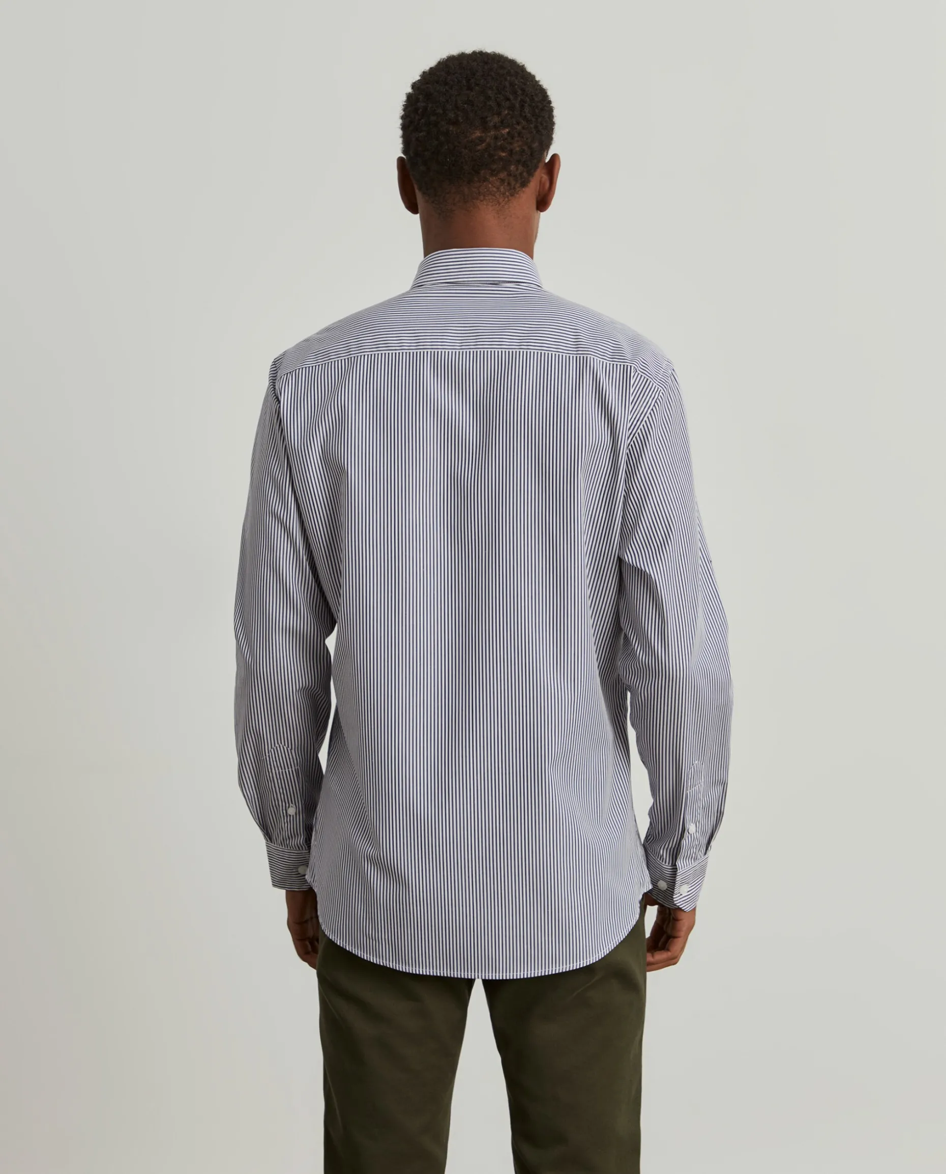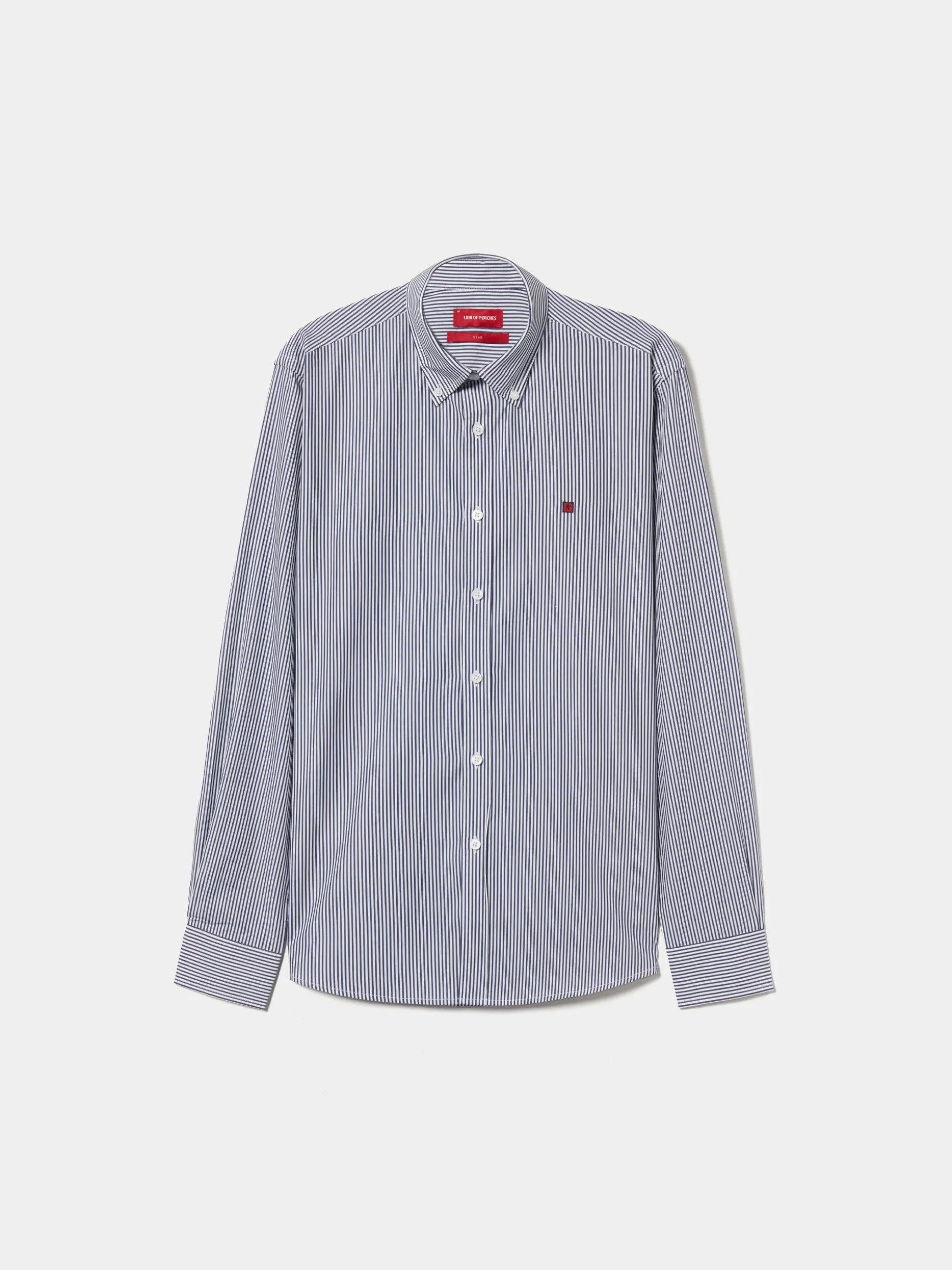 Camisa Slim Fit em tecido com padrão de riscas. Colarinho com dois botões. Bordado personalizado no peito. Botões personalizados.