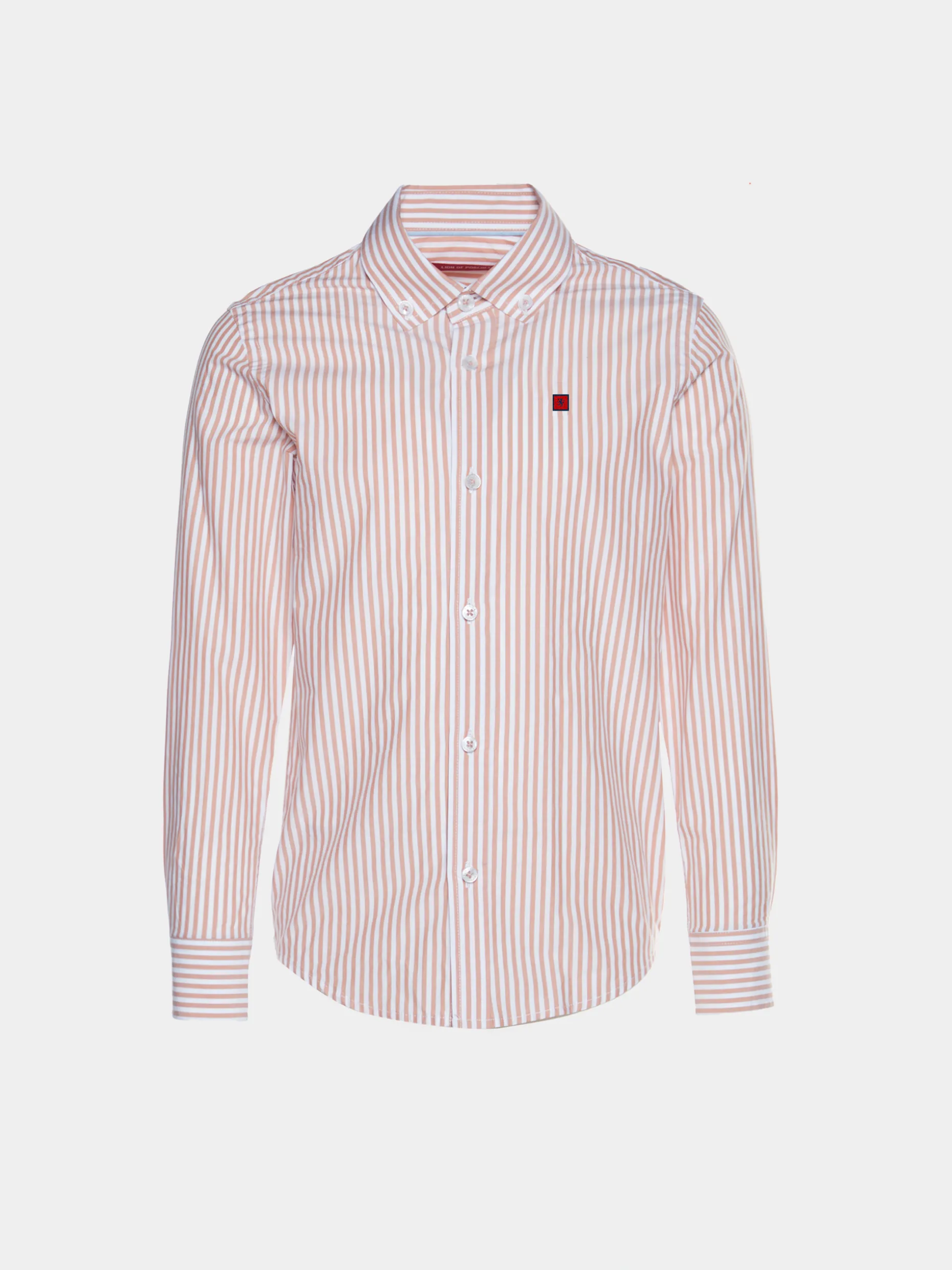 Camisa slim fit às riscas. Branding Lion of Porches bordado no peito. Vivo em contraste no interior da gola e punhos.