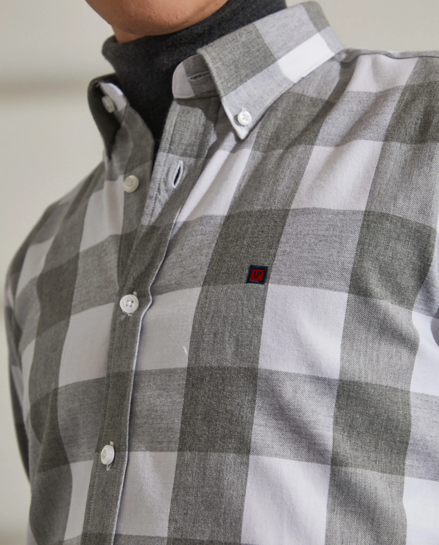 Camisa Slim Fit. Colarinho com dois botões. Bordado personalizado no peito. Botões personalizados. Fita decorativa no decote costas.