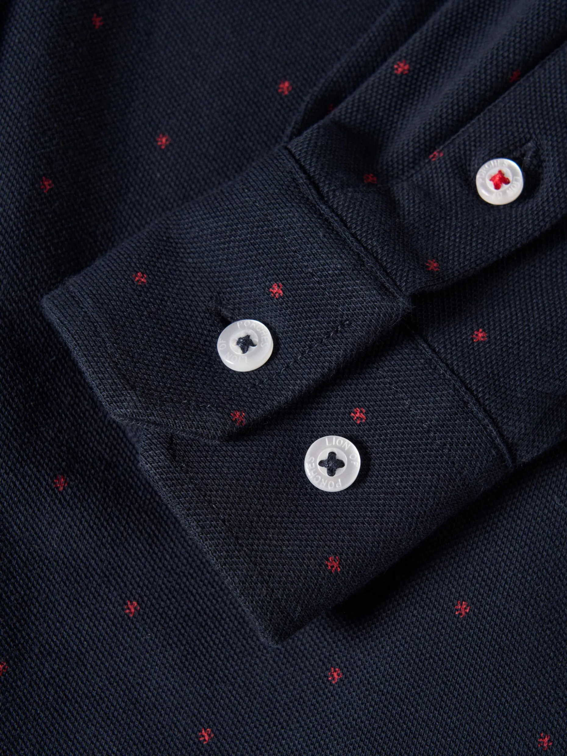 Camisa slim fit manga comprida em malha toda estampada leões com etiqueta leão no peito. Botões personalizados. Vivo no interior da gola e punhos em contraste.