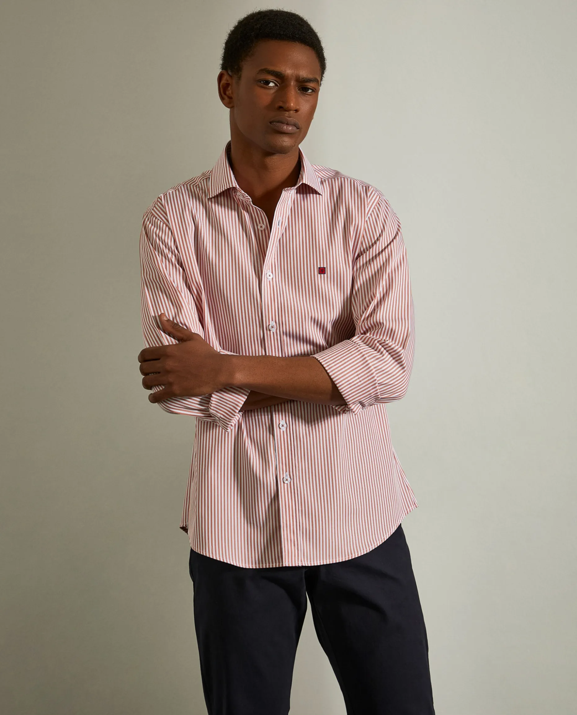 Camisa slim fit. Tecido com padrão de riscas. Colarinho “cutaway”. Branding Lion of Porches bordado no peito. Botões personalizados.