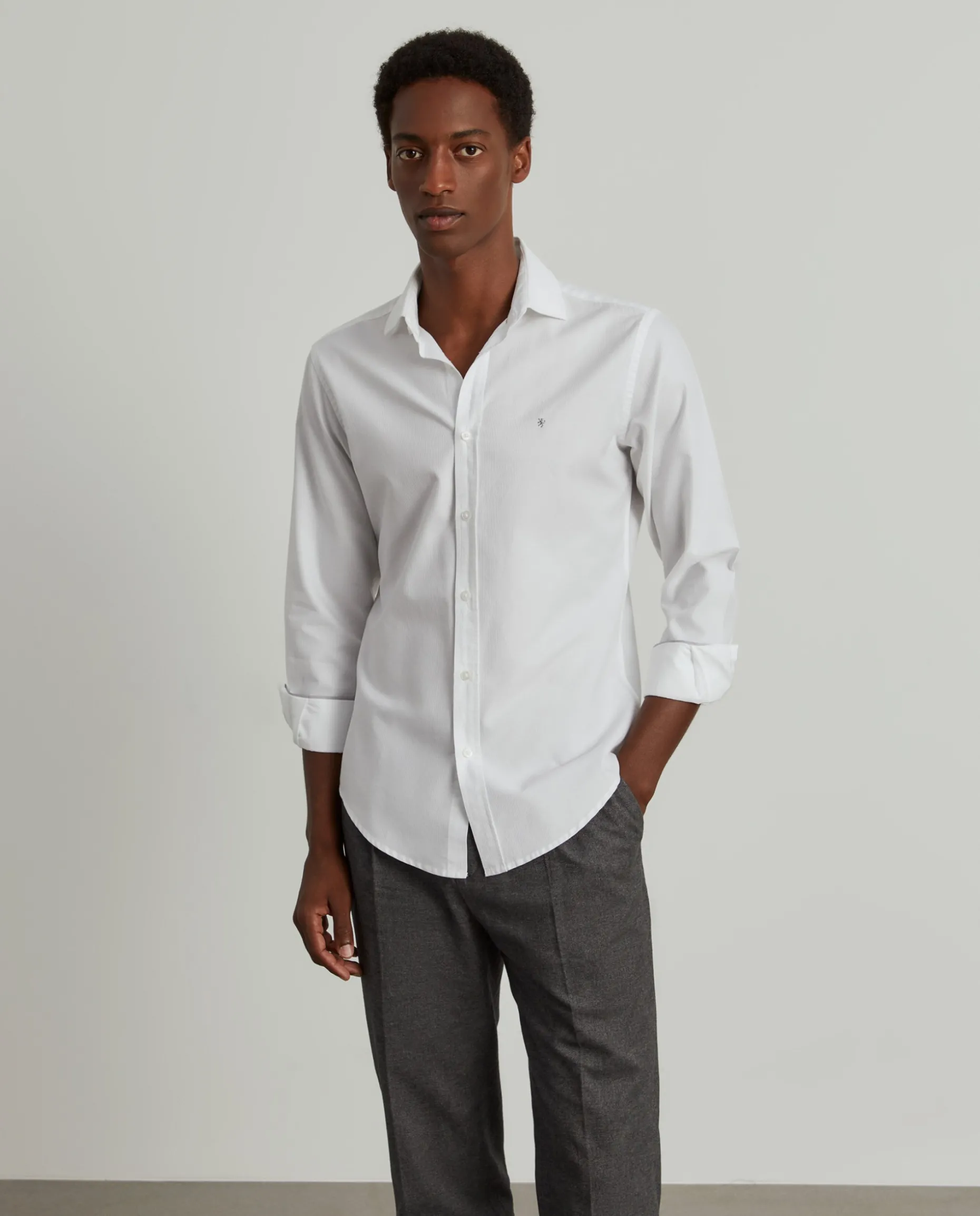 Indispensável no guarda-roupa masculino, esta camisa tem corte slim fit e colarinho “cutaway”. É confecionada, na totalidade, em algodão, num tecido com um ligeiro relevo que dá um efeito de riscas subtis. Finaliza com pequeno leão da marca bordado no peito. Disponível em várias cores.