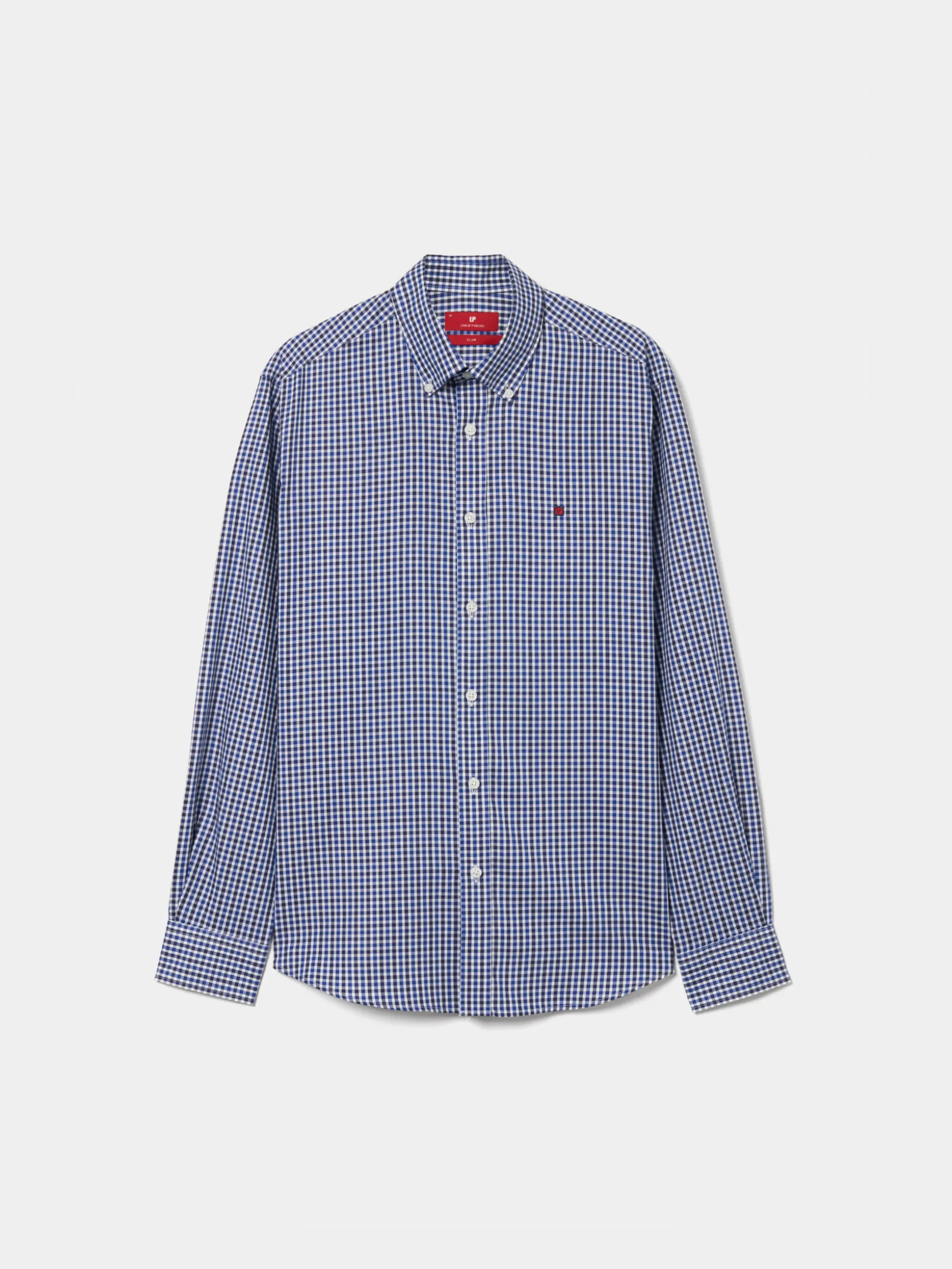 Camisa slim fit xadrez confecionado em popeline 100% algodão. Colarinho com dois botões. Bordado personalizado no peito. Botões personalizados.