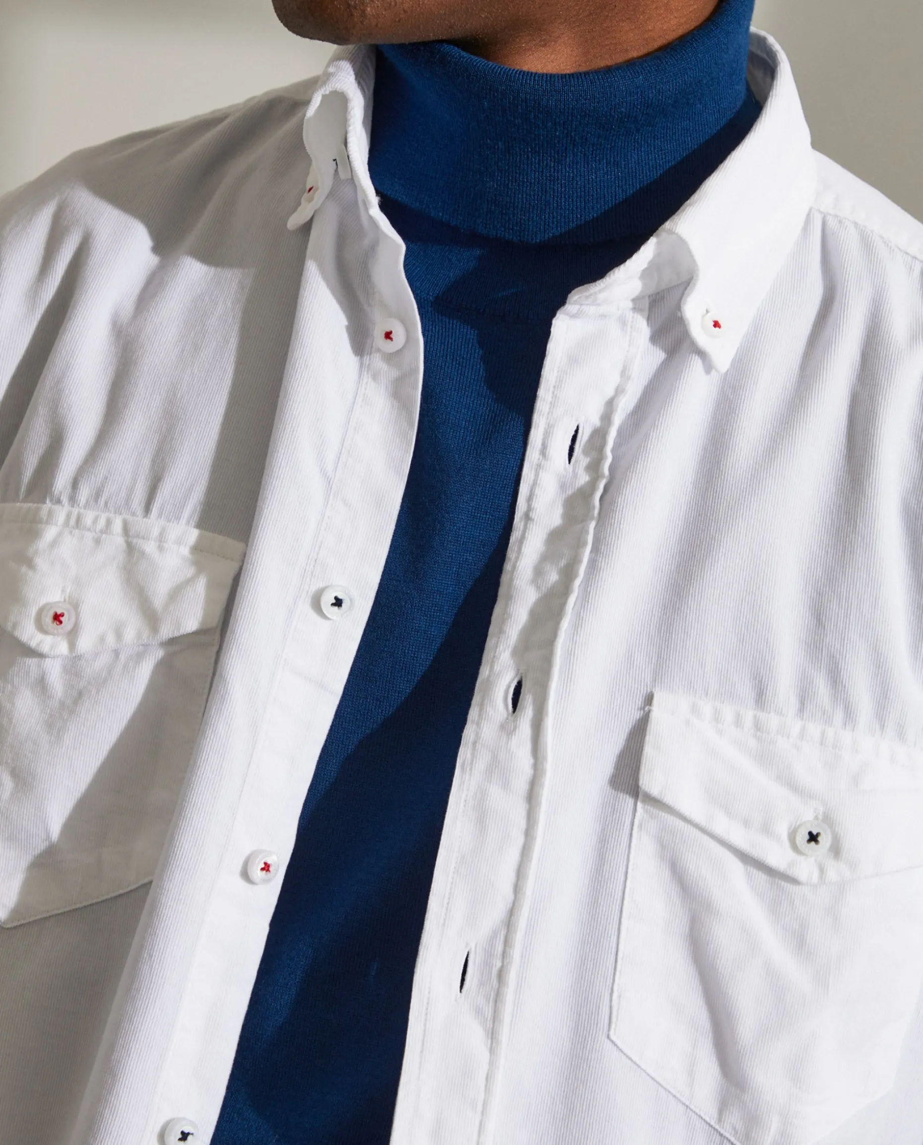 Camisa slim fit confecionada em bombazine. Dois bolsos no peito. Colarinho de dois botões. Bordado na carcela do punho. Aperta botões personalizados.