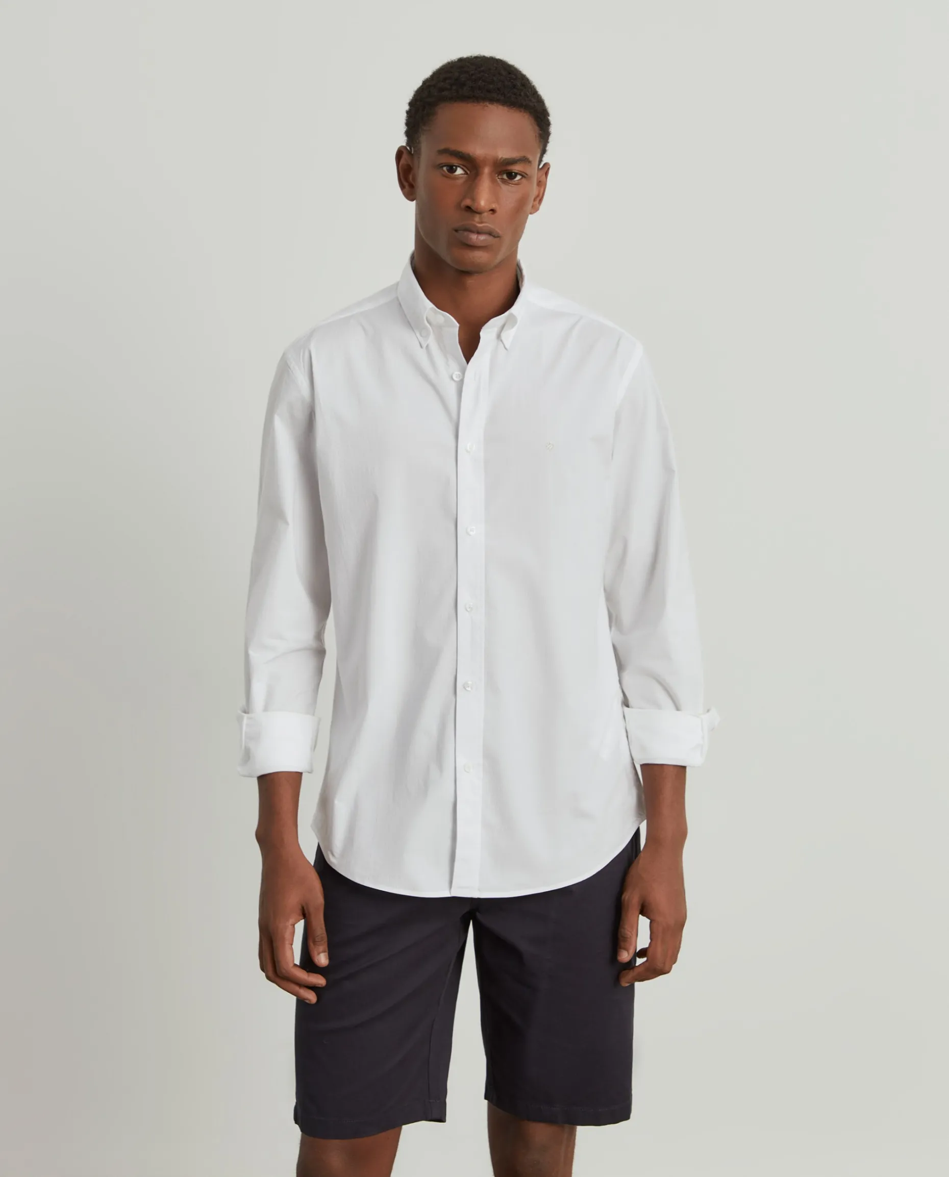 Camisa slim fit, de cor lisa, em popelina. Aperta com botões, não só na frente como no colarinho e punhos. Finaliza com pequeno leão da marca, em contraste de cor, no peito. É confecionada em algodão e finaliza com uma pequena percentagem de elastano para maior conforto e liberdade de movimentos.