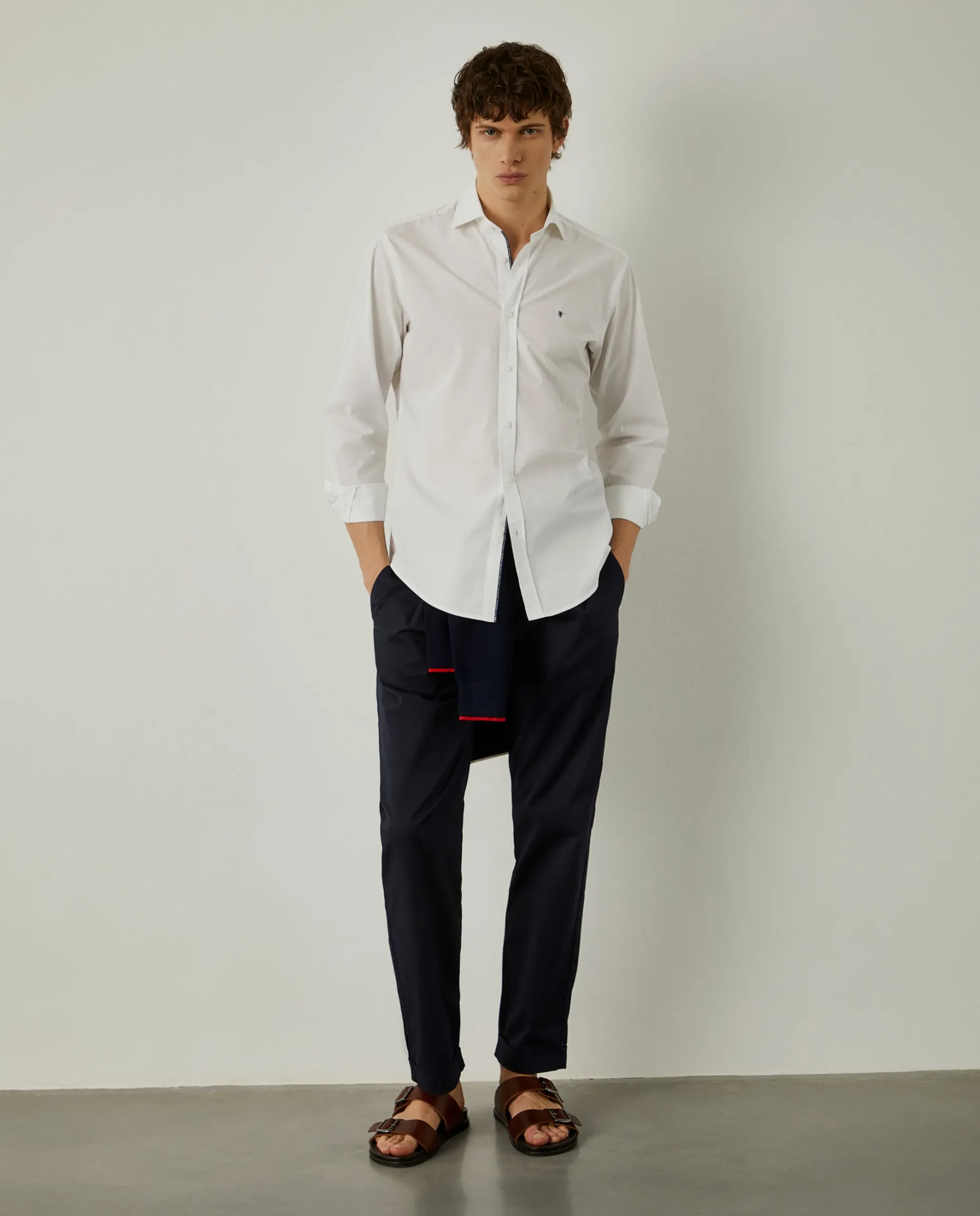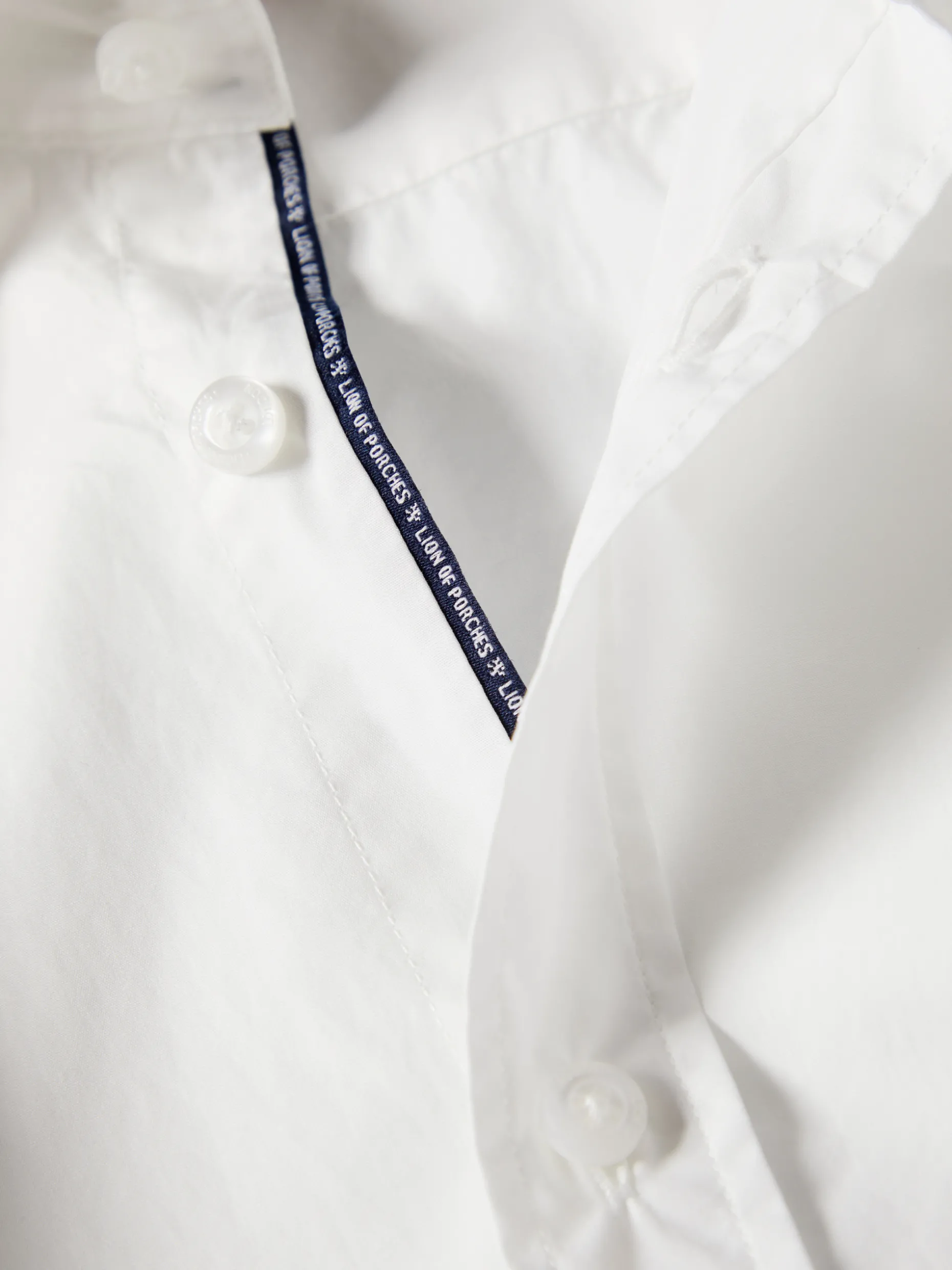 Camisa slim fit, em popelina, com colarinho cutaway. De manga comprida, aperta com botões em contraste de cor na frente, assim como nos punhos. Finaliza com pequeno leão da marca bordado no peito e fita Lion of Porches na carcela interior. É confecionada, na totalidade, em algodão para maior suavidade e conforto.