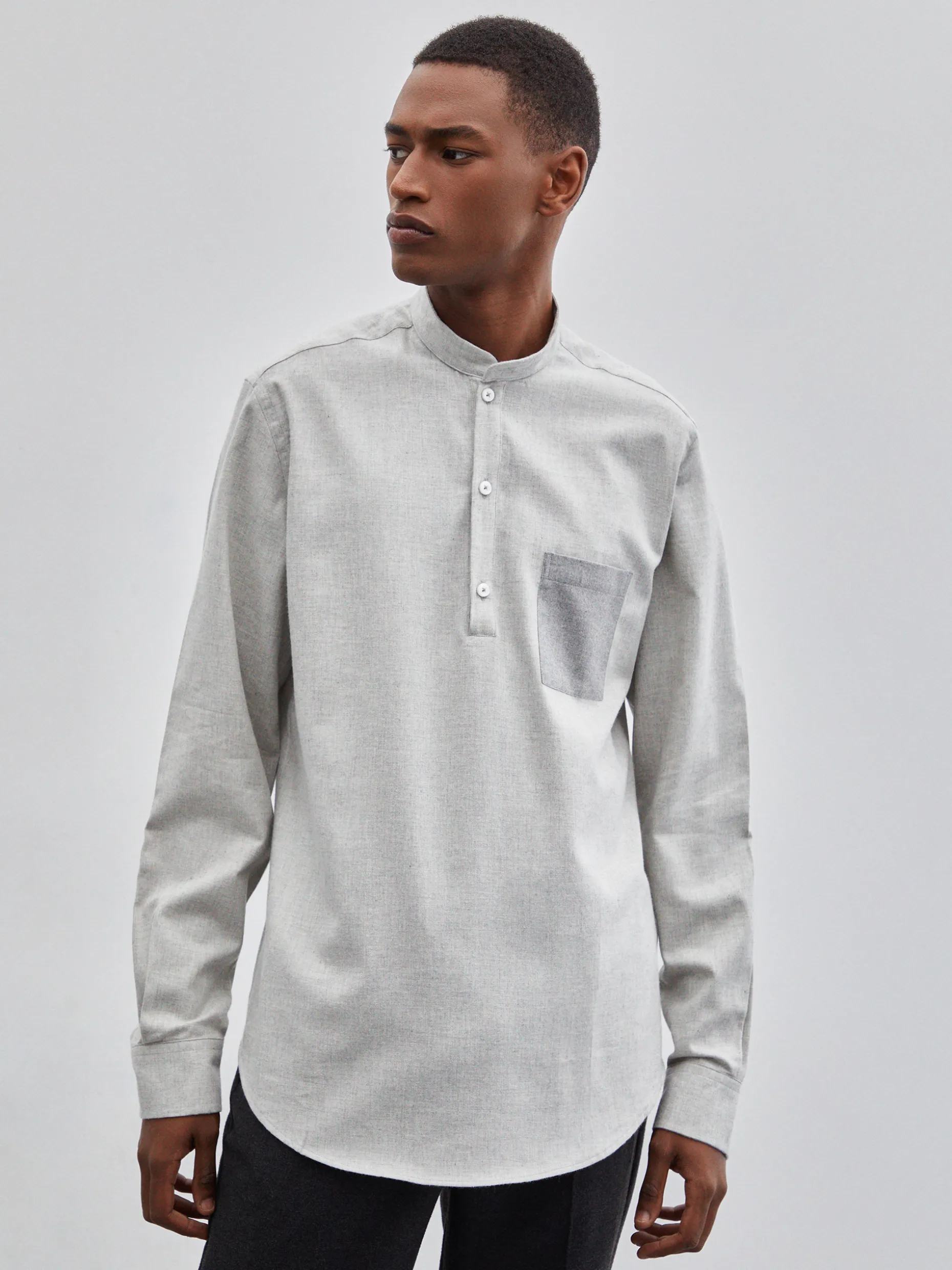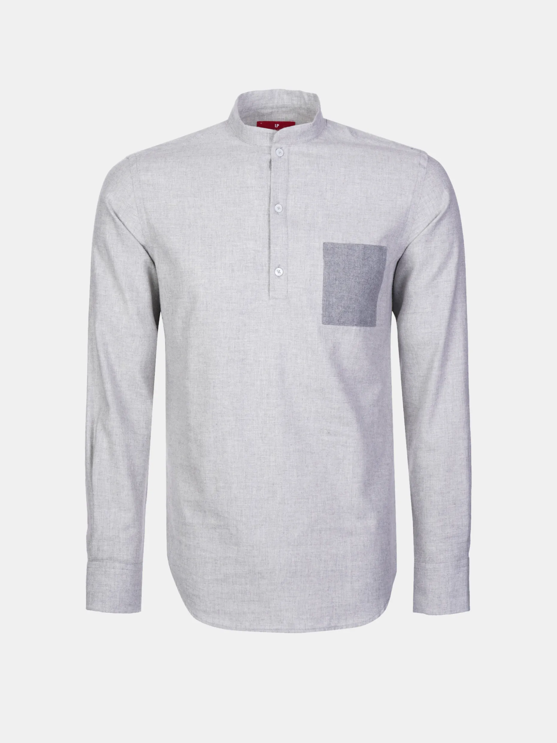 Camisa Slim Fit com gola mao. Carcela de polo. Bolso quadrado em cor contraste no peito. Bordado personalizado na carcela do punho. Botões personalizados.