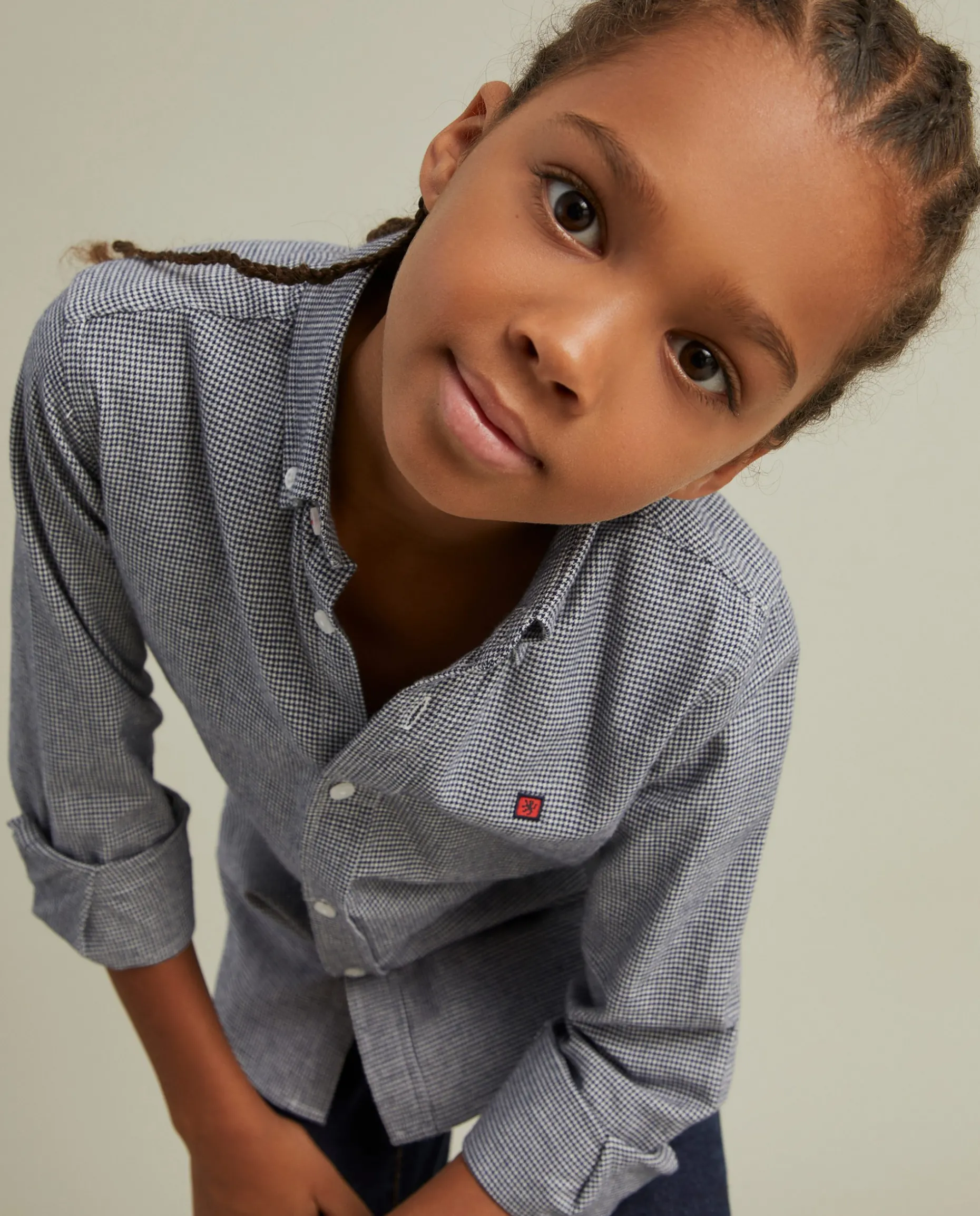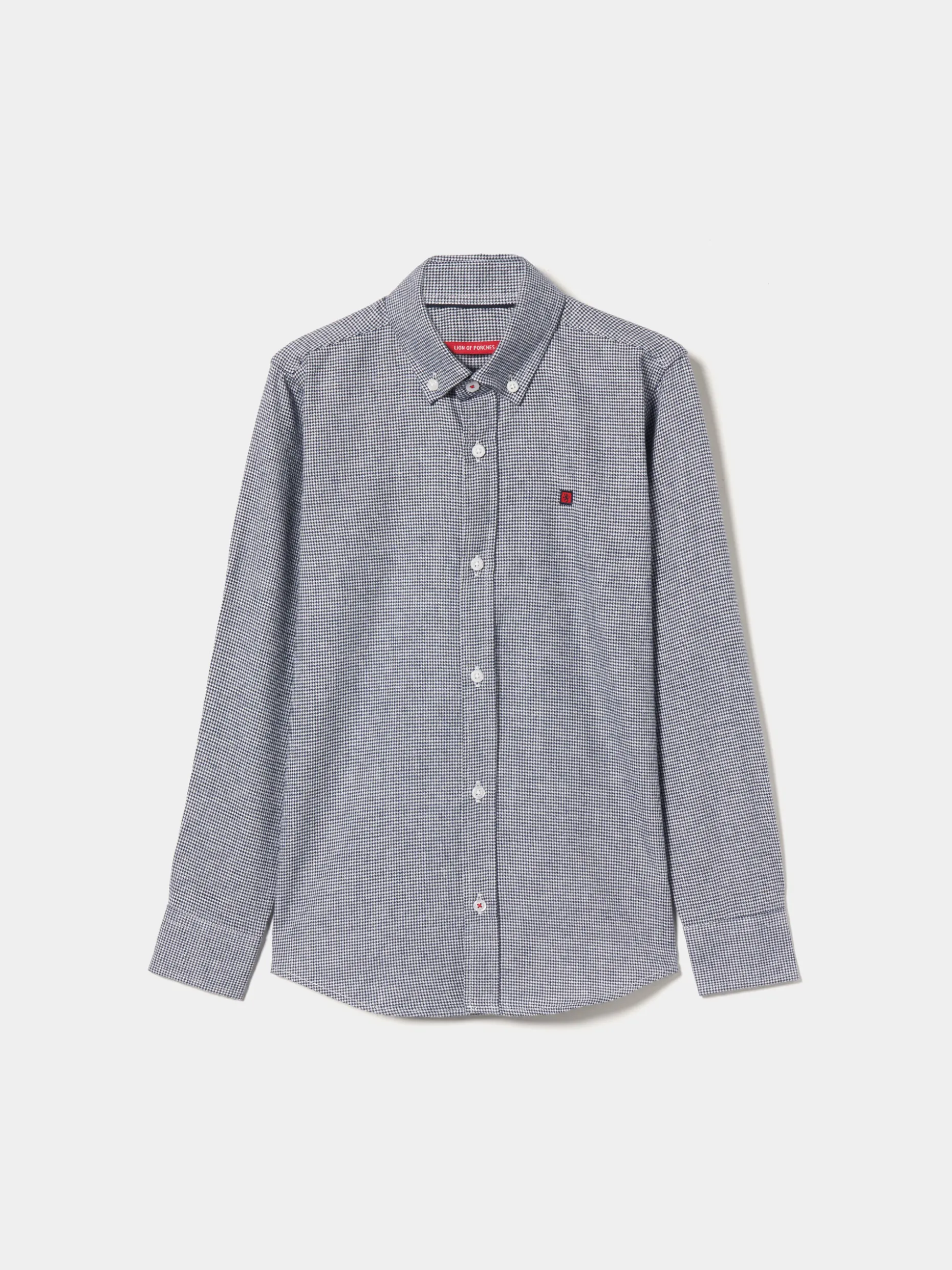 Camisa slim fit manga comprida em pied de poule com etiqueta leão no peito. Vivo em contraste no interior da gola. Primeiro botão e último cosidos em contraste.