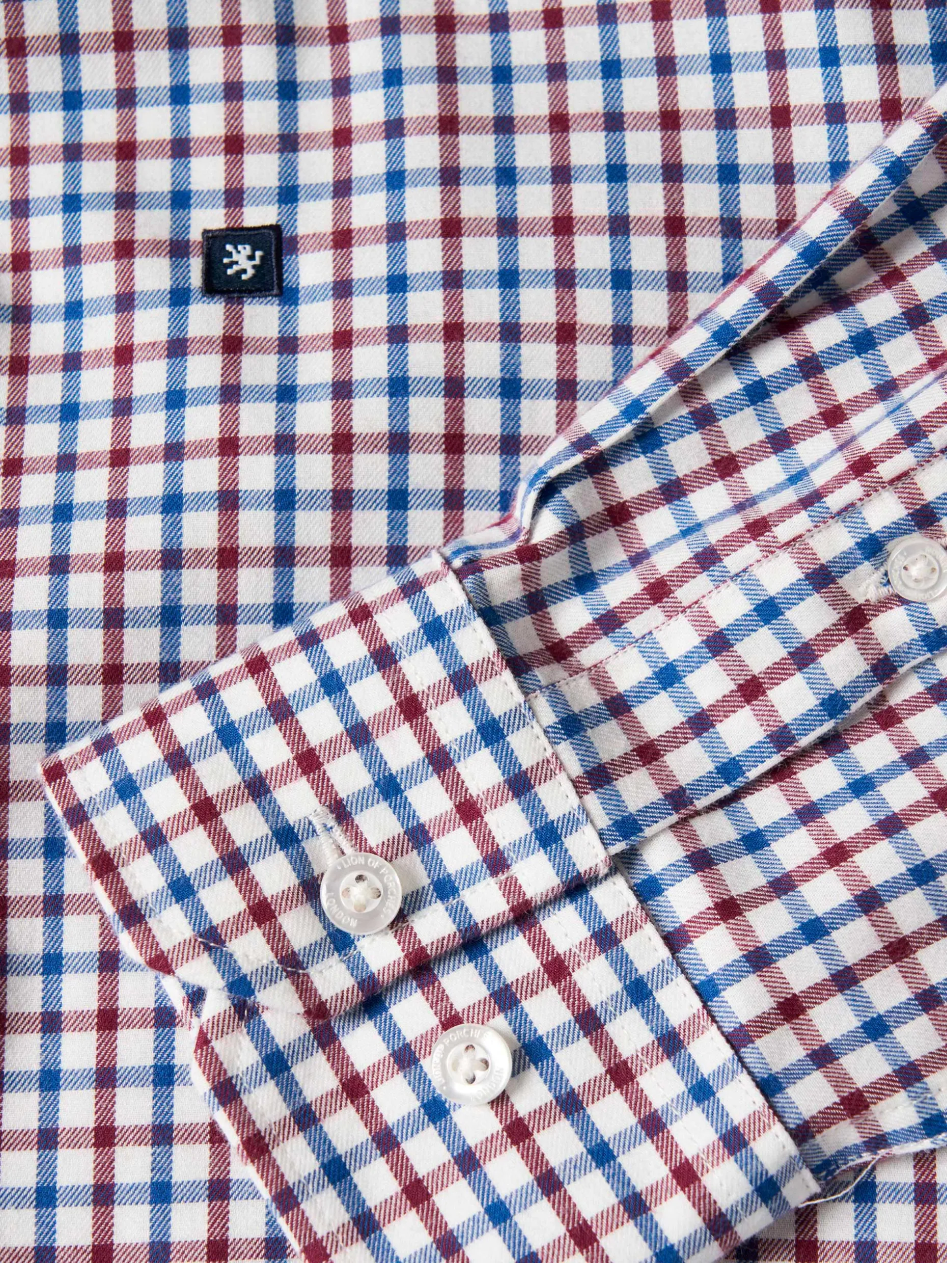 Camisa slim fit, de manga comprida, com padrão de quadrados. Aperta com botões e tem colarinho “cutaway”.