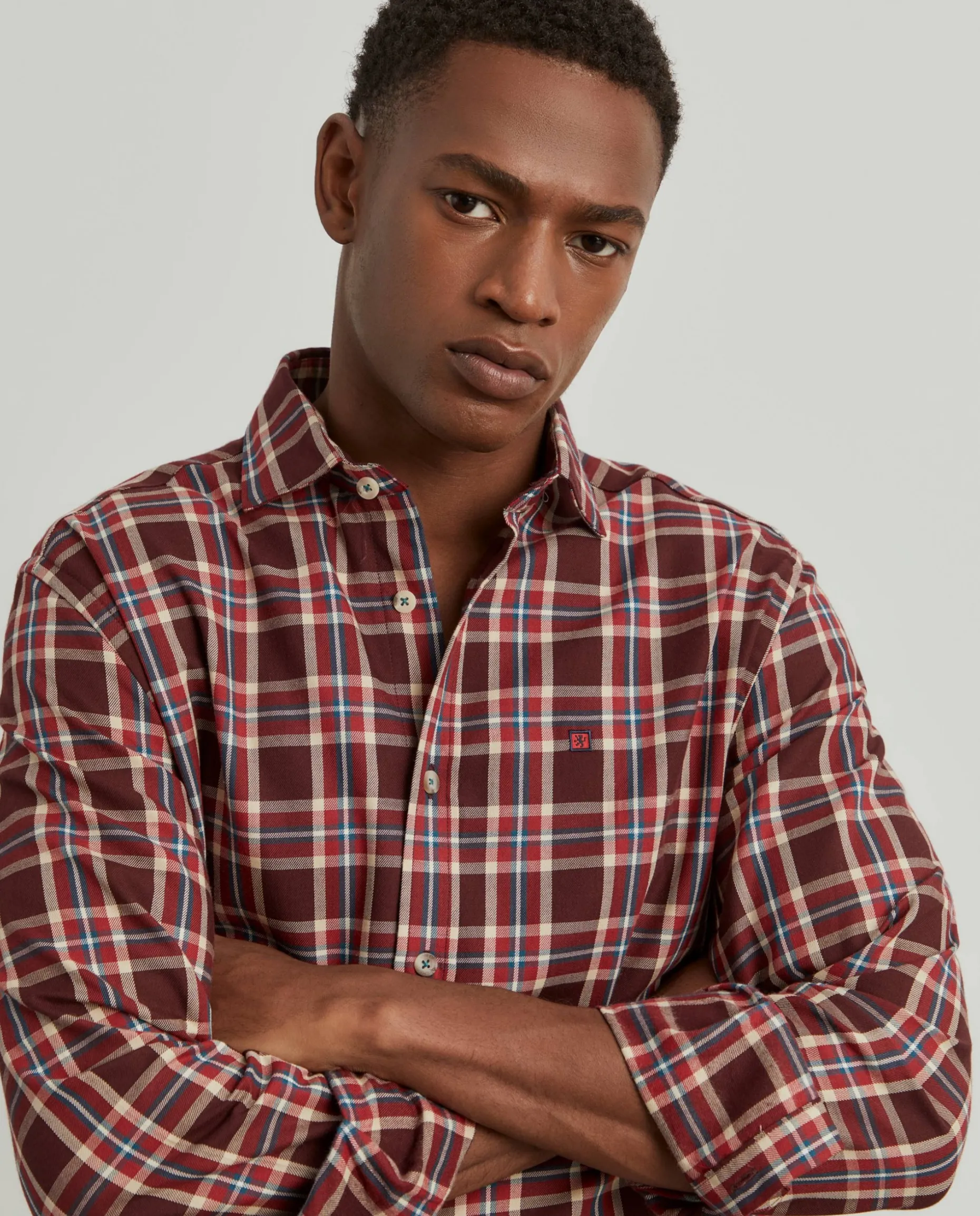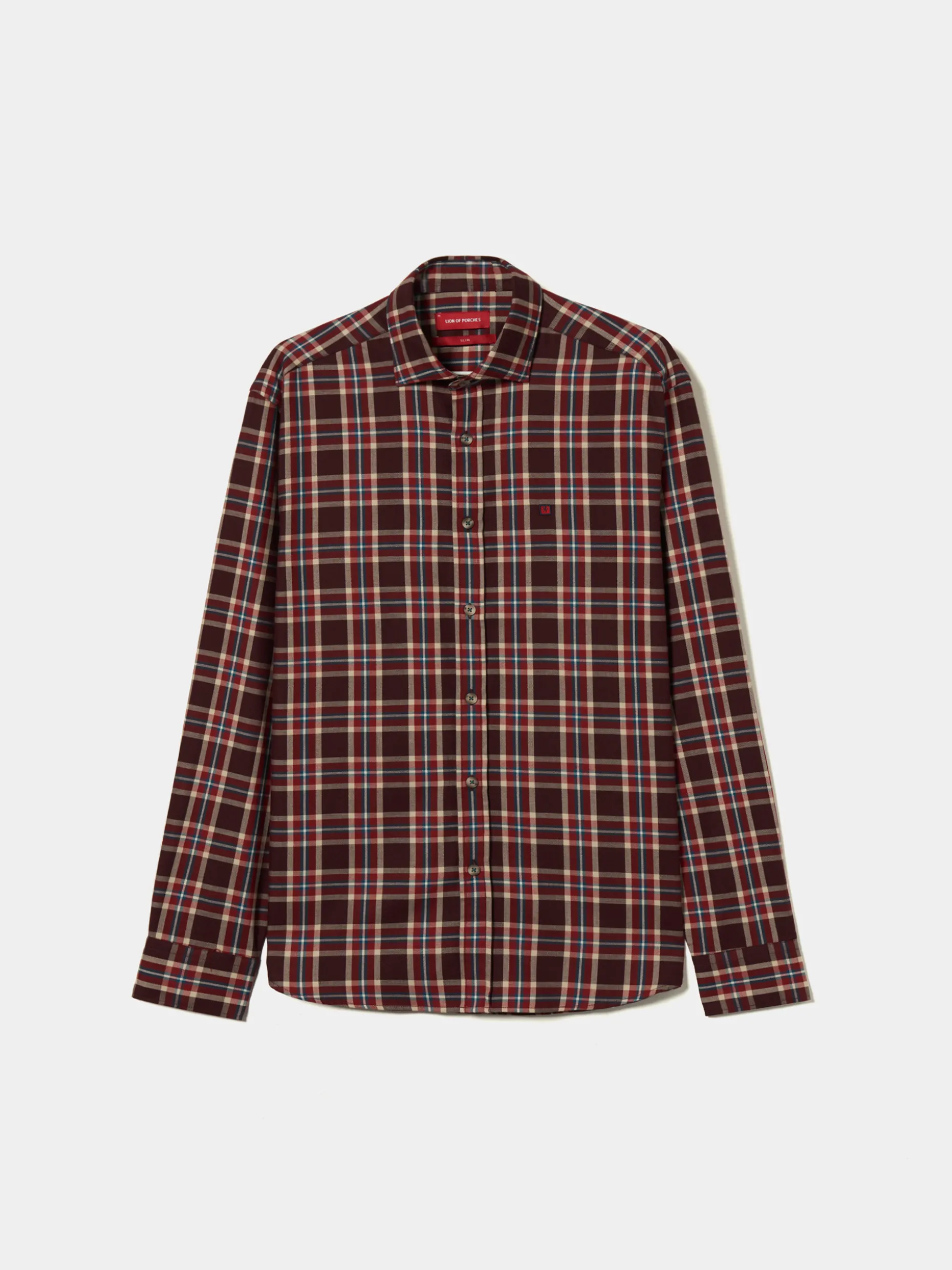 Camisa Slim Fit em tecido com padrão de xadrez. Colarinho “cutaway”. Bordado personalizado no peito. Botões personalizados.