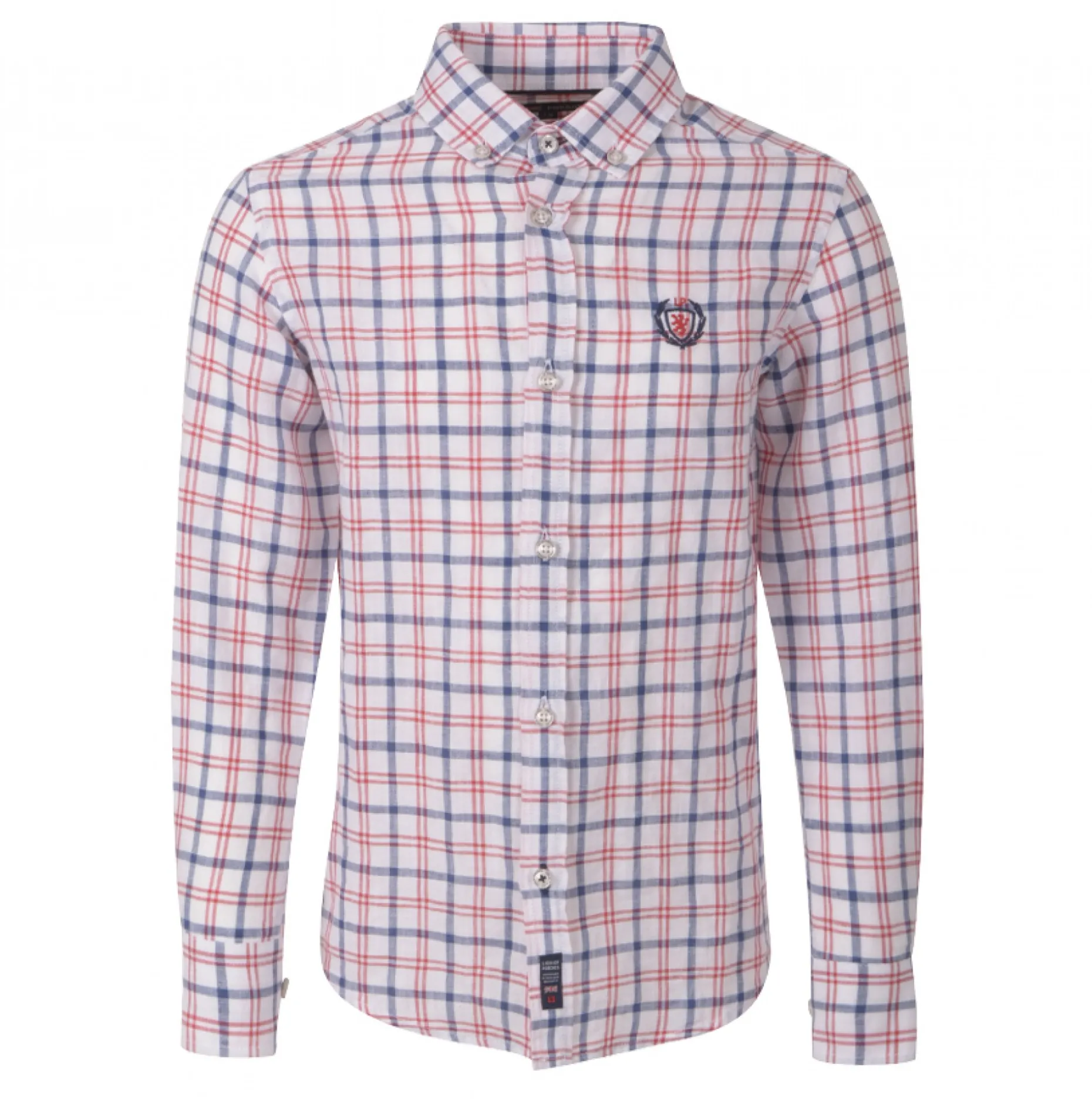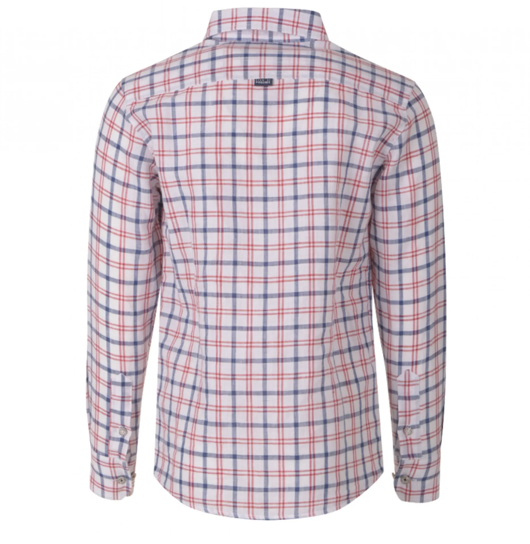 Camisa com padrão axadrezado distinto e desenhado em cores frescas. Logótipo bordado no peito, emblema aplicado na zona inferior da carcela.