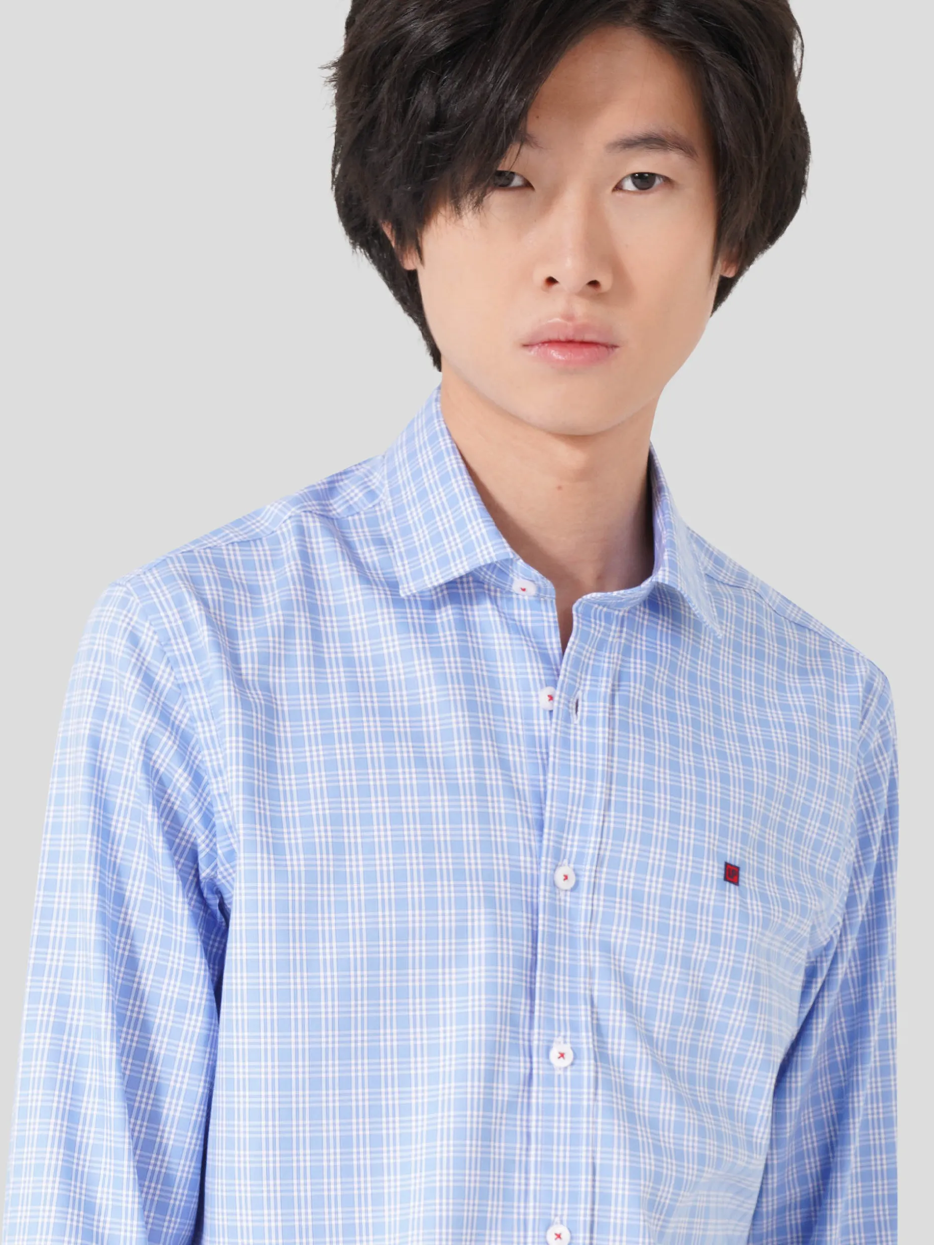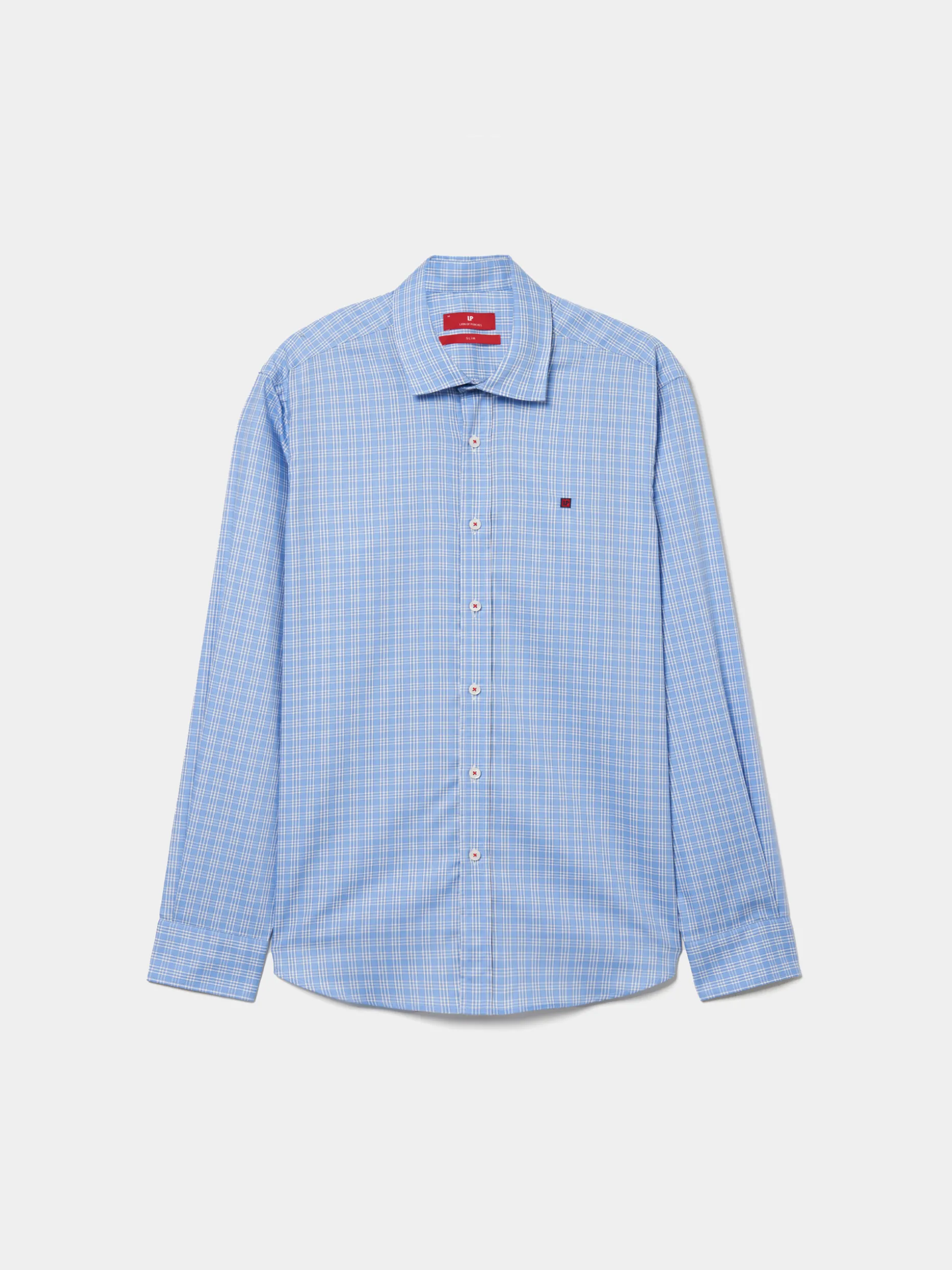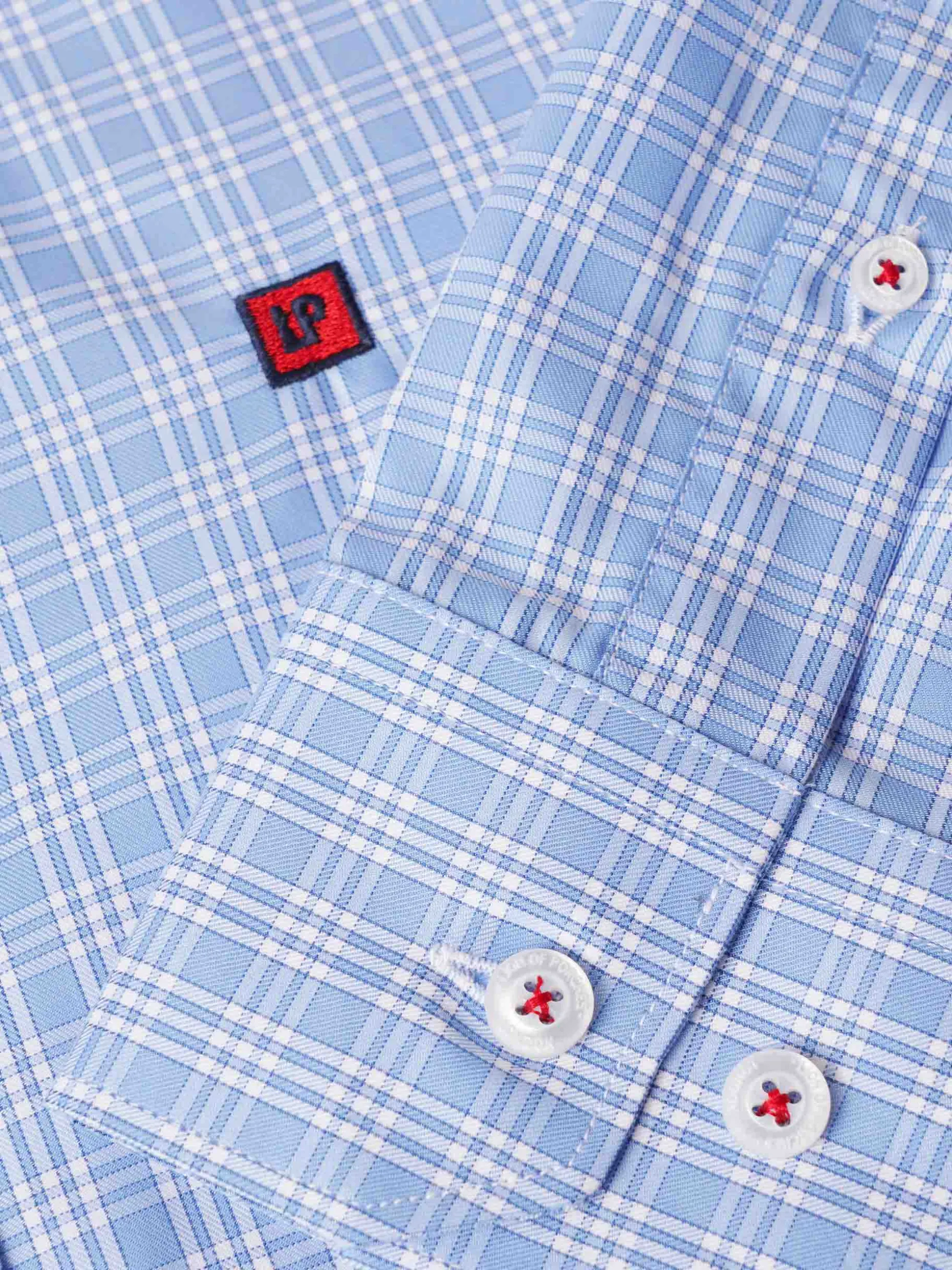 Camisa slim fit em tecido de xadrez. Colarinho com palhetas amovíveis. Personalizada com pequeno bordado quadrado “LP” no peito. Botões personalizados pregados a vermelho.