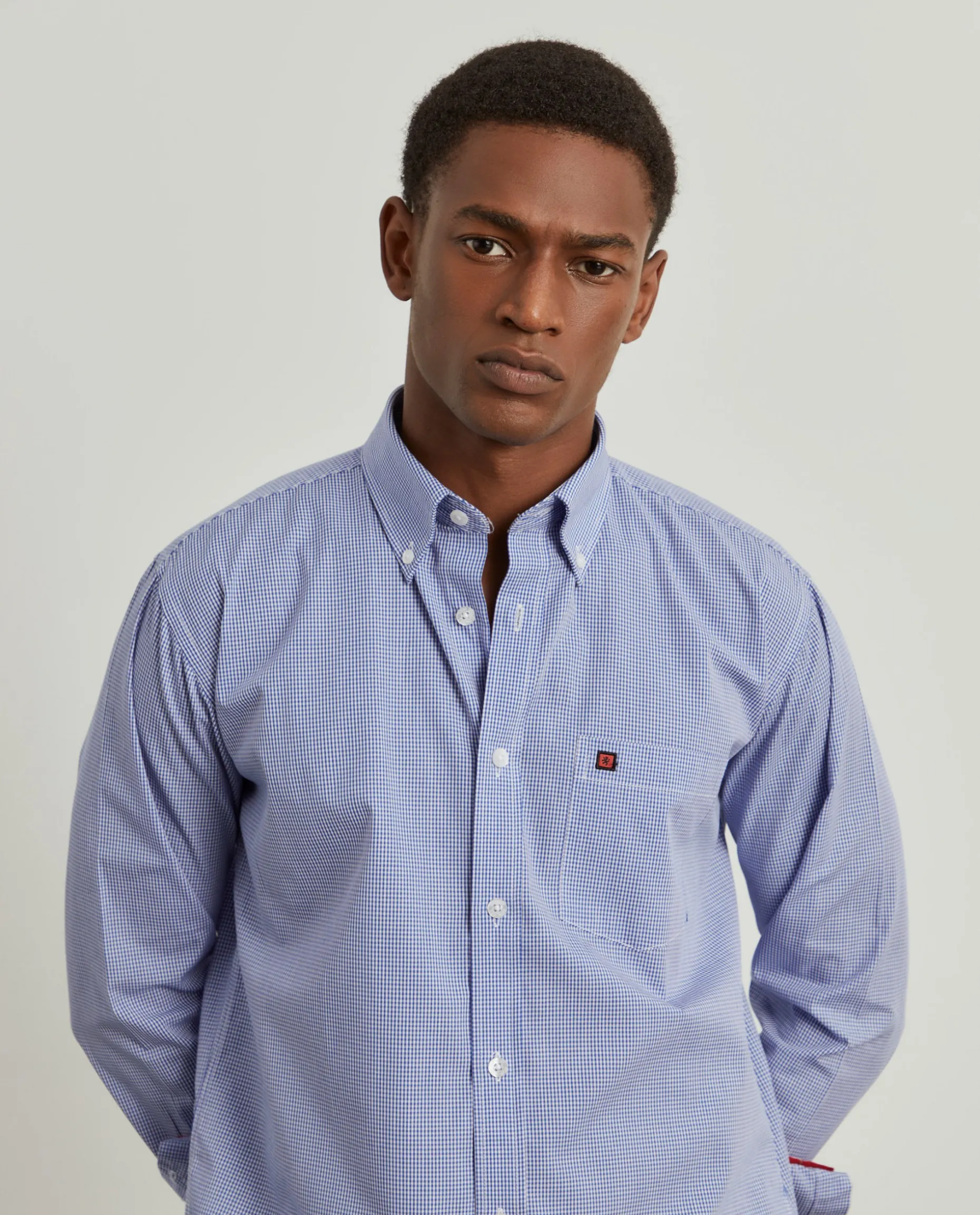Camisa Regular Fit. Colarinho com dois botões. Tecido com padrão xadrez. Bordado personalizado no peito. Botões personalizados. Macho nas costas.