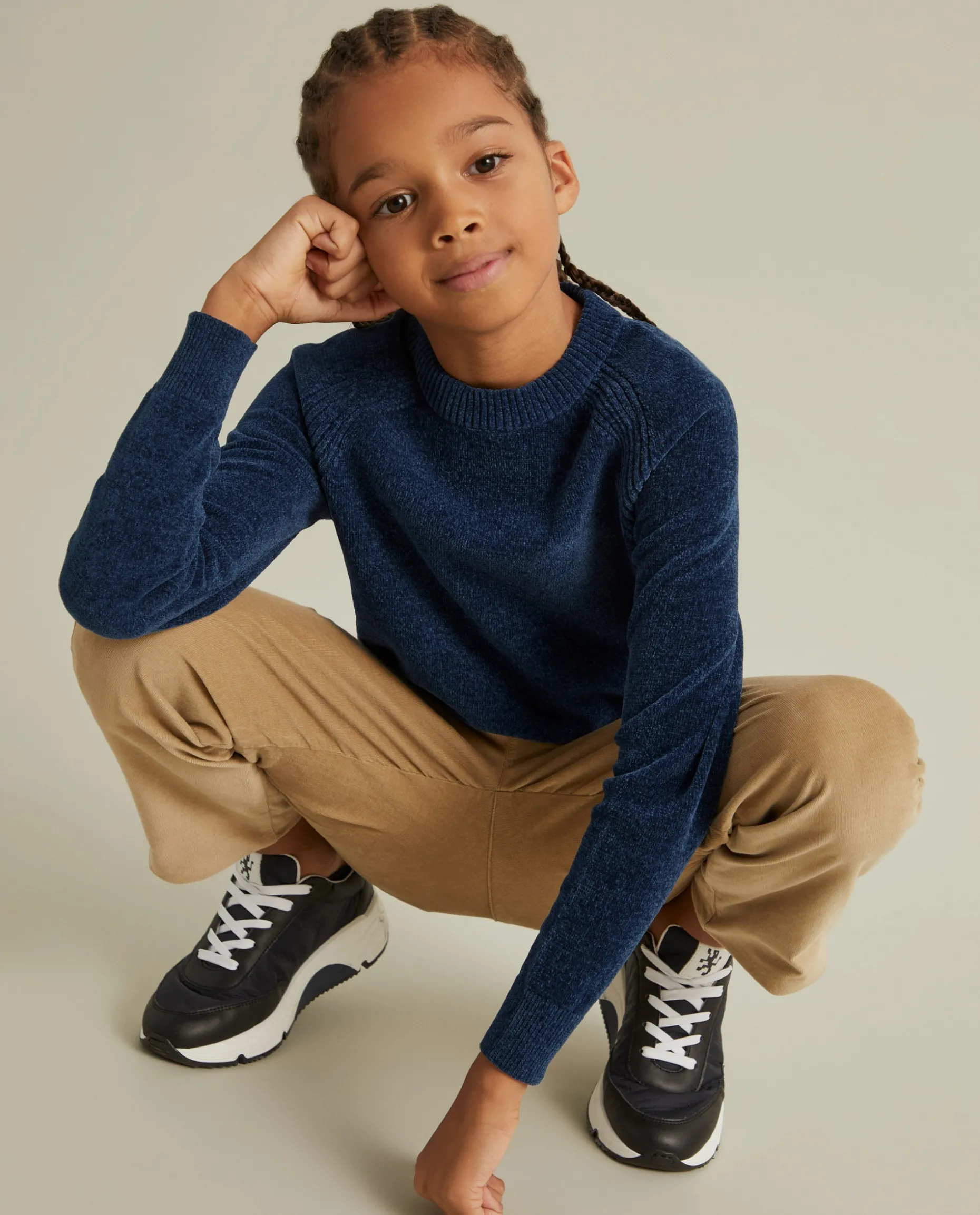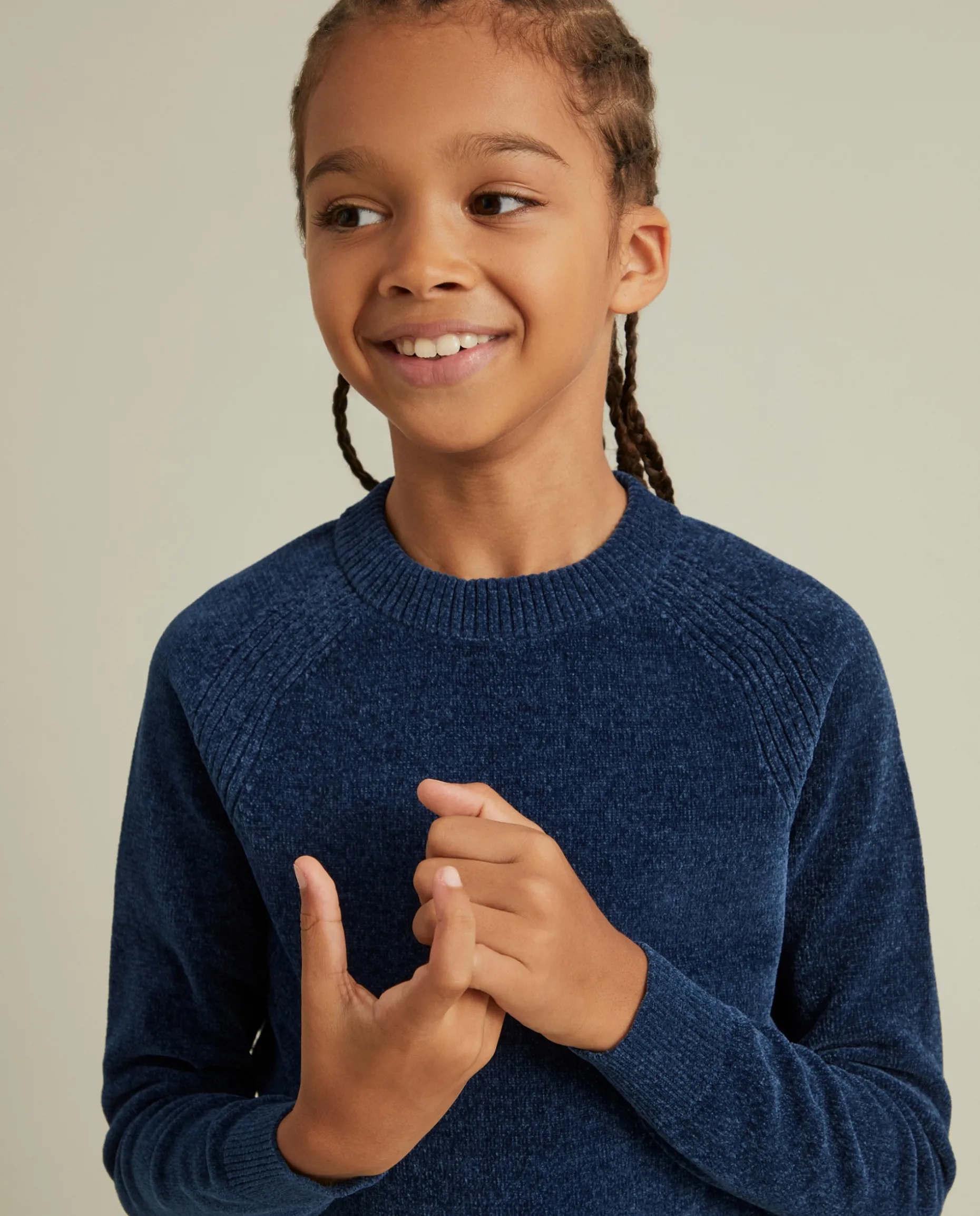 Perfeita para um look quentinho e confortável, esta camisola de malha chenille tem manga comprida e decote redondo. Com pormenor da gola, base e punhos canelados.