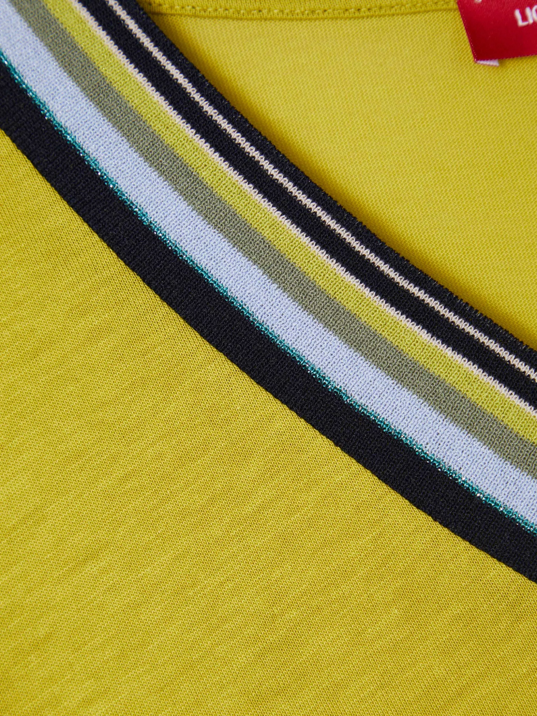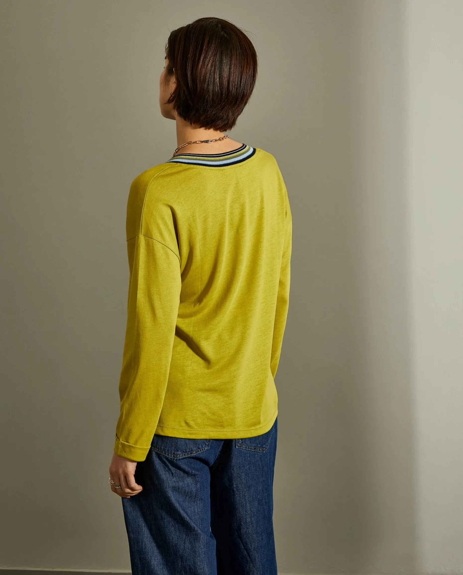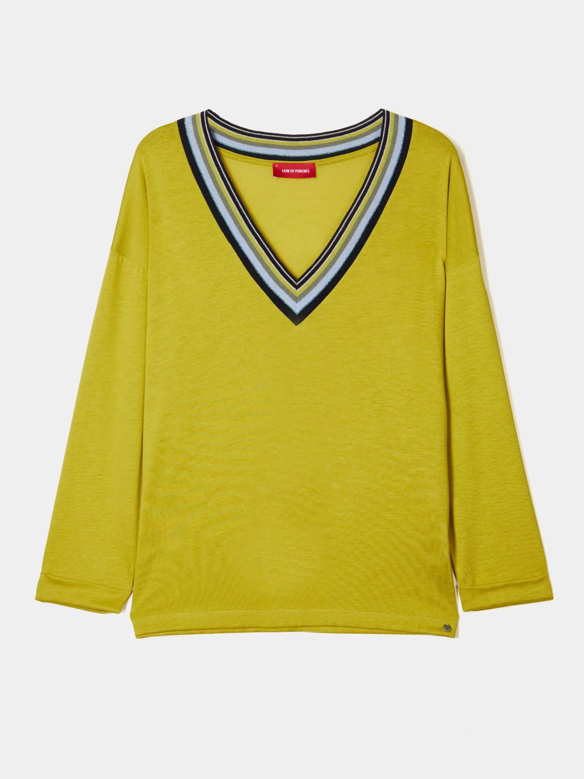 Camisola de manga comprida em malha leve com decote V em rib colorido. Confecionada em mistura de algodão para maior conforto.