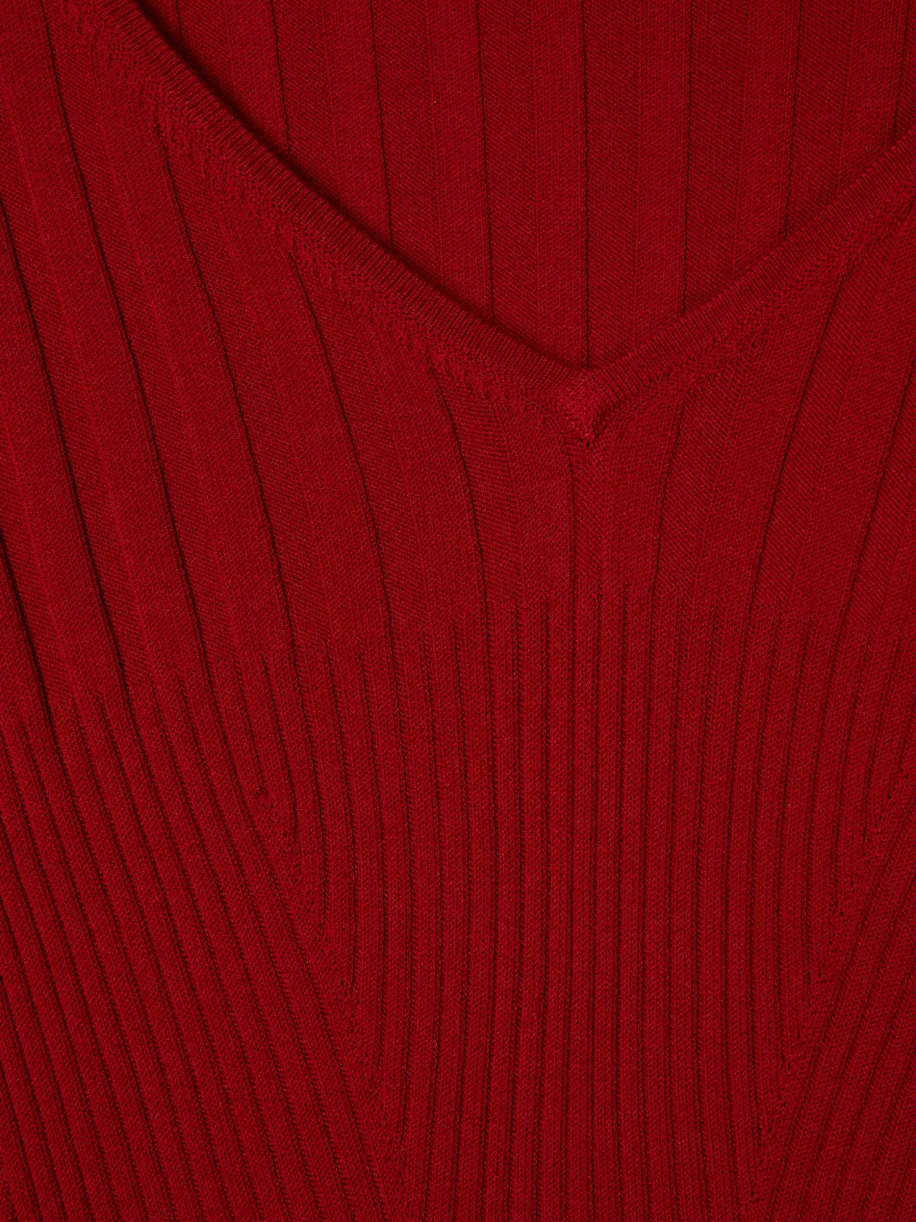 Camisola de malha canelada com decote em V. Manga comprida. Possibilidade de combinar com top e cardigan.