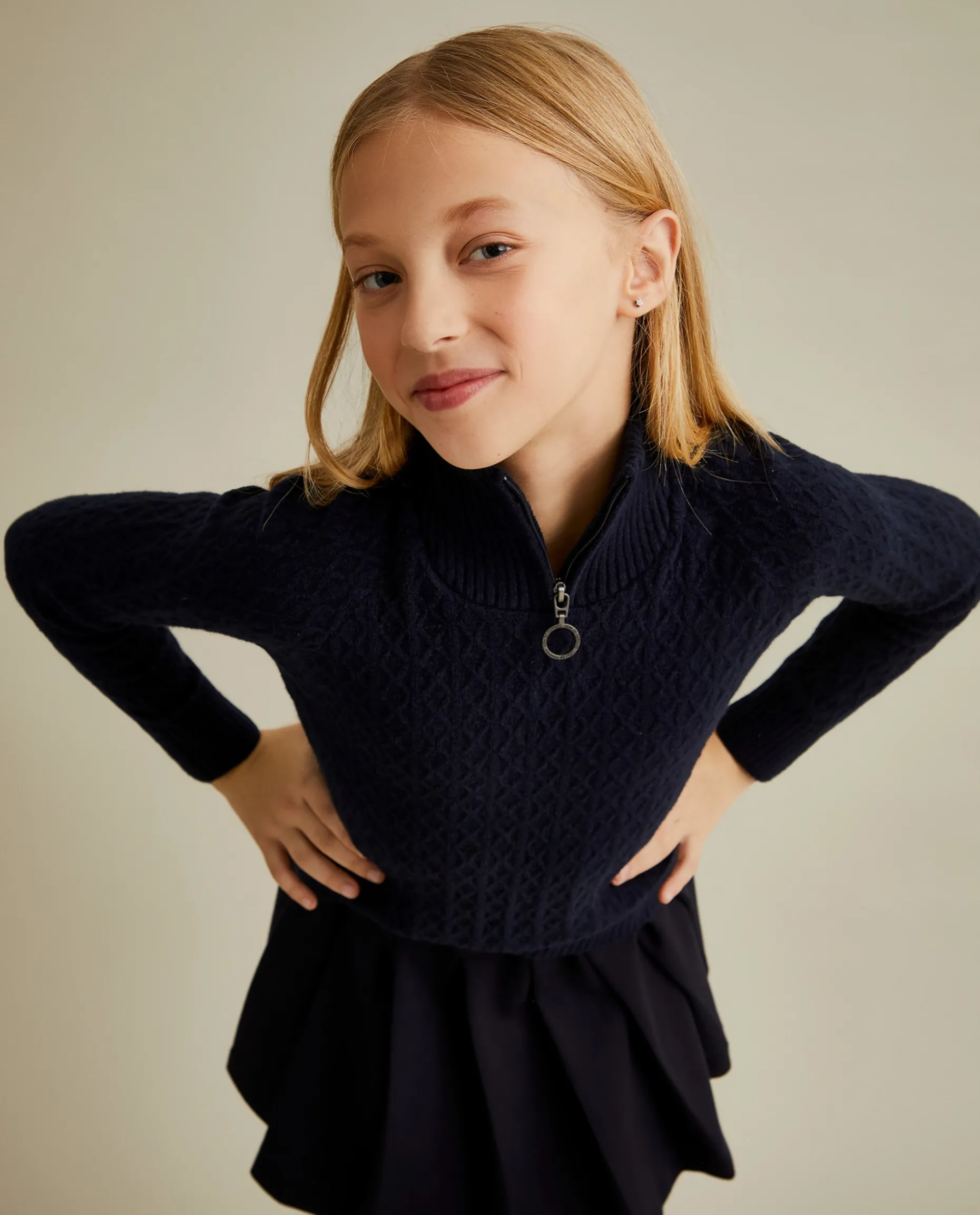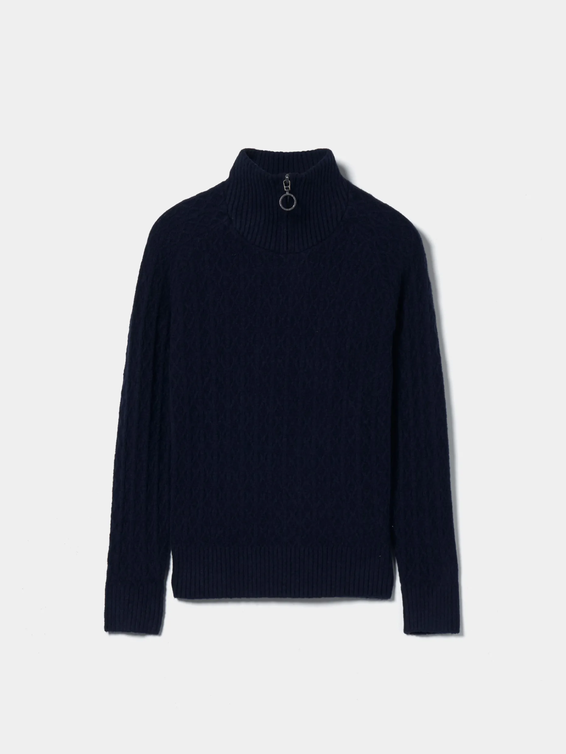 Camisola leve e confortável, perfeita para os dias mais frios. A malha tem textura de bolinhas e finaliza com canelado na base, punhos e gola. De manga comprida, tem gola alta com fecho.