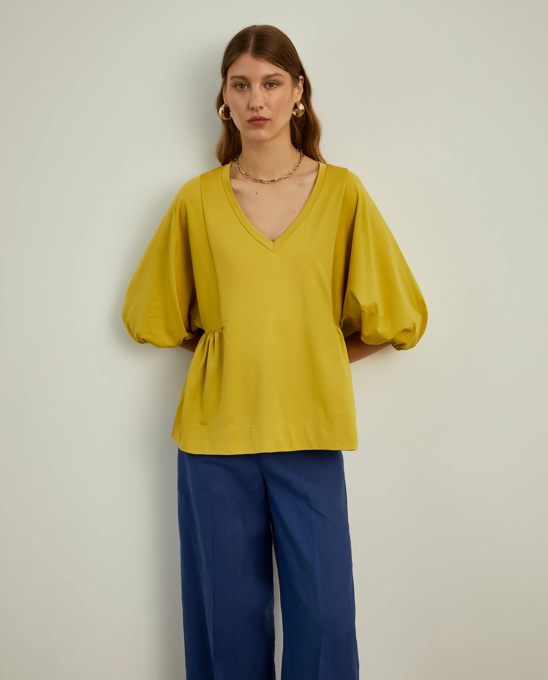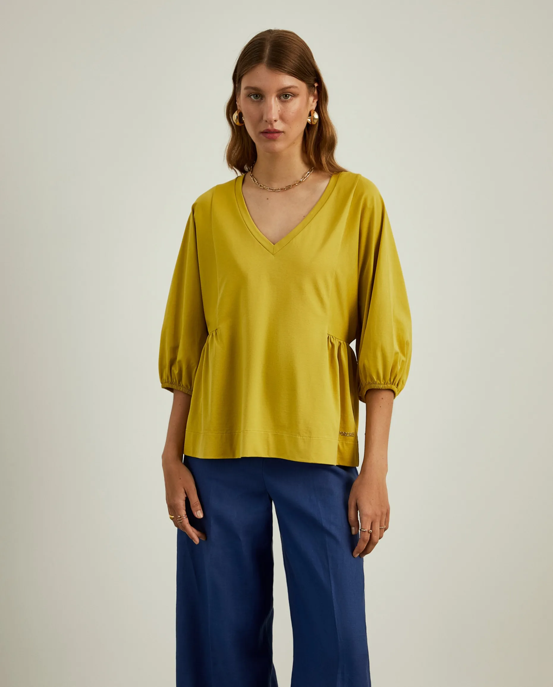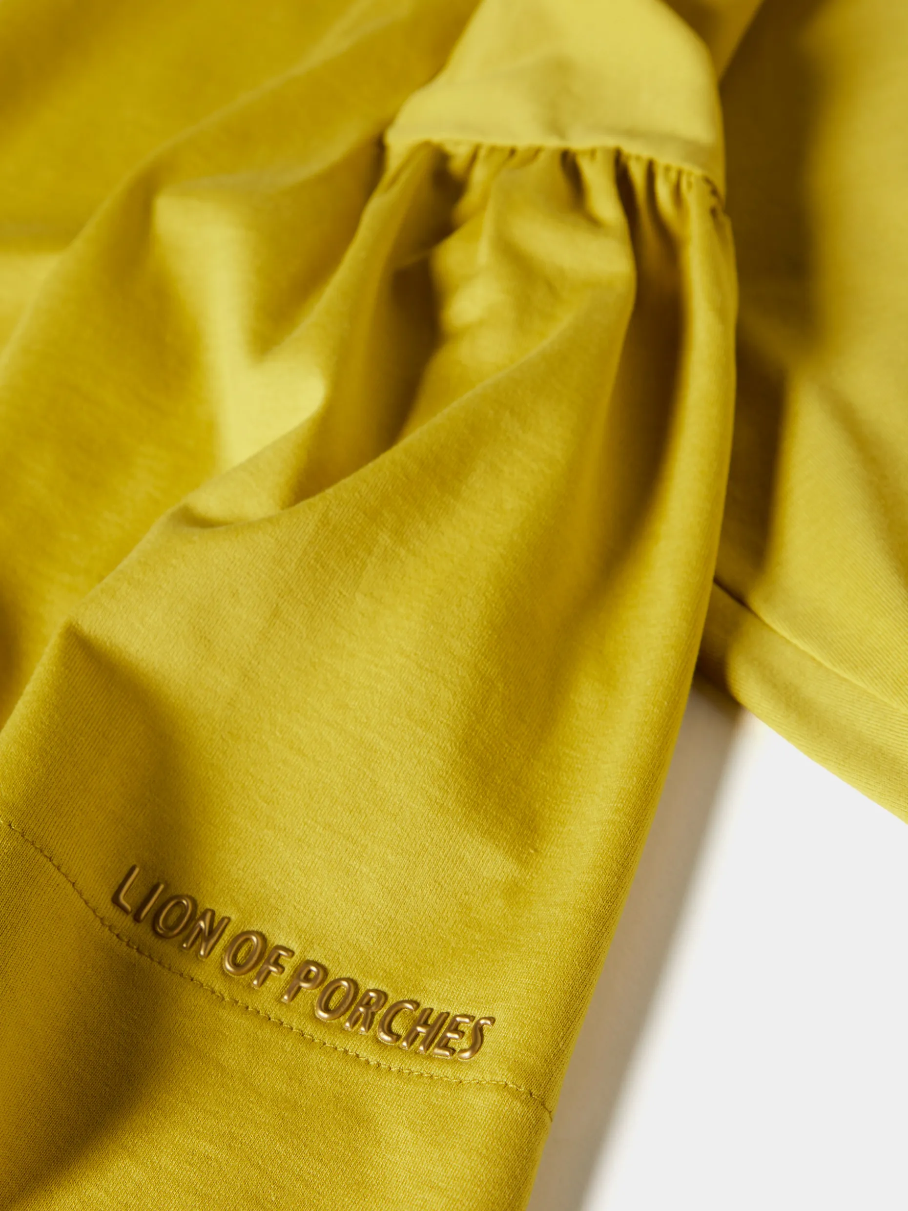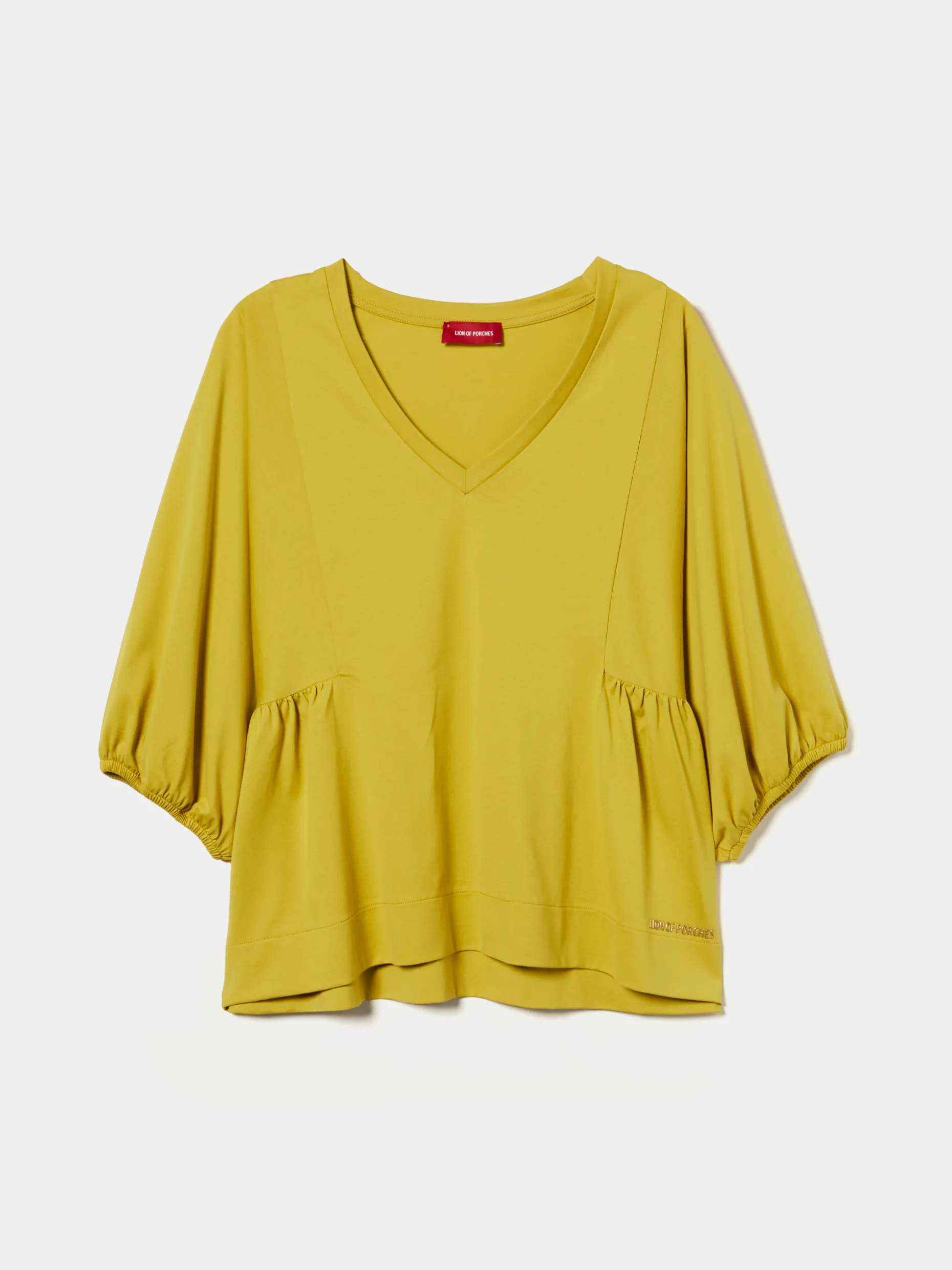 Camisola de fit largo com decote em V. De mangas abalonadas com elástico no punho, finaliza com pregas nas laterais. Pormenor de logotipo Lion of Porches em relevo na base.